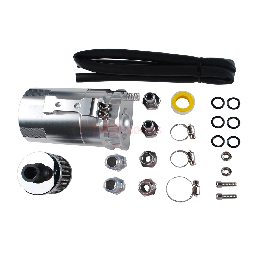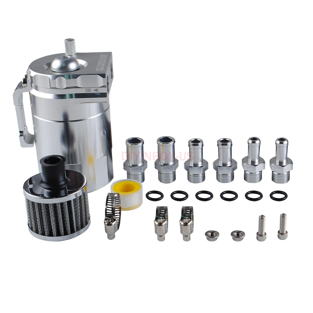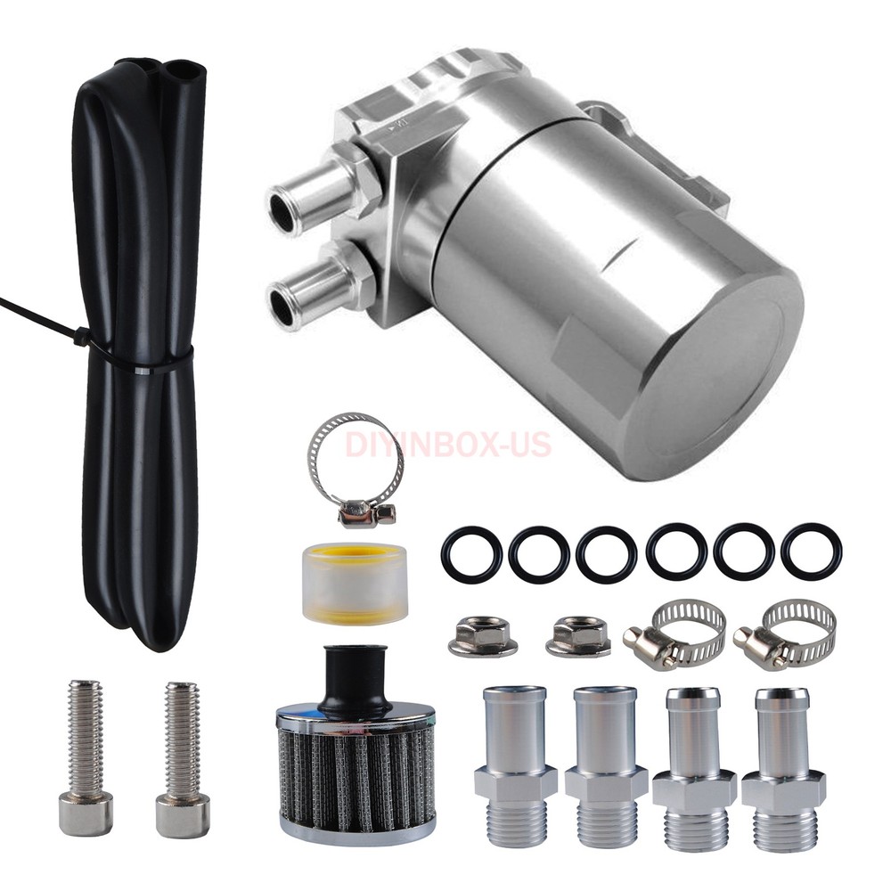 Product Description Oil Catch Can Kit Reservoir Baffled Tank Breather Filter Universal Aluminum Silv Description : 100% Brand New Made with High Quality Aluminum for Enhanced Strength and Durability Color: Silver 5" Height x 3.25" Diameter Anodized Body 3/8" & 9/16" Hose Adapters Removable Baffle that Can Store Additional Filter Media Ensure Better Mileage, Better Performance and Preserve Engine Life Catch Oil and Sludge to Save the Life of the Engine Air Filter to use as Vented System Built In Dipstick To Check Fluid Level Mounting Hardware & Hose Adapters Removable Bottom to Drain Professional Installation is Highly Recommended (No Instruction Included) Package Included: 1 x Oil Catch Tank 2 x 9mm fitting 2 x 15mm fitting 1 x 15mm hose 1 x Breather filter As the picture shown Payment Shipping Return Policy Feedback About us Paypal Preferred. If could not use Paypal, contact me for more instructions. We only ship to your PAYPAL address. If you need to change your address,please change it in PayPal first as we will only ship to your PAYPAL address. Make sure your detail address and full name in PayPal is absolutely correct. A non-payment dispute will be opened if full payment is not received after 14 days of auction. Local pickup NOT available at this time. We process your order within 1 business day upon payment(note: NOT counting holidays or weekends ). Import duties, taxes and charges are not included on the item price or shipping charges. These charges are buyer's responsibility. Package transit time: please expect 6-12 business days , up to 20 business days all around the world. We highly recommend you choose Standard or Expedited shipping to expedite delivery date. Returns are accepted within 30 days of receipt of shipment and with approval. You must contact us by e-mail and we will arrange for a return shipment. The item will need to be returned in the condition in which it was shipped out to you. Buyers pay return shipping. Dear all,customer satisfaction is very important to us and our feedback rating reflects this satisfaction. Please do not leave negative feedback ,if there is any problem,please contact us ,we will do our best to provide the best service! If you are satisfied with the purchase and our service,please take a minute to give us a positive feedback . Please leave us 5 star feedback just as. If you're looking to buy in bulk or other question , please contact me directly. Payment Paypal Preferred. If could not use Paypal, contact me for more instructions. We only ship to your PAYPAL address. If you need to change your address,please change it in PayPal first as we will only ship to your PAYPAL address. Make sure your detail address and full name in PayPal is absolutely correct. A non-payment dispute will be opened if full payment is not received after 14 days of auction. Local pickup NOT available at this time. Shipping We process your order within 1 business day upon payment(note: NOT counting holidays or weekends ). Import duties, taxes and charges are not included on the item price or shipping charges. These charges are buyer's responsibility. Package transit time: please expect 6-12 business days , up to 20 business days all around the world. We highly recommend you choose Standard or Expedited shipping to expedite delivery date. Return Policy Returns are accepted within 30 days of receipt of shipment and with approval. You must contact us by e-mail and we will arrange for a return shipment. The item will need to be returned in the condition in which it was shipped out to you. Buyers pay return shipping. Feedback Dear all,customer satisfaction is very important to us and our feedback rating reflects this satisfaction. Please do not leave negative feedback ,if there is any problem,please contact us ,we will do our best to provide the best service! If you are satisfied with the purchase and our service,please take a minute to give us a positive feedback . Please leave us 5 star feedback just as. About us If you're looking to buy in bulk or other question , please contact me directly. powered by