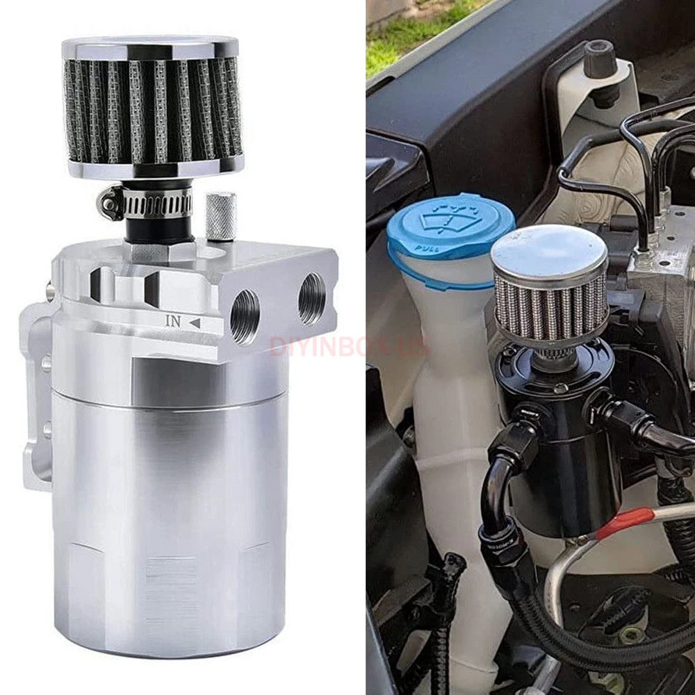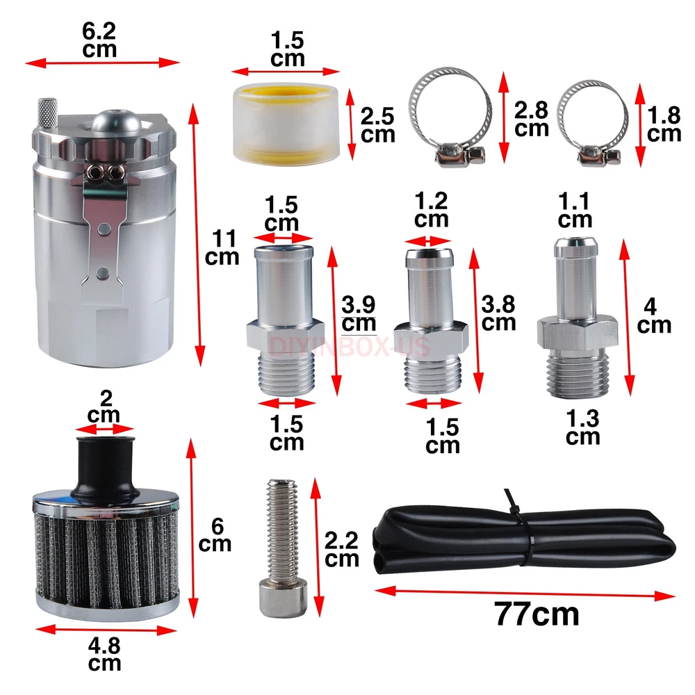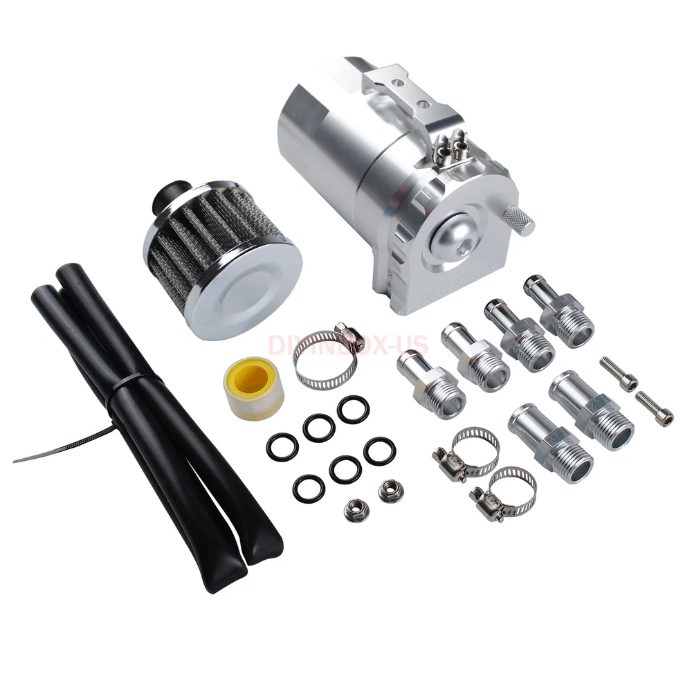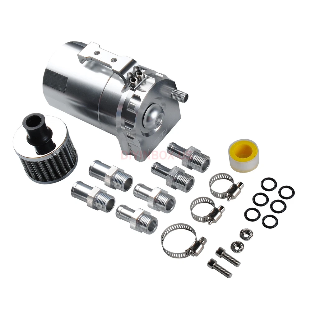 Product Description Oil Catch Can Kit Reservoir Baffled Tank Breather Filter Universal Aluminum Silv Description : 100% Brand New Made with High Quality Aluminum for Enhanced Strength and Durability Color: Silver 5" Height x 3.25" Diameter Anodized Body 3/8" & 9/16" Hose Adapters Removable Baffle that Can Store Additional Filter Media Ensure Better Mileage, Better Performance and Preserve Engine Life Catch Oil and Sludge to Save the Life of the Engine Air Filter to use as Vented System Built In Dipstick To Check Fluid Level Mounting Hardware & Hose Adapters Removable Bottom to Drain Professional Installation is Highly Recommended (No Instruction Included) Package Included: 1 x Oil Catch Tank 2 x 9mm fitting 2 x 15mm fitting 1 x 15mm hose 1 x Breather filter As the picture shown Payment Shipping Return Policy Feedback About us Paypal Preferred. If could not use Paypal, contact me for more instructions. We only ship to your PAYPAL address. If you need to change your address,please change it in PayPal first as we will only ship to your PAYPAL address. Make sure your detail address and full name in PayPal is absolutely correct. A non-payment dispute will be opened if full payment is not received after 14 days of auction. Local pickup NOT available at this time. We process your order within 1 business day upon payment(note: NOT counting holidays or weekends ). Import duties, taxes and charges are not included on the item price or shipping charges. These charges are buyer's responsibility. Package transit time: please expect 6-12 business days , up to 20 business days all around the world. We highly recommend you choose Standard or Expedited shipping to expedite delivery date. Returns are accepted within 30 days of receipt of shipment and with approval. You must contact us by e-mail and we will arrange for a return shipment. The item will need to be returned in the condition in which it was shipped out to you. Buyers pay return shipping. Dear all,customer satisfaction is very important to us and our feedback rating reflects this satisfaction. Please do not leave negative feedback ,if there is any problem,please contact us ,we will do our best to provide the best service! If you are satisfied with the purchase and our service,please take a minute to give us a positive feedback . Please leave us 5 star feedback just as. If you're looking to buy in bulk or other question , please contact me directly. Payment Paypal Preferred. If could not use Paypal, contact me for more instructions. We only ship to your PAYPAL address. If you need to change your address,please change it in PayPal first as we will only ship to your PAYPAL address. Make sure your detail address and full name in PayPal is absolutely correct. A non-payment dispute will be opened if full payment is not received after 14 days of auction. Local pickup NOT available at this time. Shipping We process your order within 1 business day upon payment(note: NOT counting holidays or weekends ). Import duties, taxes and charges are not included on the item price or shipping charges. These charges are buyer's responsibility. Package transit time: please expect 6-12 business days , up to 20 business days all around the world. We highly recommend you choose Standard or Expedited shipping to expedite delivery date. Return Policy Returns are accepted within 30 days of receipt of shipment and with approval. You must contact us by e-mail and we will arrange for a return shipment. The item will need to be returned in the condition in which it was shipped out to you. Buyers pay return shipping. Feedback Dear all,customer satisfaction is very important to us and our feedback rating reflects this satisfaction. Please do not leave negative feedback ,if there is any problem,please contact us ,we will do our best to provide the best service! If you are satisfied with the purchase and our service,please take a minute to give us a positive feedback . Please leave us 5 star feedback just as. About us If you're looking to buy in bulk or other question , please contact me directly. powered by
