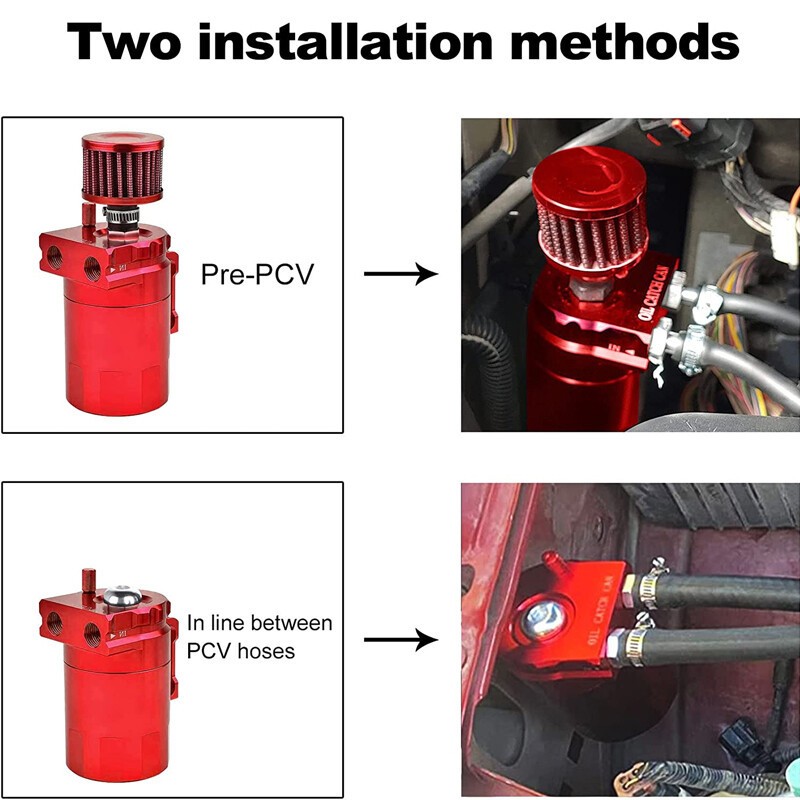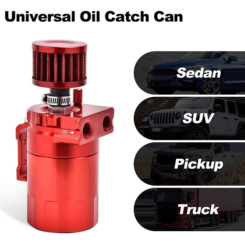 Oil Catch Kit for Reservoir Baffled Tank W/ Breather Filter Universal Aluminum 🛢️ Universal Oil Catch Can Kit – 400ML Polish Baffled Reservoir 🛢️ ✨ Key Features Universal Fit : Compatible with most cars and small motorcycles, making it a versatile addition to various vehicles. 400ML Capacity : The polished baffled reservoir holds 400ml of fluid, sufficient for daily use and reducing the need for frequent emptying. High-Quality Construction : Made from lightweight aluminum with an anodized finish—strong, durable, and visually appealing. Note: Aluminum is prone to scratches, but this does not affect functionality. Engine Protection : Collects oil vapor and moisture from the crankcase, preventing them from entering the intake system. Reduces secondary combustion, carbon buildup, and keeps the engine cleaner, extending its lifespan. Upgraded Design : Baffle system cools hot oil vapor, converting it to liquid for efficient collection. Hose clamps prevent disconnections; 3 adapter sizes (with O-ring gaskets) ensure a leak-free fit for different hose diameters. Built-in dipstick allows easy fluid level checks without opening the can. Includes a breather filter for vented installation options. Flexible Installation : Choose between two setups—use with the breather filter as a vented system or without as a sealed can, depending on your vehicle’s needs. 📋 Specifications Material : Lightweight aluminum. Volume : 400ml. Color : Red (anodized finish). Included Hardware : 3/8" fuel line, breather filter, hose clamps, adapters with O-rings, and mounting components. 🔧 Installation Overview Remove the engine cover (if applicable). Disconnect the existing crankcase ventilation hose and set it aside. Prepare the oil catch can: wrap anti-skid tape on screw threads, attach screws to the can. Mount the can using brackets (use your own nuts/bolts) in a suitable location. Cut a new hose to length, attach it to the can and engine ports, securing with clamps. Detailed steps may vary by vehicle—basic tools required. 📦 Package Includes 1 × Complete Oil Catch Can Tank Kit (includes reservoir, breather filter, hoses, clamps, adapters, and mounting hardware). 💡 Benefits Reduces Carbon Deposits : Prevents oil vapor from recirculating into the engine, keeping intake valves and pistons clean. Improves Efficiency : Maintains optimal air-fuel mixture by reducing oil contamination in the intake system. Easy Maintenance : Dipstick allows quick checks; simple to empty and clean when needed. 📝 Important Notes Scratch Notice : Aluminum construction may show scratches, but this does not impact performance. Contact the seller with concerns. Support : Reach out first with any issues for prompt resolution. Avoid neutral/negative feedback before seeking assistance—solutions will be provided. Protect your engine and enhance performance with this reliable oil catch can kit—order today! 🔧