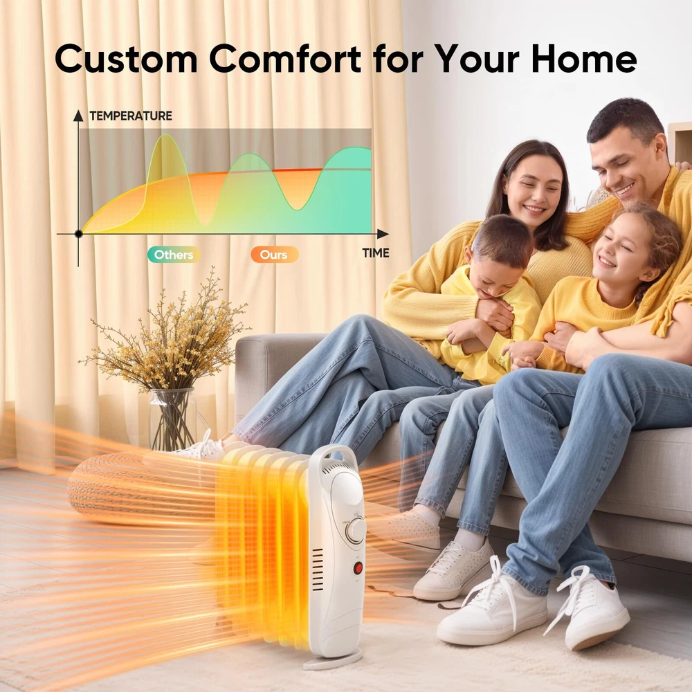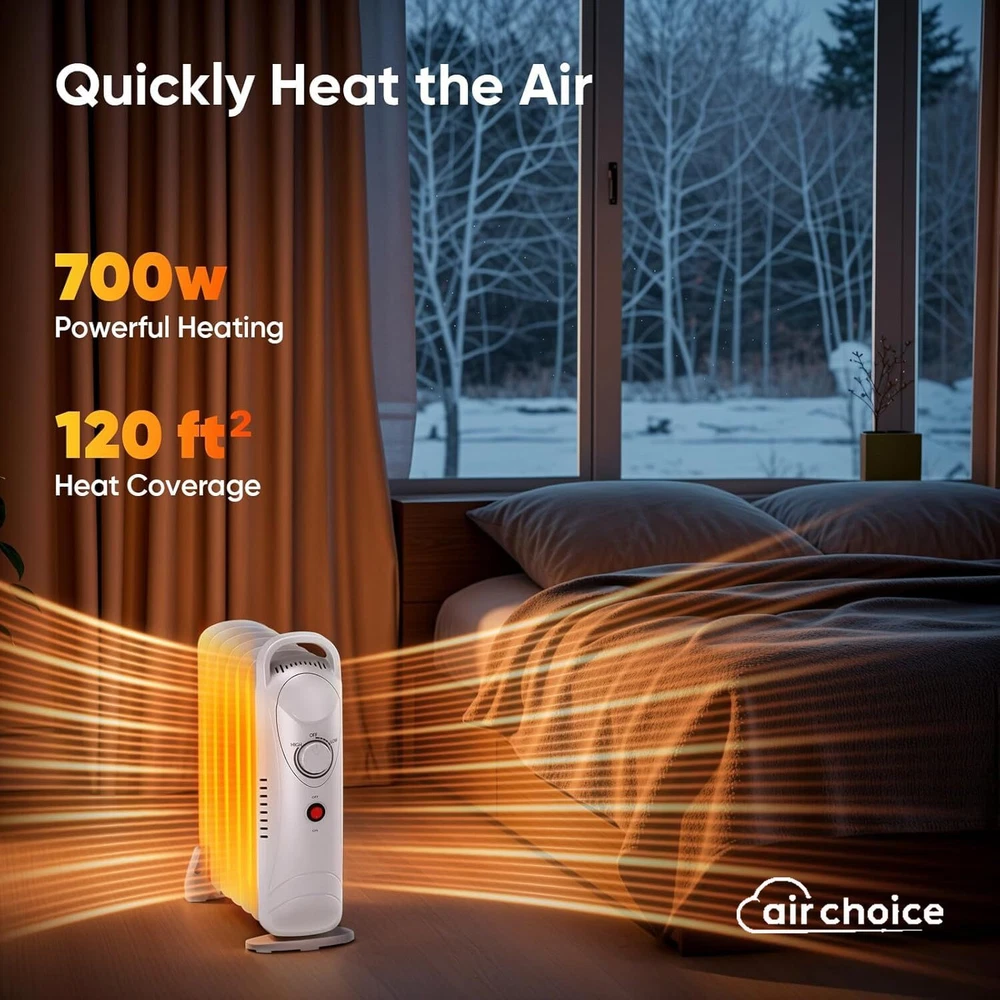 Efficient Heating & Energy Saving: The 700W oil heater quickly heats the air in a 120 sq. ft. room, keeping it warm and cozy; with high and low heat settings and special temperature sensors, it maintains a constant temperature, ideal for the elderly and children High-Guards Your Home: This heater features overheating protection; when the internal temperature exceeds 105 degrees, it automatically powers off; worry-free design lets you leave it on safely during sleep or leisure; ideal for indoor use in offices and bedrooms Durable and Sturdy Heater: The oil filled radiator heater uses special oil that doesn’t need replacing, saving time; made from solid steel, it’s built to last even in harsh cold weather; choosing this mini heater ensures reliable warmth all winter long without frequent maintenance Quiet Operation: The portable space heater operates silently by heating oil rather than using a fan; it doesn’t emit light or noise, providing continuous warmth and a comfortable environment; perfect for sleep, work, meditation, or study, creating a peaceful personal space Compact and Portable: Measuring 12.4"L x 5.4"W x 15.1"H, this personal heater is easy to move; its widened bottom ensures stability; whether at home or work, this portable heater can be placed anywhere, making it a versatile choice for your home, apartment, or office