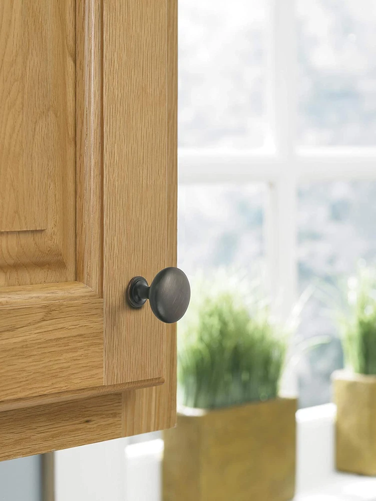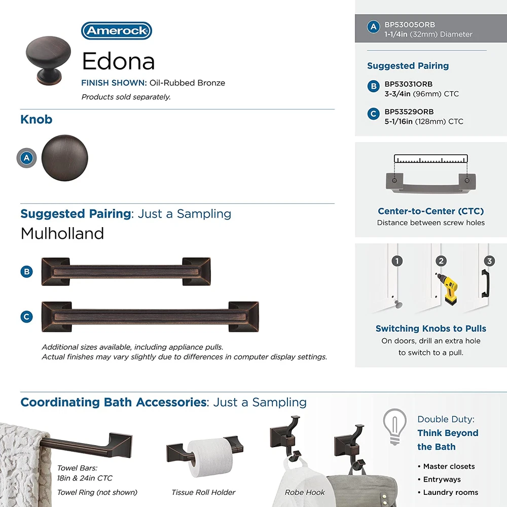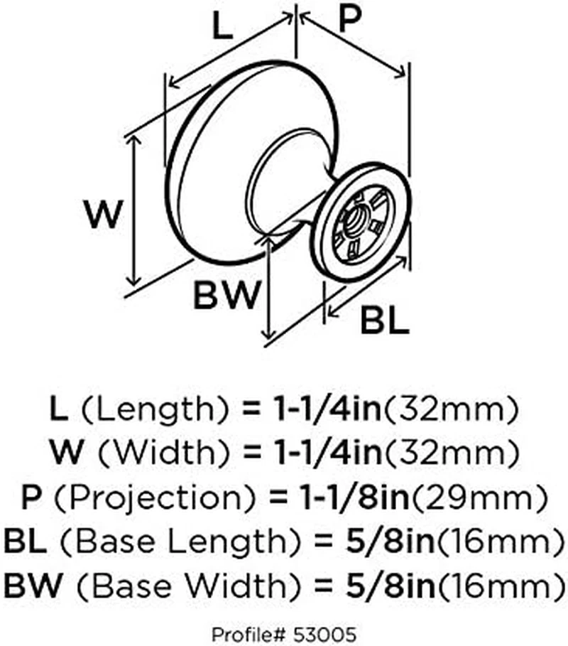 Zinc Imported VERSATILE - Traditional style adds an easy designer upgrade to any cabinet drawer, cabinet door or furniture piece DURABLE - High quality zinc construction for lifelong durability CONVENIENT - Mounting hardware included for quick and easy installation COMPATIBLE - Coordinates seamlessly with finishes from popular plumbing and lighting brands DISCLAIMER - We do our best to show colors accurately, but they might look different on your screen due to individual monitor settings The Amerock BP53005ORB 1-1/4 inch (32 mm) Diameter Knob is finished in Oil-Rubbed Bronze. From rustic to modern-day casual to sophisticated beauty, The Allison Value Collection offers a variety of designs, making on-trend, quality hardware affordable. The Oil-Rubbed Bronze finish is a rich, dark brown old world finish with striking light and dark accents. Amerock offers a complete line of decorative and functional cabinet hardware, bath hardware, hook and rail and wall plates. Amerock’s award-winning decorative and functional hardware solutions have built the company’s reputation for chic design accessories that inspire homeowners to express their personal style. Available in a variety of finishes and styles, Amerock offers high quality designs at affordable prices. Always Creating. Always Timeless. Always Amerock.