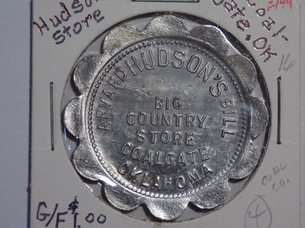 Oklahoma Trade Token 38mm - aluminum ARVARD HUDSON'S BILL / BIG / COUNTRY / STORE / COALGATE / OKLAHOMA / GOOD FOR / $1 00 / IN TRADE Bids start at $2.99 No reserve $4.00 Shipping in U.S. via USPS Ground Advantage Yes! I combine shipping! Each additional similar item won will be charged 1/2 of the stated shipping cost (or less). PLEASE wait to pay until you have received an invoice with combined shipping! All applicable state sales taxes will be added automatically by Ebay Thanks for bidding! Add me to your favorites for a steady selection of great coins, exonumia, and collectibles! We work very hard to provide accurate pictures and descriptions. With over 62,000 positive feedbacks (at 100%!) and thousands of bidders who appreciate our variety, quality, and accuracy, you can bid with confidence!