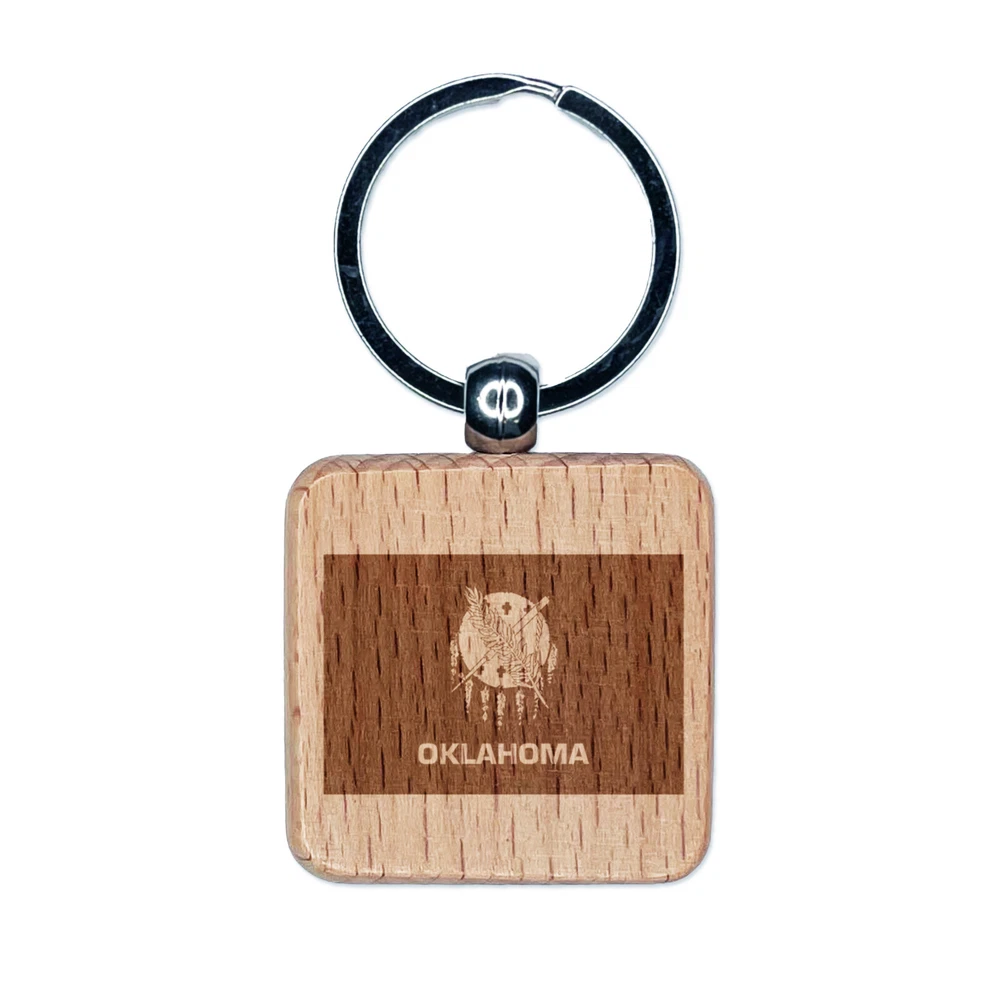 Oklahoma State Flag Engraved Wood Square Keychain Tag Charm