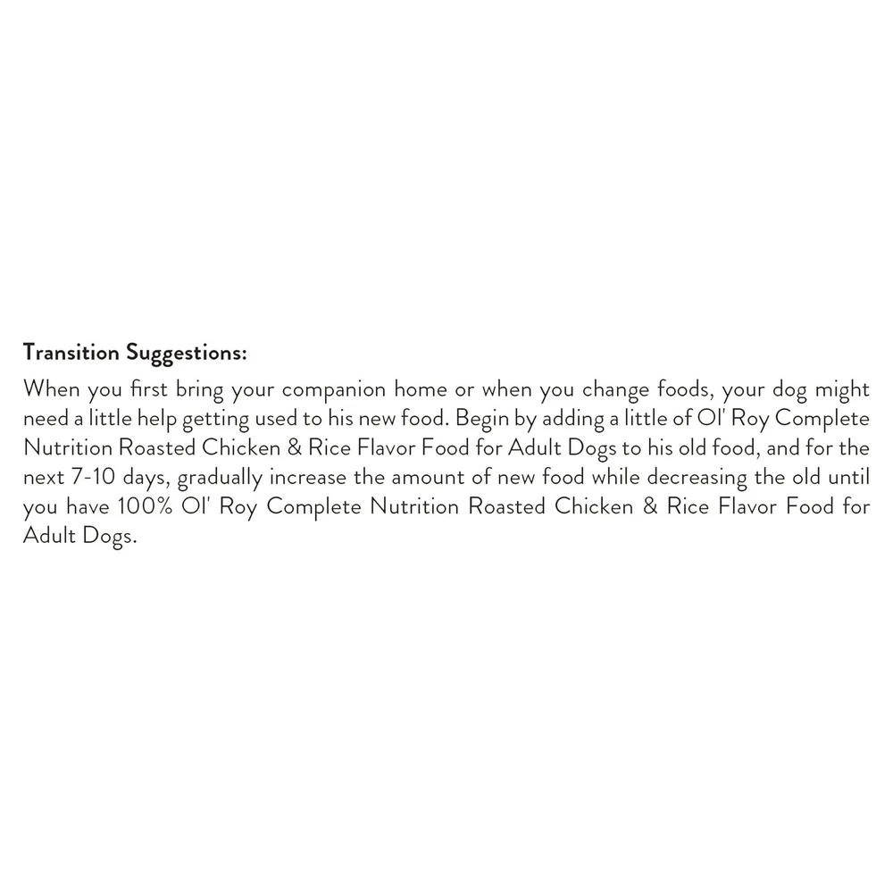 Ol' Roy Complete Nutrition Roasted Chicken & Rice Flavor Dry Dog Food is a daily food that provides your dog with the essential nutrition they need to stay healthy and happy. Each serving of this 100-percent complete and balanced nutrition dog food comes with the essential nutrients to promote a healthy skin and coat, calcium, and phosphorous for strong teeth and bones. Plus, the new roasted chicken and rice flavor encourages a healthy appetite in your beloved furry friend. This dry food is ideal for adult dogs of any size, and you can trust its complete nutrition profile of vitamins and minerals, healthy fats, protein, and carbohydrates to support a long, healthy life in your dog. Treat your dog to the nutritious benefits and flavor of Ol' Roy Complete Nutrition Roasted Chicken & Rice Flavor Dry Dog Food. Essential Vitamins Contains essential nutrients to support a healthy lifestyle 21% protein and 10% fat nutritional composition Great tasting roasted chicken and rice flavor to encourage a healthy appetite No added artificial flavors Follow the convenient feeding instructions listed on the back of the packaging to your dog is receiving the appropriate amount for their size during feeding times Great tasting roasted chicken and rice flavor to encourage a healthy appetite 100% complete and balanced nutrition for adult dogs Contains essential nutrients to support a healthy lifestyle 21% protein and 10% fat nutritional composition Great tasting roasted chicken and rice flavor to encourage a healthy appetite No added artificial flavors Follow the convenient feeding instructions listed on the back of the packaging to your dog is receiving the appropriate amount for their size during feeding times Great tasting roasted chicken and rice flavor to encourage a healthy appetite 100% complete and balanced nutrition for adult dogs Contains essential nutrients to support a healthy lifestyle 21% protein and 10% fat nutritional composition Great tasting roasted chicken and rice flavor to encourage a healthy appetite No added artificial flavors Follow the convenient feeding instructions listed on the back of the packaging to your dog is receiving the appropriate amount for their size during feeding times Great tasting roasted chicken and rice flavor to encourage a healthy appetite 100% complete and balanced nutrition for adult dogs Contains essential nutrients to support a healthy lifestyle 21% protein and 10% fat nutritional composition Great tasting roasted chicken and rice flavor to encourage a healthy appetite No added artificial flavors Follow the convenient feeding instructions listed on the back of the packaging to your dog is receiving the appropriate amount for their size during feeding times Great tasting roasted chicken and rice flavor to encourage a healthy appetite