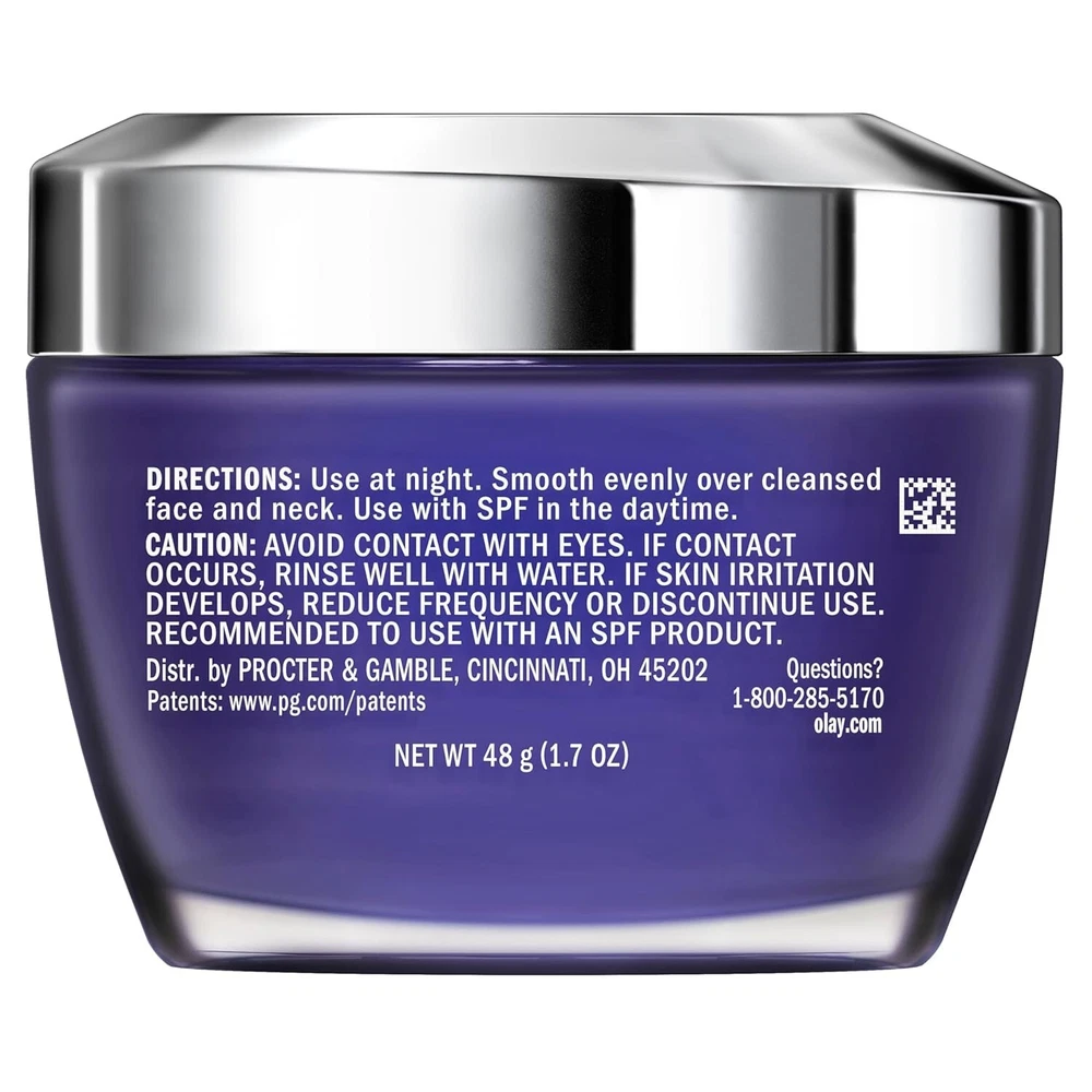 FREE SHIPPING Olay Retinol 24 Face Moisturizer, Anti-Aging Night Face Cream for Wrinkles and Uneven Skin Tone with Retinol, 1.7 oz Product Details: Size and Packaging: Volume: 1.7 oz (50 ml) Comes in a sleek, dark jar to protect the retinol from light exposure, ensuring potency. Key Ingredients: Retinol Complex: Penetrates deep into the skin's surface to stimulate collagen production. Promotes cell turnover, reducing wrinkles and improving skin texture. Niacinamide (Vitamin B3): Brightens skin and evens out tone. Strengthens the skin barrier and provides hydration. Amino Peptides: Help improve skin elasticity and firmness. Texture: Lightweight, non-greasy cream that absorbs quickly. Leaves skin feeling soft and hydrated without clogging pores. Benefits: Reduces Signs of Aging: Targets wrinkles, fine lines, and dark spots. Improves skin elasticity, giving a more lifted appearance. Evens Skin Tone: Minimizes hyperpigmentation and age spots. Promotes a radiant, brighter complexion. Hydrating Formula: Provides 24-hour hydration, preventing dryness often associated with retinol. Helps maintain a plump, dewy appearance. Gentle Yet Effective: Suitable for daily use on all skin types, including sensitive skin. Fragrance-free to minimize irritation. How to Use: Cleanse: Wash your face and pat dry. Apply: Gently massage a pea-sized amount onto your face and neck. Night Use: Use in the evening; retinol can increase sun sensitivity. Follow Up: Apply sunscreen during the day to protect your skin. Who It's For: Individuals looking to combat early signs of aging. Those with concerns about uneven skin tone or dark spots. Suitable for normal, oily, dry, and combination skin types. Precautions: Start Slowly: Introduce retinol gradually (2-3 times per week) to allow your skin to adjust. Avoid Harsh Products: Do not combine with other strong actives like AHA/BHA initially.