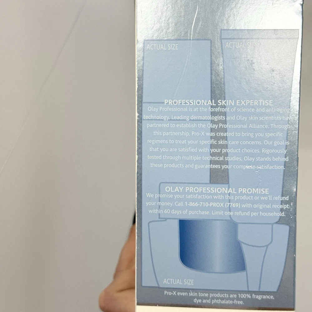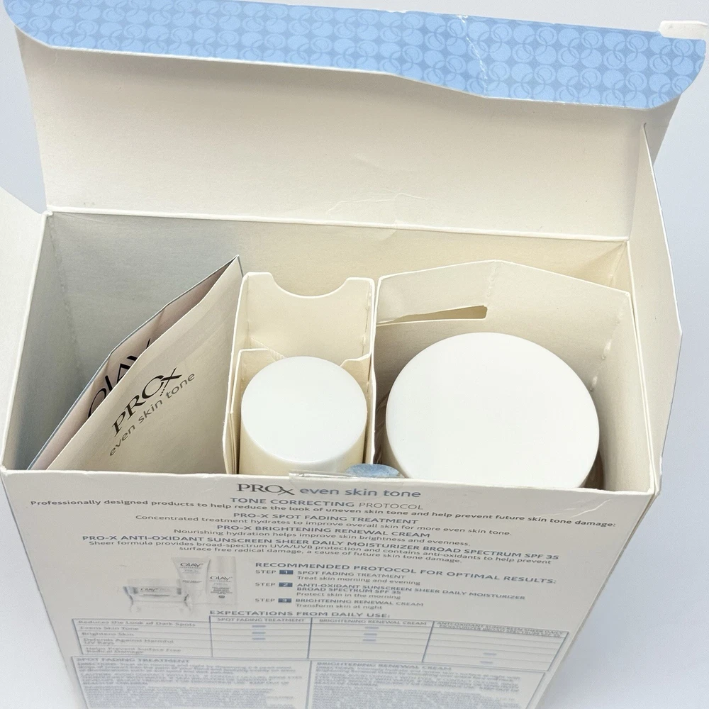 Olay Pro X Even Skin Tone Kit. Box is open, but items are unused. 3 items included in the set: Spot fading treatment .5oz Brightening renewal cream 1oz Sheer daily moisturizer with spf 1oz Discontinued products so the spf has a expiration date of 07/2015