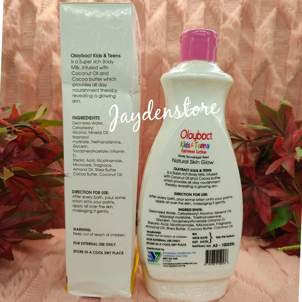 Olaybact Kids & Teens Natural Fairness Lotion 400ml. Contains coconut oil, shea butter, almond oil, niacinamide, vitamins. Olaybact kids teens lotion nourishes and reveal a glowing skin. Smoothens the skin.
