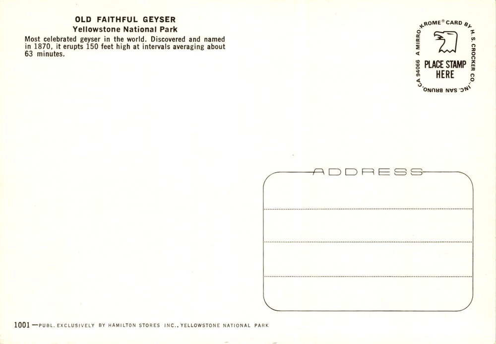 MAKE AN OFFER. THE MORE YOU BUY THE BETTER DEAL I WILL ACCEPT The postcard features an image of the Old Faithful Geyser in Yellowstone National Park. Old Faithful is one of the most famous geysers in the world, discovered and named in 1870. It is known for its predictable eruptions, shooting water up to 150 feet high at intervals of around 63 minutes on average.