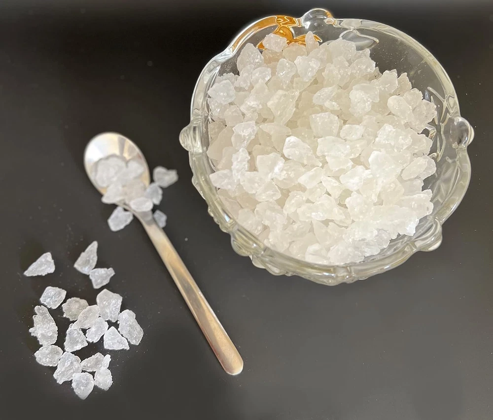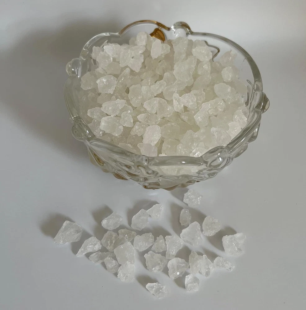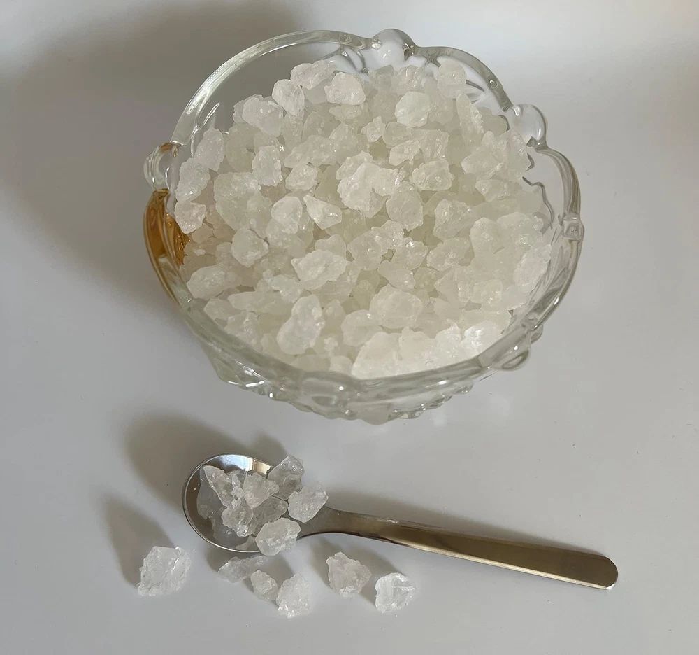 The purest sweetener for hot drinks like tea and coffee No color, no preservative and no flavor added Ingredient: Cane Sugar Rock candy crystal (rock sugar) is made by a crystallization process as diamond produces in nature, just with different ingredients. This process breaks apart sugar's molecular crystal lattice. After removing all impurities, in a high temperature and a specific time, the process allows producing larger and purer crystal of sugar that is known as classic rock candy crystals. This product is processed on a facility that also processes rock candy strings. May contain small pieces of string.