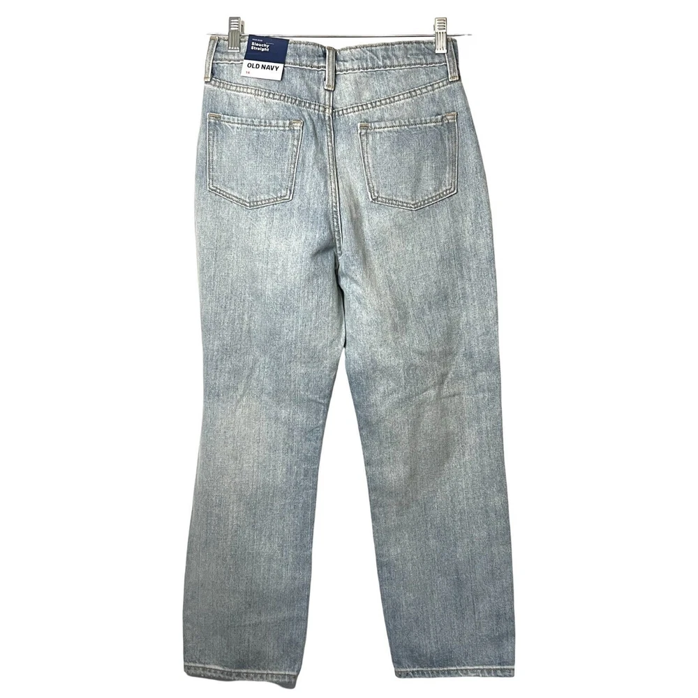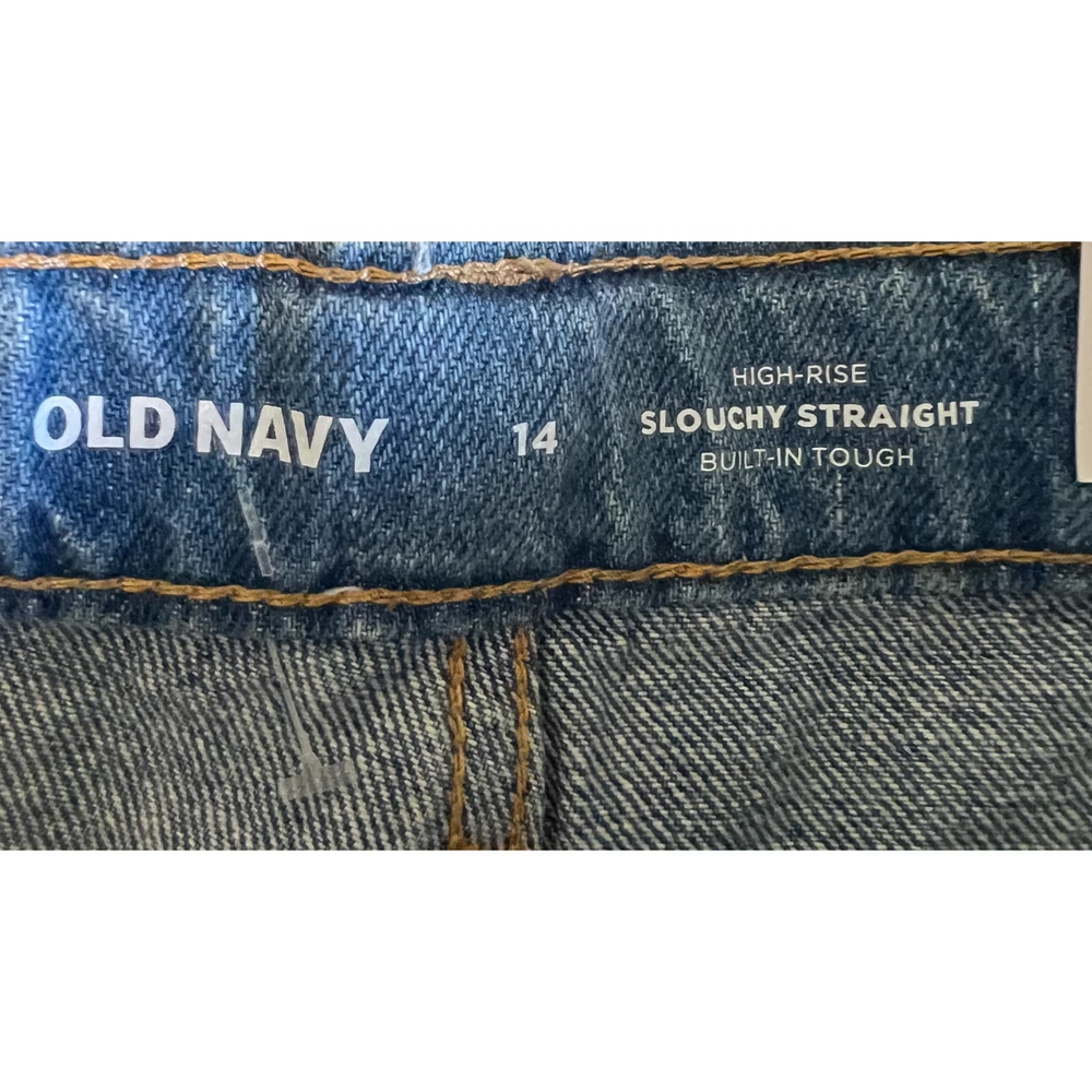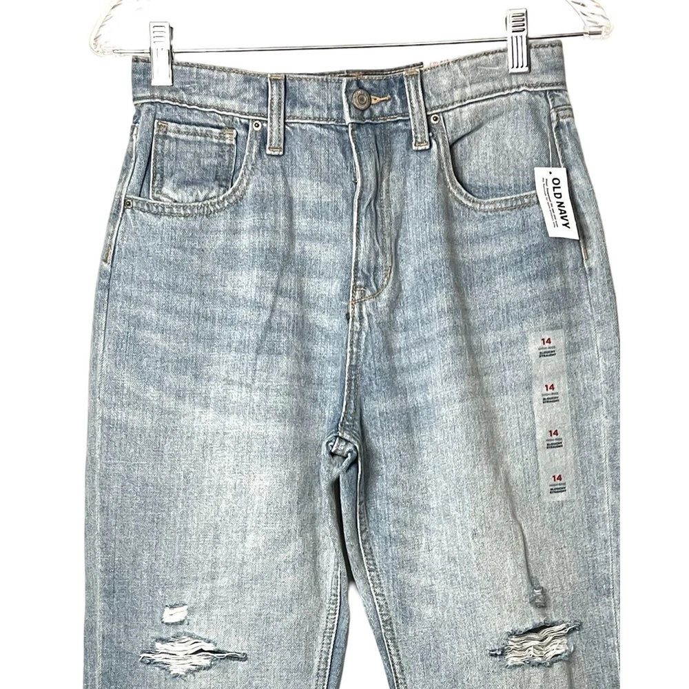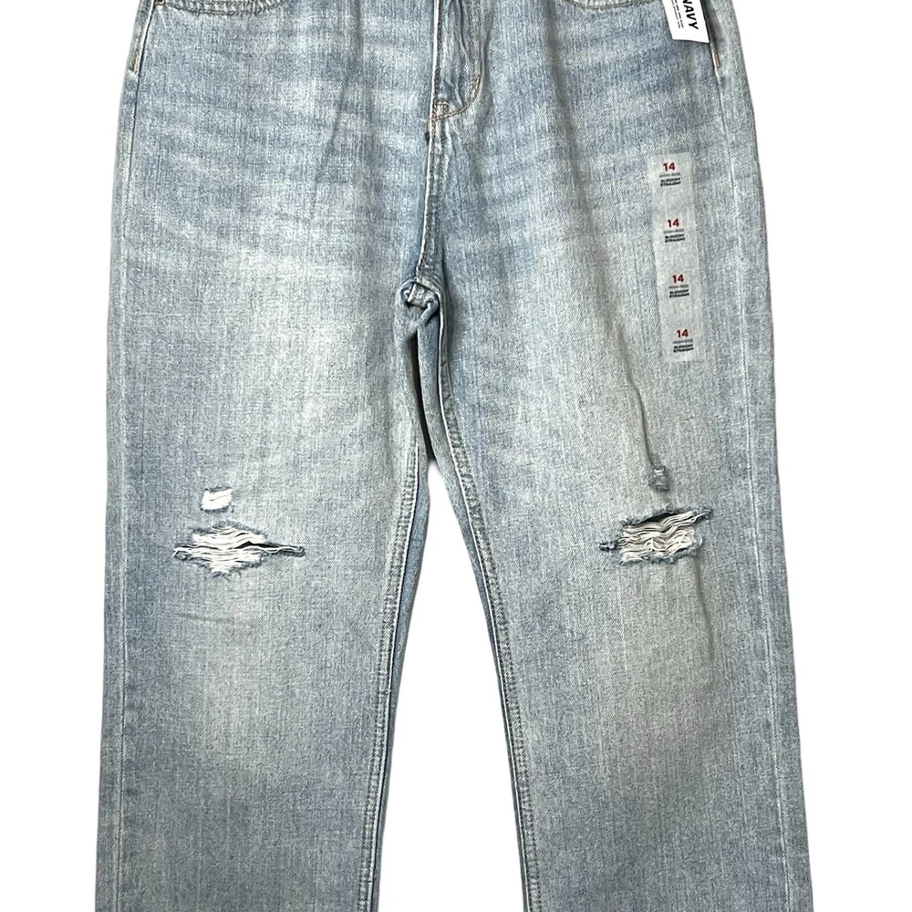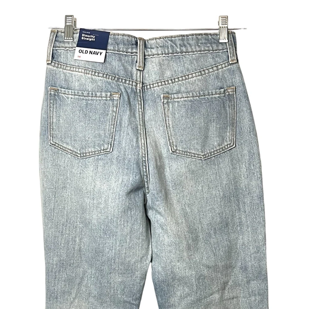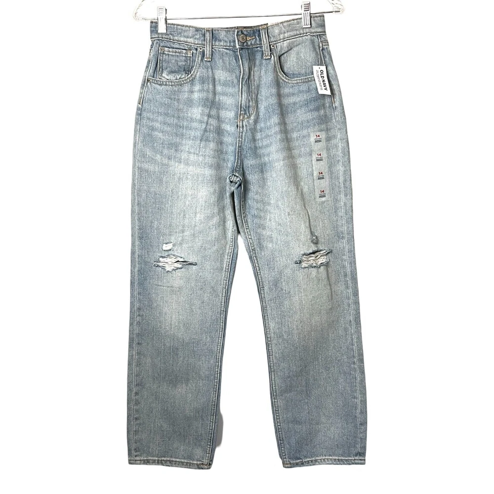NEW WITH TAGS | $35 retail 27" waist 25" inseam 11" rise Old Navy Slouchy Straight jeans, girls size 14 * high-rise fit * straight leg design * light wash denim * distressed details * adjustable waist * zip and button closure * pockets * machine washable ** all items stored in smoke-free, pet-free home