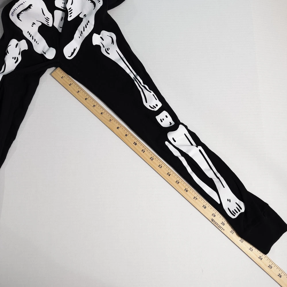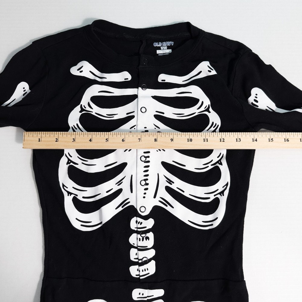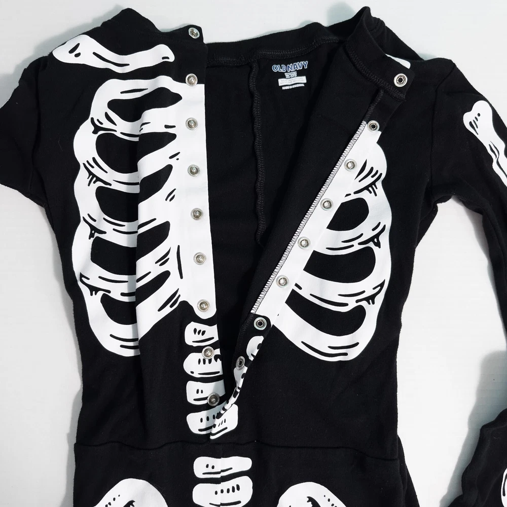 Old Navy Kids Unisex Skeleton One Piece Halloween Costume Pajamas * Condition: Great pre-owned condition. It is missing the care/material tag but has no stains, holes, or major signs of wear. Please see photos. * Size: Unisex XL (12) * Please see photos for multiple measurements * Color: Black, White * Snug-fitting * Human skeleton print on the front and solid black on the back * Pull-on style with snap button closure on front torso * I don't think this one glows in the dark All of my items are stored in a smoke-free, dog-friendly home.