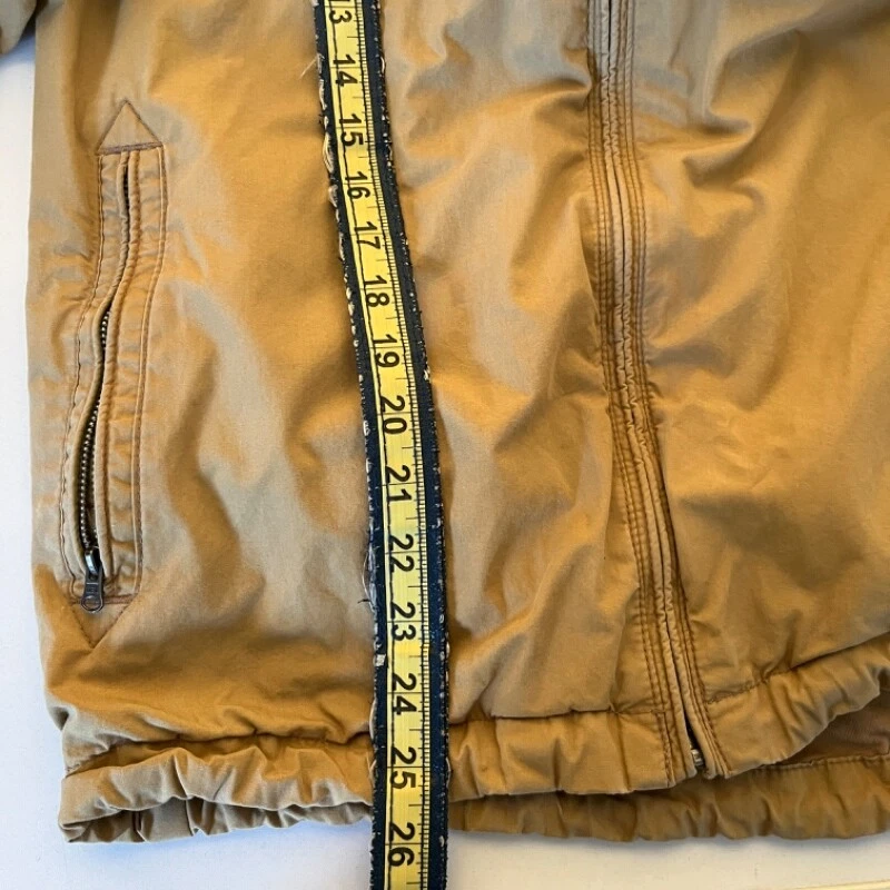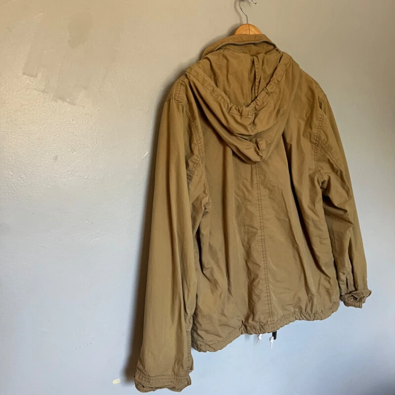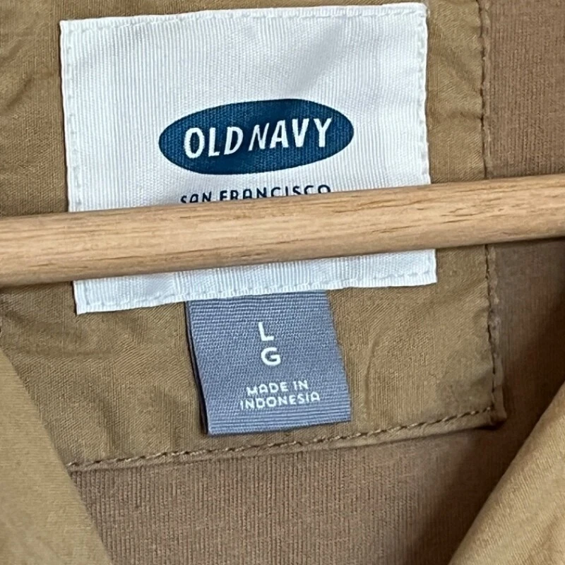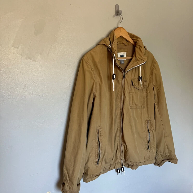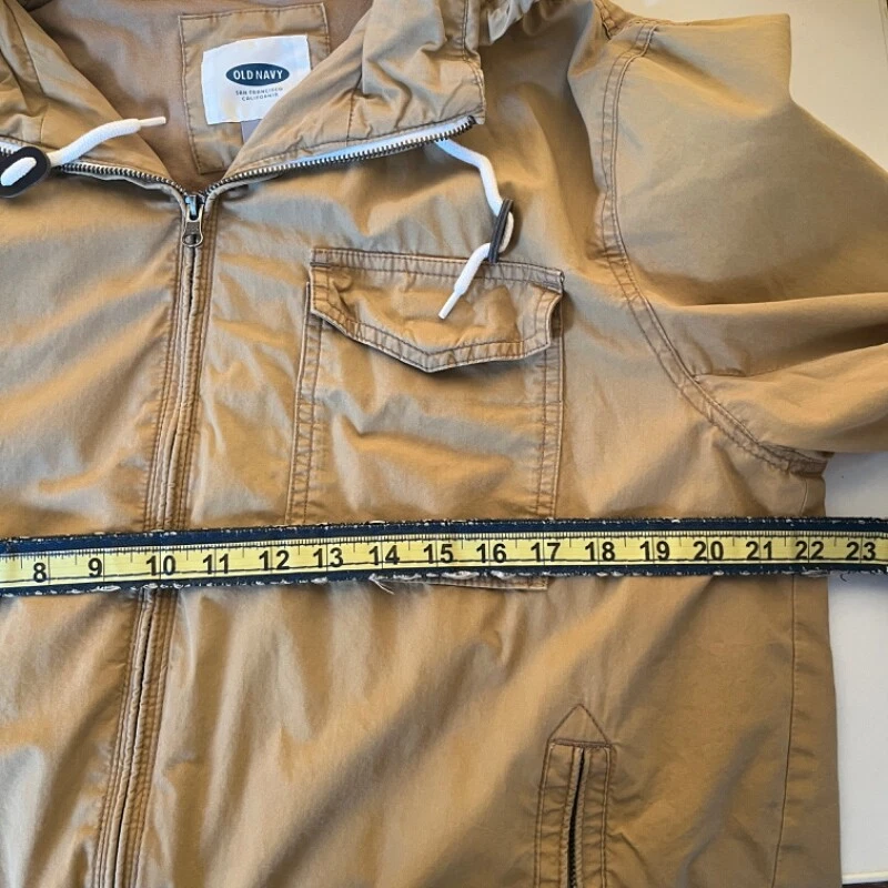 Old Navy Men's Jacket - Khaki Size Large (L). See measurements in photos. Approximately 23 inches across the chest and 26 inches from shoulder to hem. Condition: Good Used Condition. No visible damage or wear. Perfect for casual and outdoor settings. Features: Drawstring hood with white laces, front zipper closure, chest pocket with button, and two side zip pockets for storage. Light material, ideal for mild to cold weather. Made in Indonesia. CL