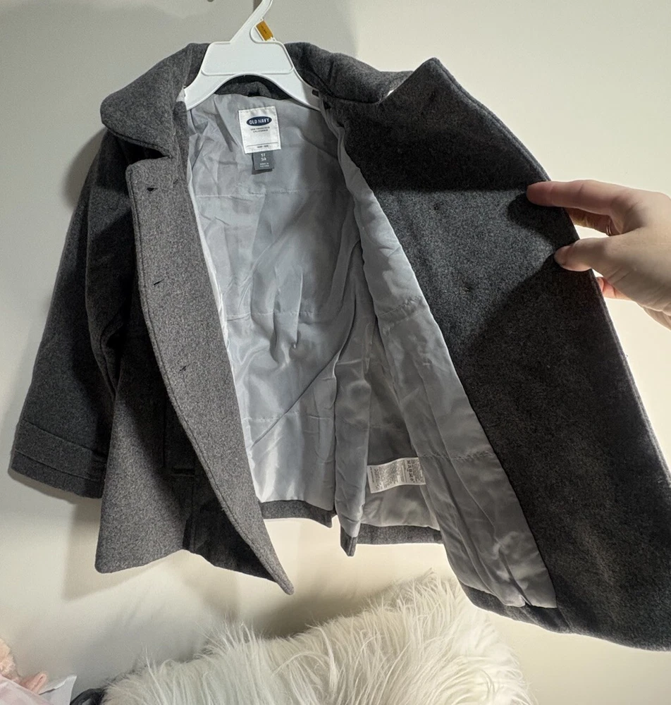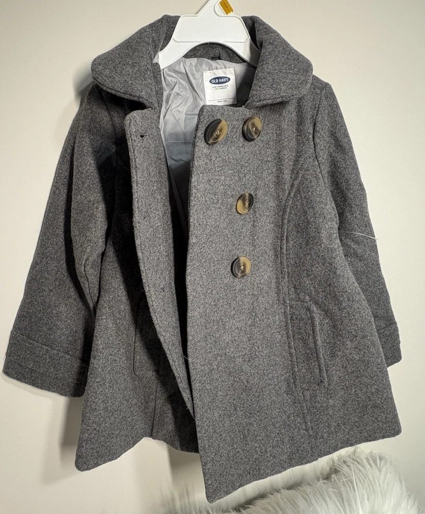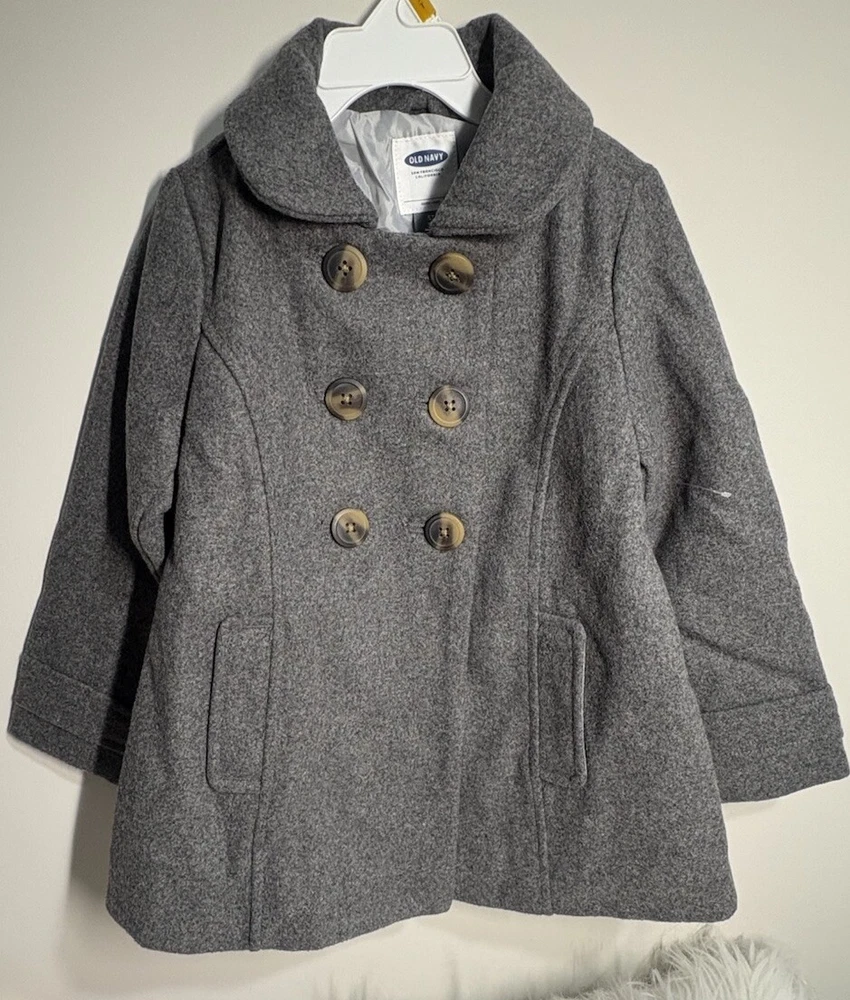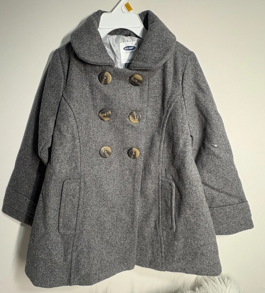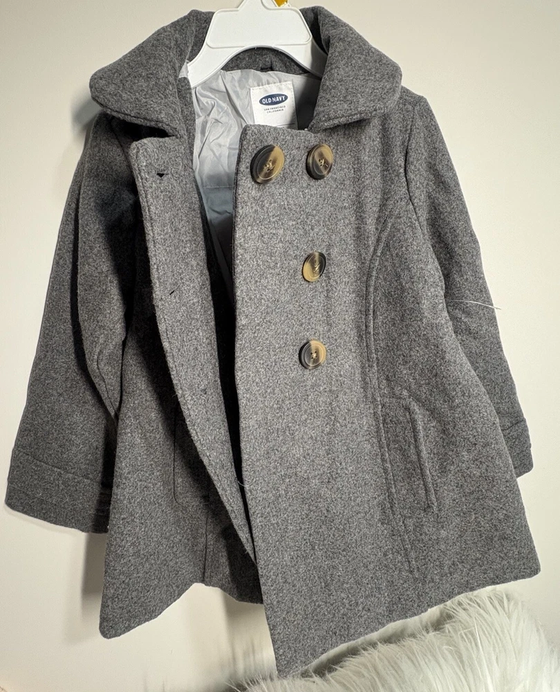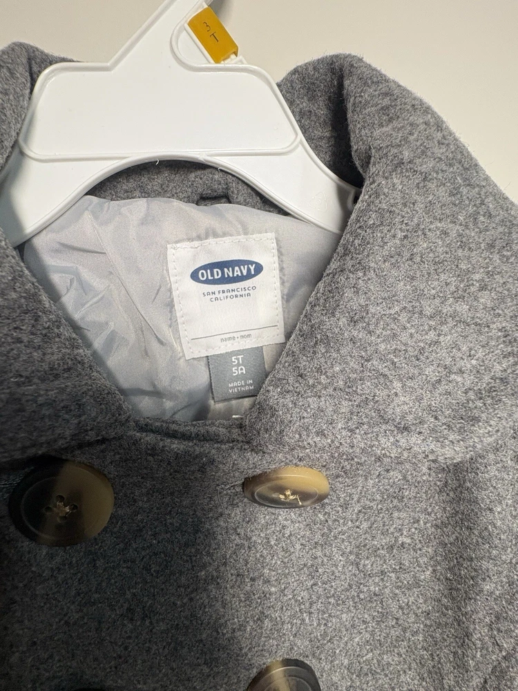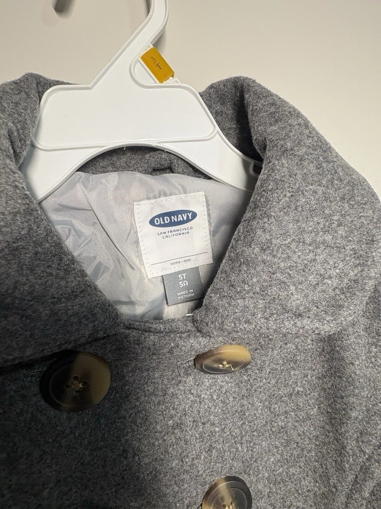 This is a girls' gray coat from Old Navy in size 5, designed with a 100% polyester outer shell and lining for warmth. The coat has long sleeves and a button closure, making it a practical choice for casual occasions during the winter, fall, and spring seasons. With a classic solid pattern and pockets for convenience, this basic coat also features insulation material made of polyester for added warmth. Perfect for school activities, this coat is a comfy and stylish choice for young girls.