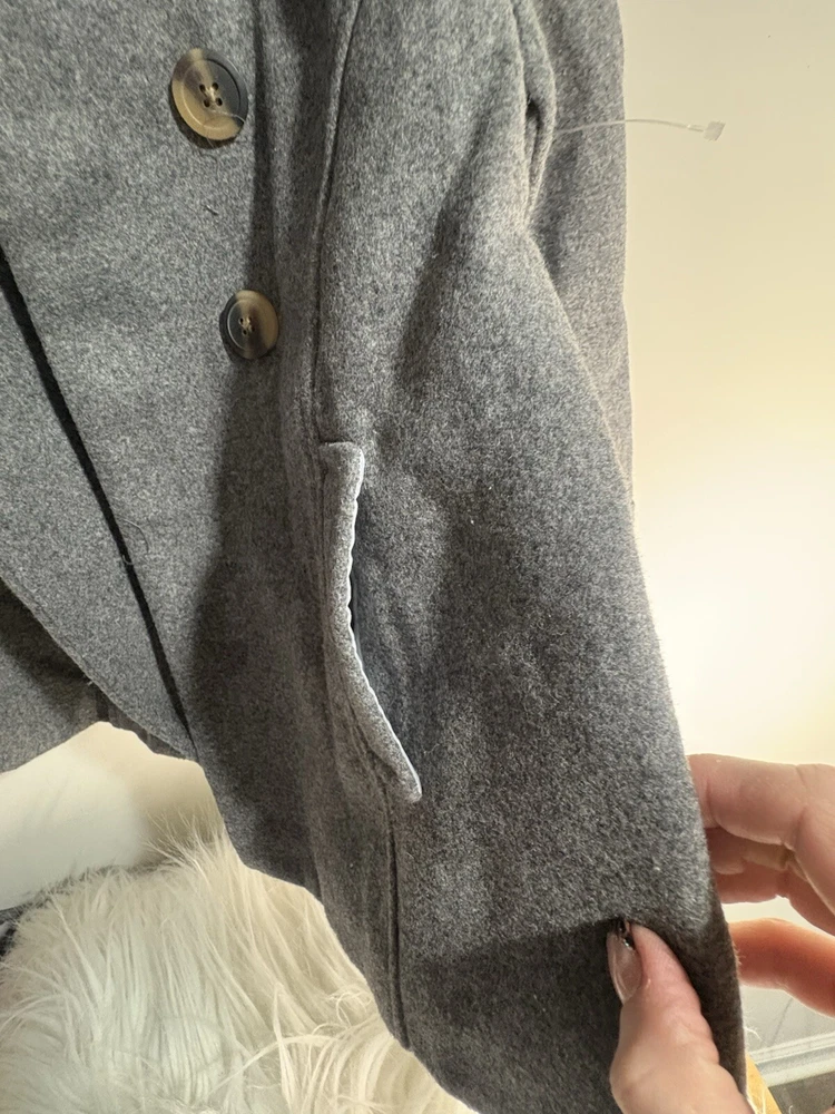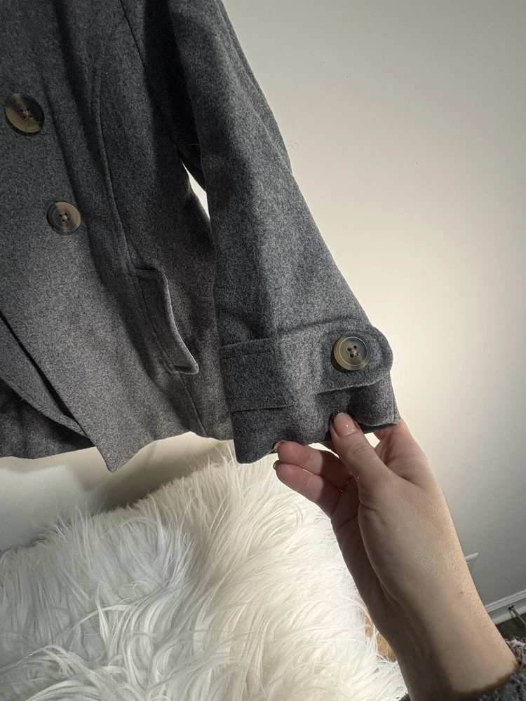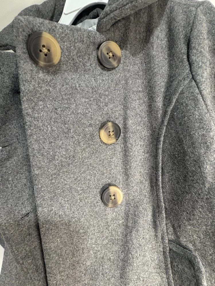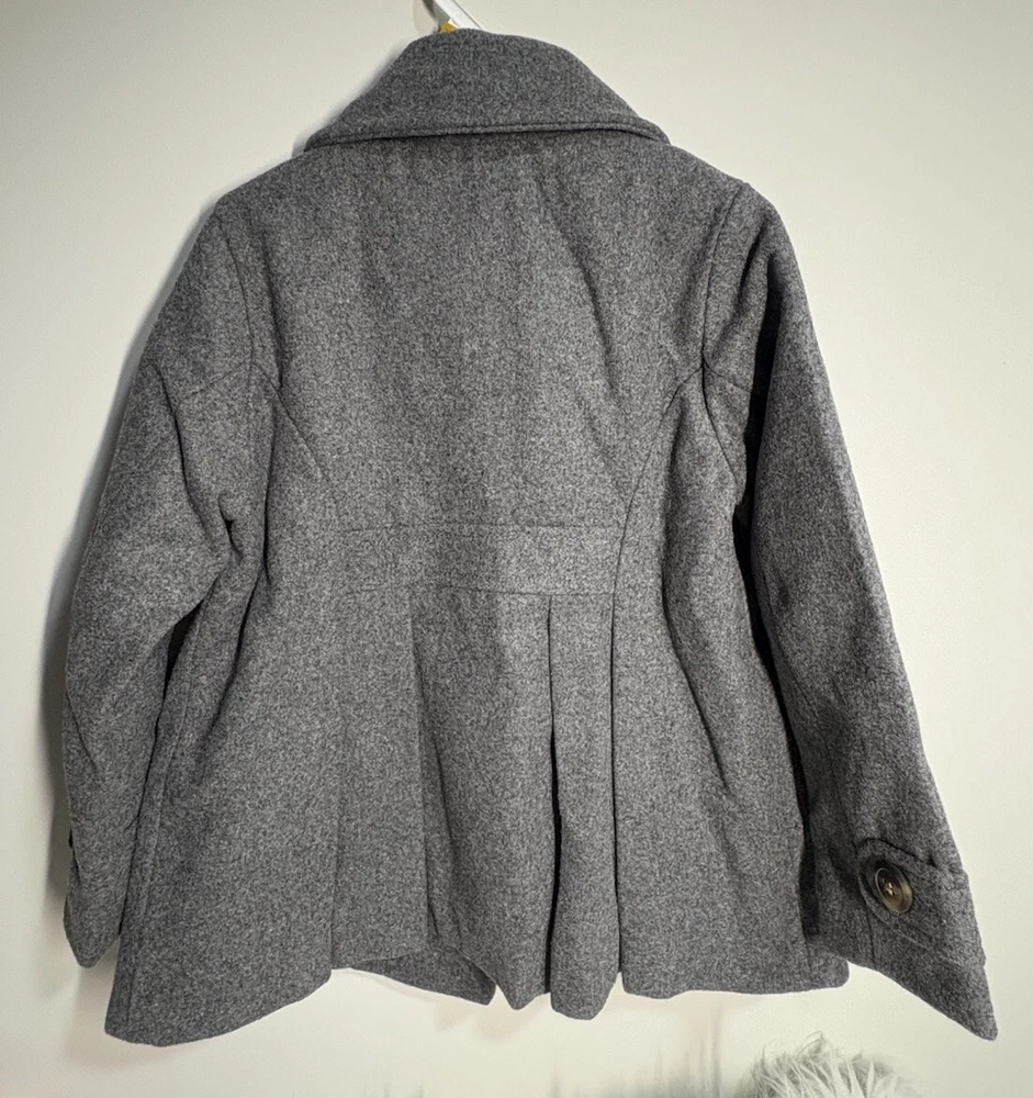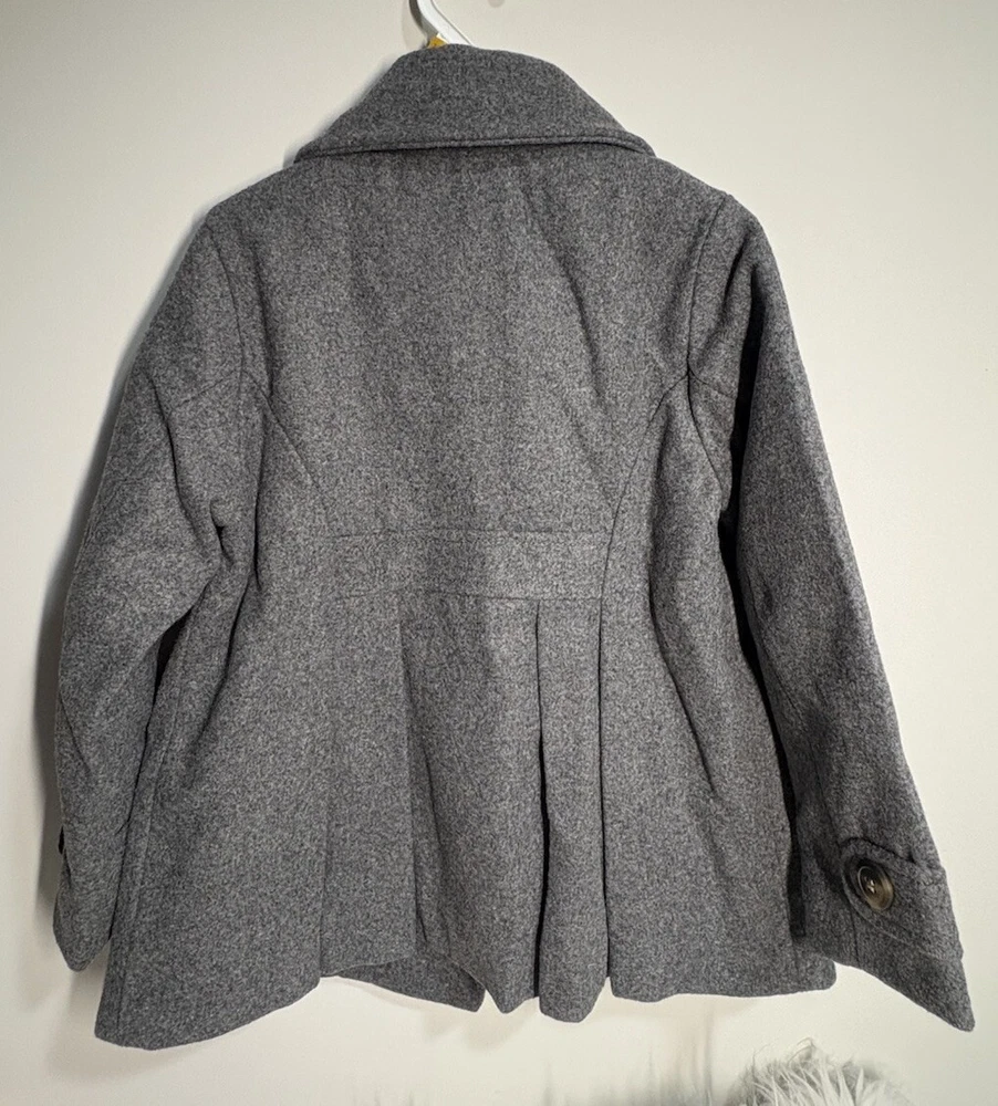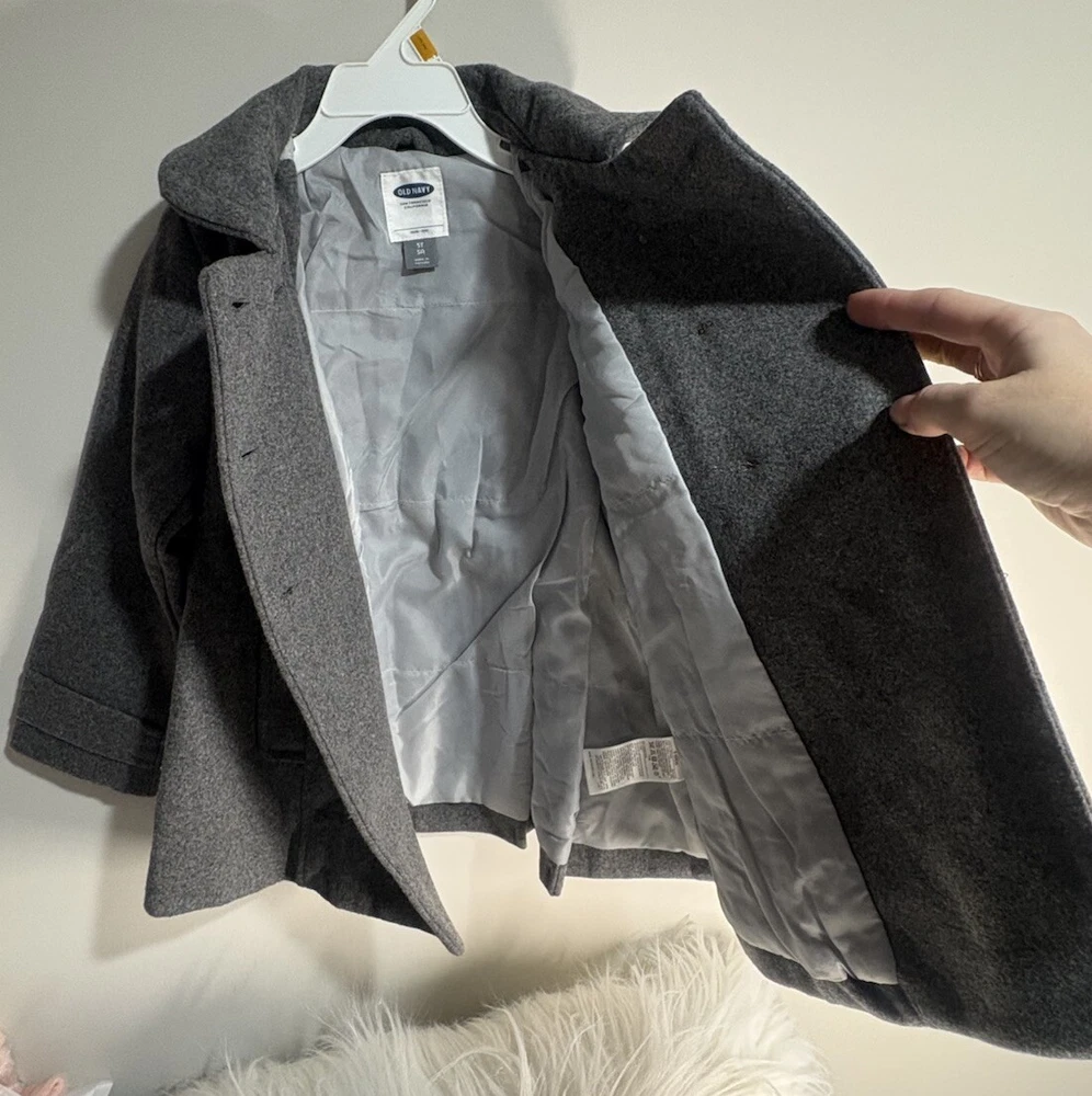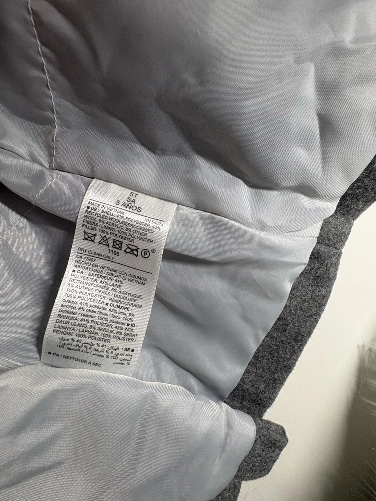 This is a girls' gray coat from Old Navy in size 5, designed with a 100% polyester outer shell and lining for warmth. The coat has long sleeves and a button closure, making it a practical choice for casual occasions during the winter, fall, and spring seasons. With a classic solid pattern and pockets for convenience, this basic coat also features insulation material made of polyester for added warmth. Perfect for school activities, this coat is a comfy and stylish choice for young girls.