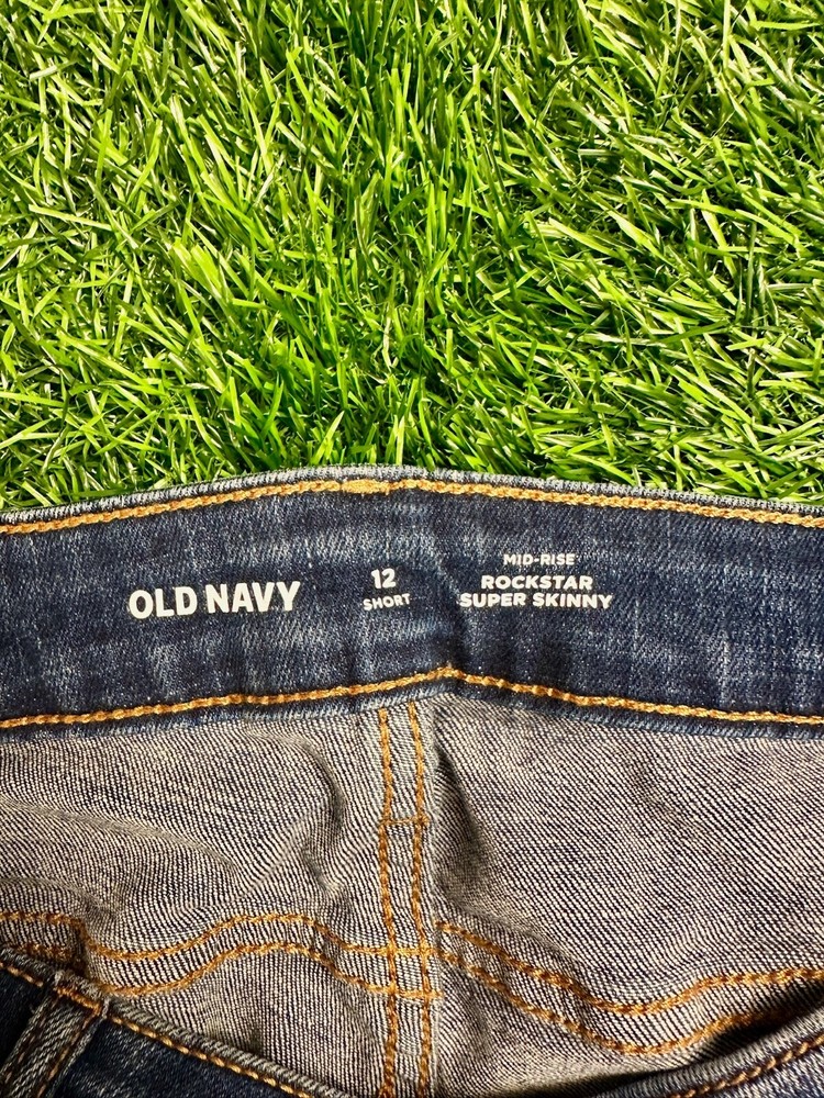 These Old Navy Rockstar Super Skinny Mid-Rise Dark Wash Jeans in size 12 feature a solid denim fabric with a dark wash. They have a zip and button closure, a 5-pocket design, and a slimming, stretch fit. Made of a blend of polyester, spandex, and cotton, they are machine washable. The jeans have a 33-inch waist size, a 28-inch inseam, and a mid-rise of 8.5-10.5 inches. Perfect for a rock, school, college, or city-themed look.