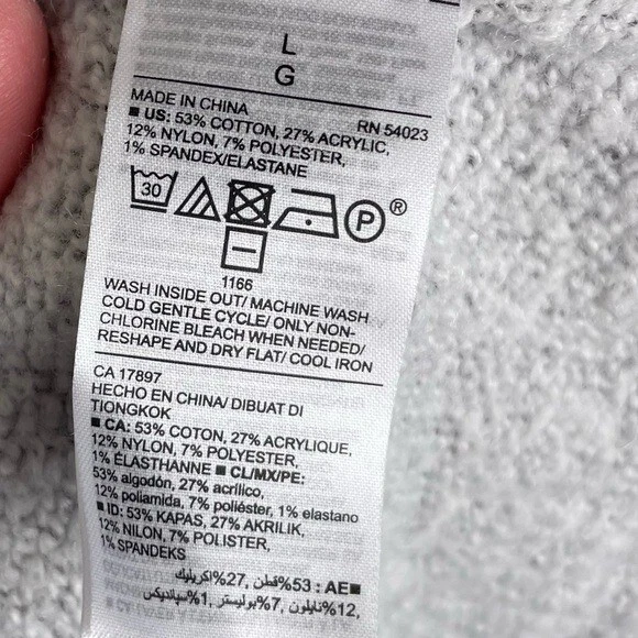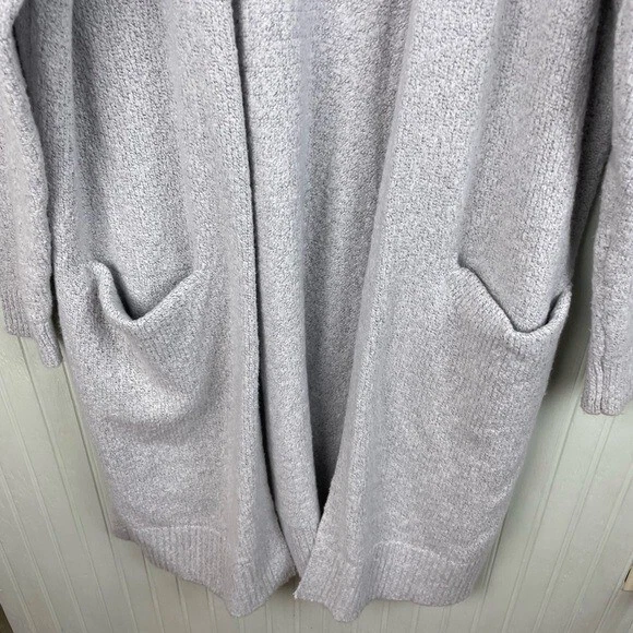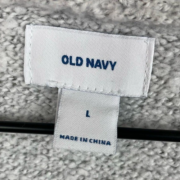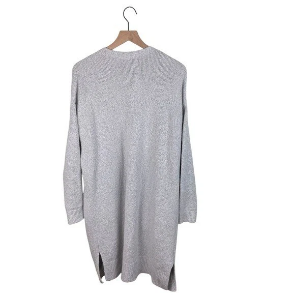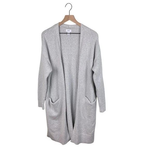 Old Navy Super-Long Open-Front Heavyweight Sweater for Women Color: light gray heather Style: 284686 Thick, warm knit cardigan sweater Long sleeves Open front Side split hems Front patch pockets Cotton/Acrylic/Nylon/Polyester/Spandex Size Large Excellent pre-owned condition Approximate measurements: Pit to pit: 25” Length from shoulder: 41.5”