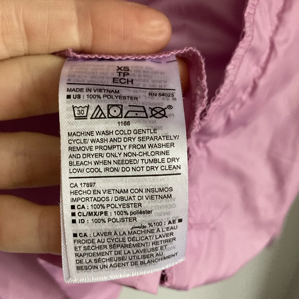 Sleeve Length:Long SleeveOuter Shell Material:PolyesterJacket/Coat Length:ShortSize:4Closure:ZipFeatures:Full Zip, Hooded, Lightweight, Packable, Pockets, Zipped PocketsPersonalise:NoGarment Care:Machine WashableSeller Notes:“Good - mark on the back shown in last photo”Pattern:No PatternSize Type:RegularBrand:Old NavyHandmade:NoColour:PurpleStyle:WindbreakerType:JacketDepartment:WomenVintage:NoCountry/Region of Manufacture:VietnamSeason:Autumn, Spring, Summer