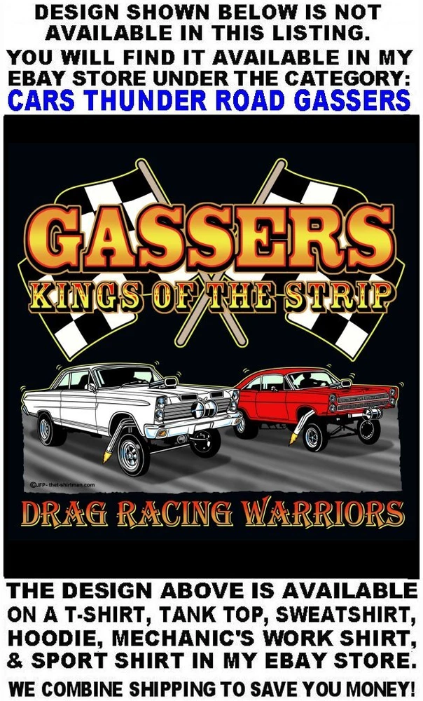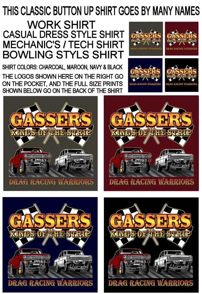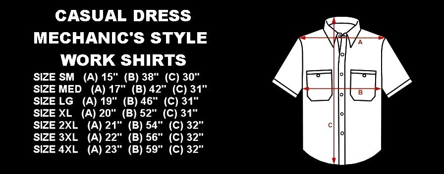 We only use name brand, high quality, soft hand 65% / 35% poly cotton blend poplin permanent press shirts. Great for casual dress, or as mechanic's work shirts. Or better yet, you'll be the hit at any car show, swap meet, or racetrack with one of our specialty custom shirts! These designs are our own copyrighted designs and not available anywhere else. Please use the size chart that is shown in the Ebay pictures for this listing. Colors include Charcoal, Black, Navy, and Maroon in most sizes from Small to 6XL Our shirts are not pre-printed then simply pulled off a shelf. Each shirt is custom printed per your order, by us, right here in the USA. We print and ship within 1 working day. The design for this listing offers 30 different variations. It is a unique shirt you the customer design yourself by choosing this style, the size, and the color. Double check to be sure and order the exact size, color, and print combination you want. IMPORTANT: use the size chart. Buying more than one shirt? I will combine the shipping to save you money. Be sure to click the "Save this seller" button. For more cool short & long sleeve t-shirts, tank tops, sweatshirts, hoodies, zip hoodies, casual mechanics work shirts and more, click on: "Sellers other items". Then click the "category button" to choose the type of designs you like on the style shirt you want. If you have any questions, feel free to ask.