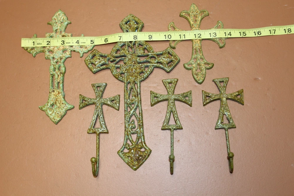 Beautiful cast iron wall crosses for a stunning display. C- 50 51 68 H-67b. Generous hooks on the wall hooks to hang coats, bags, caps, keys... Hang as a group or separately throughout your home. These are great to add to your collection or as gifts for friends. We do not substitute any crosses in this collection. None of them are available for sale individually. This set is a value price. The size range is approximately 5 3/4 inch to 10 3/8 inch. There are holes or brackets on each wall cross for mounting. The holes will vary in placement as these are hand-cast. No hardware provided. You can use any type of standard screw. The front of the crosses are three-dimensional and the backs are flat for flush mounting. The finish is a baked-on powder coat that inhibits rust. Please let us know if this is a gift. We are more than happy to include a hand-written gift message on your behalf. If for any reason the order is returned, all items must be returned to receive a refund. Our cast iron products are made in China, housed and shipped by Texans in USA C- 50 51 68 H-67b