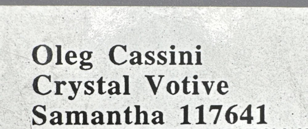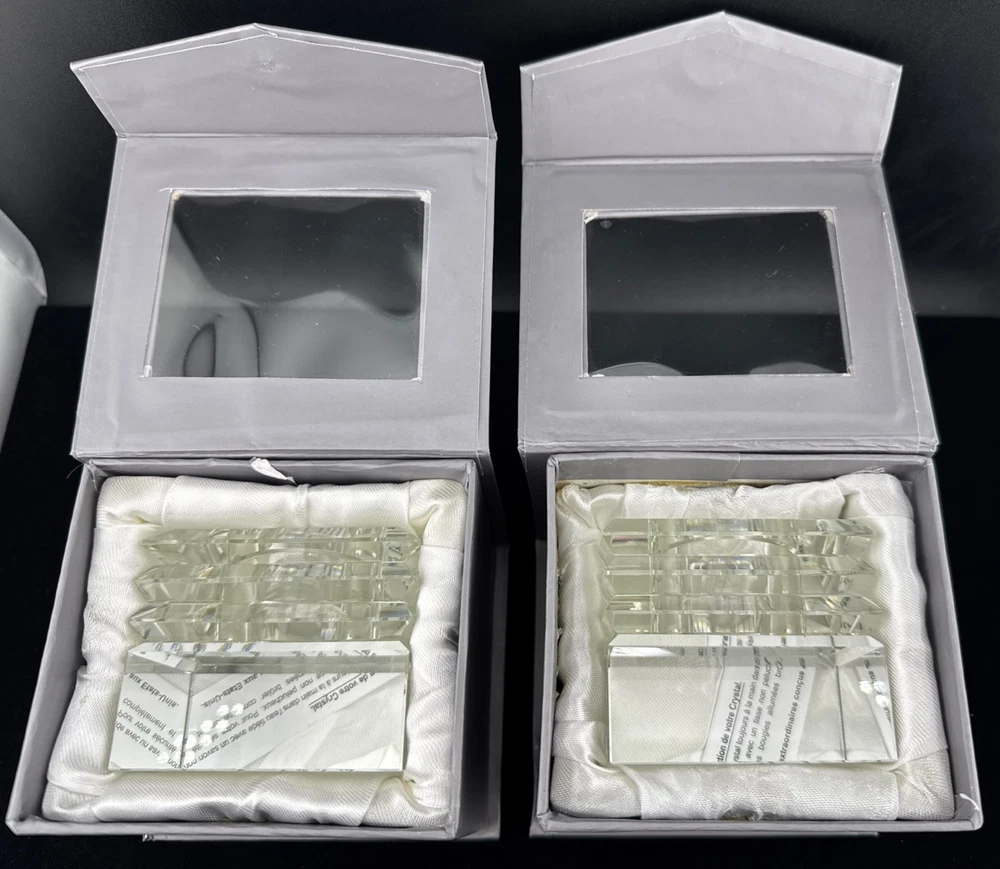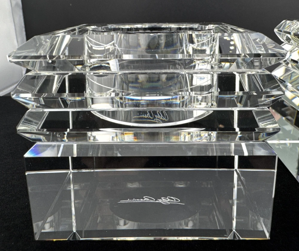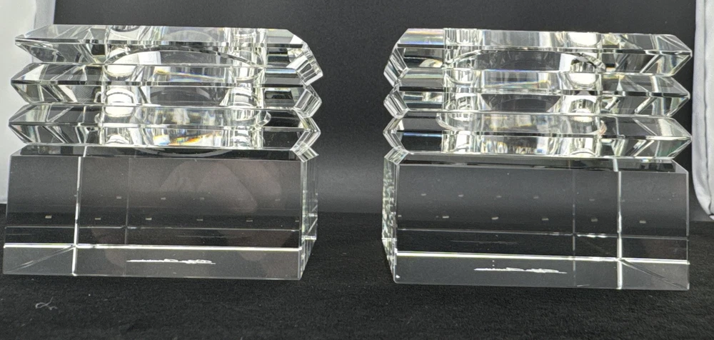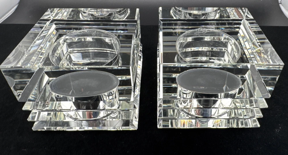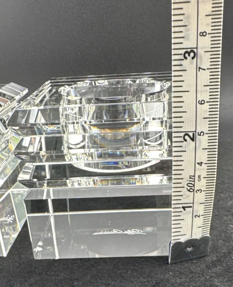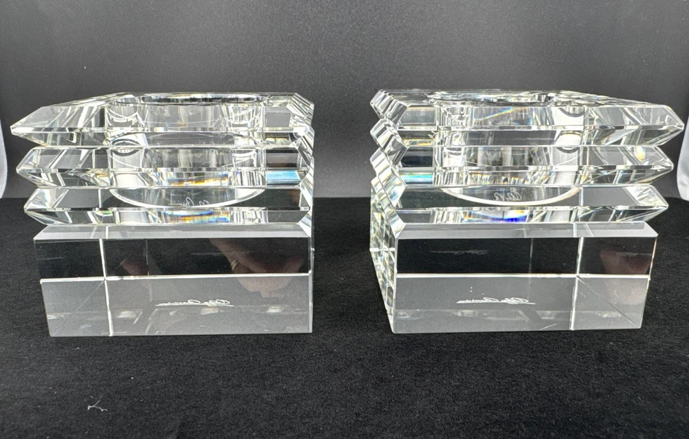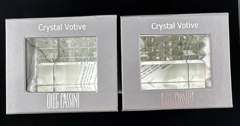 This is a set of two Oleg Cassini Crystal Votive Samantha Candle Holders, each measuring 2.75"x2.75"x2.5". They have a modern style with geometric patterns and are made of clear crystal with a smooth, glossy finish. The candle holders feature crystals and are designed for any room or occasion. They each come in a box and total weigh of 3 lbs, making them ideal for decorative use in a romantic-themed setting. New in box with signature.