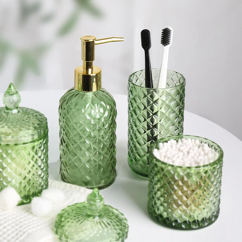 Pack Include: Cotton Swab Holder, Toothbrush Holder, Cotton Ball Holder, Soap Dispenser. Green Bathroom Accessories Set, 4 Pack Olive Green Bathroom Decor Accessory Sets Complete, Diamond Glass Soap Dispenser and Toothbrush Holder Set for Bath Counter Organizer Essentials 【ATTRACTIVE 4 PACK GREEN BATHROOM ACCESSORIES】 Get these DIAMOND STYLE elegant additions to your bathroom right now! Let these green bathroom accessory set brighten your bathroom nicely! This green bathroom decor is perfect for every bathroom theme no matter boho, modern, farmhouse, vintage, and western, you name it! You would get a SOAP DISPENSER, a TOOTHBRUSH HOLDER, a QTIP HOLDER, and a COTTON BALL HOLDER in just ONE set! 【GORGEOUS DIAMOND PATTERN DESIGN】Diamond is a symbol of purity and magnificence. Such a diamond-style glass olive green bathroom accessories set could be easily suitable for your bathroom themes. Brighten up your bathroom space in a way that’s as unique as you are. Each green bathroom set accessories is handcrafted by experts, and each diamond pattern on it is equally sparkling, not only in your bathroom but also in the eyes of every guest who enjoys it. 【STURDY GREEN GLASS MATERIAL】All these green bathroom accessories sets complete are made of high-quality green glass. Elegant, sturdy, and heavy-weighted. Not easy to be broken or tip over. Let those plastic inferior bathroom accessories sets leave your bathroom, and let this green bathroom soap dispenser and toothbrush holder set complement your bathroom vanity decor. 【PRACTICAL FOR USE】If you are a person who loves enjoying life, you would find that the green bath accessories sets meet all your daily needs in your life. The 13oz Soap dispenser filled with hand soap/lotion/face wash could be used for a long time. The green bathroom organizer essentials could hold multiple toothbrushes, toothpaste, combs, and shavers at the same time. 2 jars could be used for qtips, cotton balls, cotton swabs, cotton pads, etc. Makes your bathroom look tidy and wonderful. 【WONDERFUL GIFT IDEA & SUPERIOR QUALITY SERVICE】This green bathroom accessories decor set is a great and unique gift for housewarming, wedding, birthday, Mother's Day, Thanksgiving Day for mom, sister, colleague, and friends.