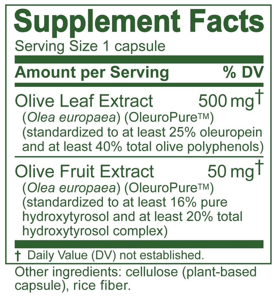 Get Super-Strength Natural Immune Support for Whatever's Bugging You This ultra-premium blend of olive polyphenols starts with select non-GMO Spanish olive trees, grown without fertilizer, pesticide or irrigation on centuries-old family farms, where some trees date to Roman times. World-class olive experts prepare traditional extracts at a facility dedicated to olive production in the middle of olive country. takes Olive Leaf Extract to a whole new level. 25% OLEUROPEIN: This polyphenol gives health benefits (and the bitter taste) to Extra Virgin Olive Oil. OLIVE FRUIT POLYPHENOLS: The Oleuropein is fortified with powerful antioxidant and skin-beautifying polyphenols such as Hydroxytyrosol. HIGHEST QUALITY: Only pure premium OleuroPure Spanish olive leaf and fruit extracts. No Chinese or Alibaba sourcing. TRADITIONAL EXTRACTION: Classical methods preserve broad spectrums of synergistic phytochemicals. No high heat. No chemical solvents. Just water and alcohol. VALUE: Price per mg of Oleuropein is similar to ordinary mass-market olive leaf extracts. Not all olive extracts are the same. Polyphenol composition depends on the type of olive, growing conditions, season, region, harvest time, extraction method, etc., so it matters where you get your olive extracts. Features Large dose Oleuropein, Hydroxytyrosol and related polyphenols Professional-grade, full-spectrum standardized extracts Premium European source No fillers 100% Vegetarian, safe and all-natural Made by an established brand (founded 1995) Biggest bang for the buck Satisfaction Guaranteed 365-day, no-hassle, 100% satisfaction, money-back guarantee. Get the Highest-Quality Olive Polyphenols. Click the Add to Cart link to try it now! 40% POLYPHENOLS — Super-strength 500mg Per Capsule (not “per serving”) of olive leaf extract. All 500mg is standardized to at least 25% pure oleuropein and 40% total olive polyphenols. 20% HYDROXYTYROSOL COMPLEX — 50mg standardized for other active polyphenols found in extra virgin olive oil, such as Hydroxytyrosol and Tyrosol. AUTHENTIC — Made from true Mediterranean olive trees (Olea Europaea), 100% grown and extracted in Spain. Almost every other supplement brand uses cheap Chinese olive leaf, often from the wrong plant or mislabeled as made in USA or made in Spain. SUPER-STRENGTH — As much natural polyphenol per capsule as 1/3 liter extra virgin olive oil. Supports health benefits of the Mediterranean diet. PREMIUM SOURCE — Harvested on family-run Spanish olive farms. Processed in Spain using traditional extraction (no chemicals). Made by , maker of premium supplements since 1995.