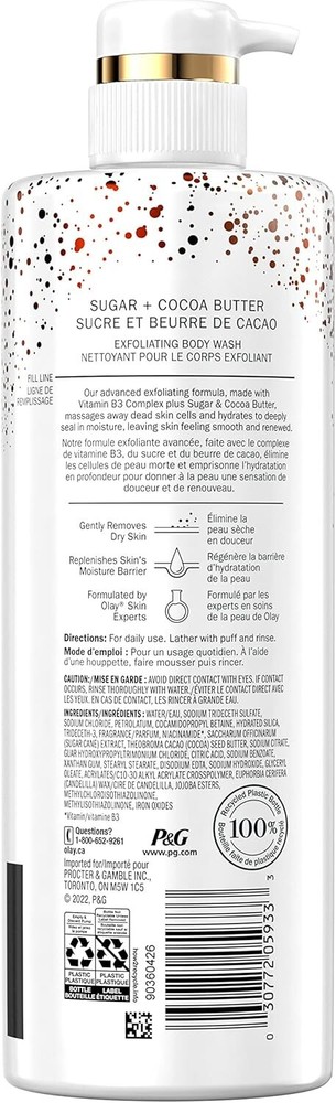 OLAY PREMIUM EXFOLIATING & MOISTURIZING Body Wash SUGAR COCOA BUTTER 591ML Product Features Gentle exfoliation: contains sugar crystals to help remove dead skin cells, revealing smoother skin.Deep moisturization: infused with cocoa butter and vitamin b3 complex to hydrate and replenish skin.Dermatologist-tested: suitable for all skin types, including sensitive skin.Rich, creamy lather: provides a luxurious shower experience.Pleasant fragrance: leaves a subtle, sweet scent of sugar and cocoa butter.Generous size: 591ml bottle offers long-lasting use. Product Description Indulge in the luxurious care of olay premium exfoliating & moisturizing body wash with sugar cocoa butter. This dermatologist-tested body wash is formulated to gently exfoliate and hydrate your skin, leaving it feeling soft, smooth, and nourished. Enriched with vitamin b3 complex, it helps to replenish and maintain your skin's natural moisture barrier. The delightful scent of sugar and cocoa butter provides a soothing and refreshing shower experience.