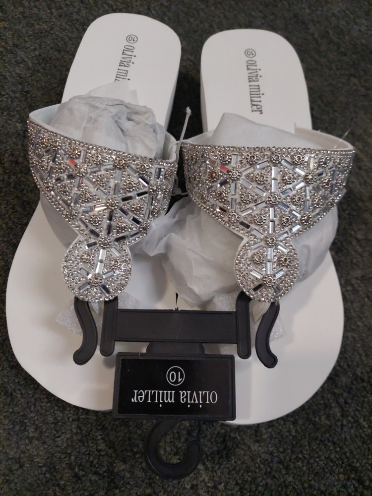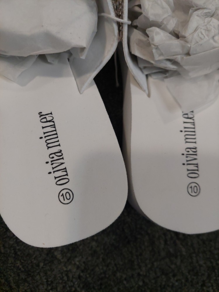 Olivia Miller Women's White Faux Leather Flip Flop Sandals in size 10 offer a stylish and comfortable option for warm weather wear. Made with a faux leather upper material, these sandals are perfect for casual outings and everyday use.