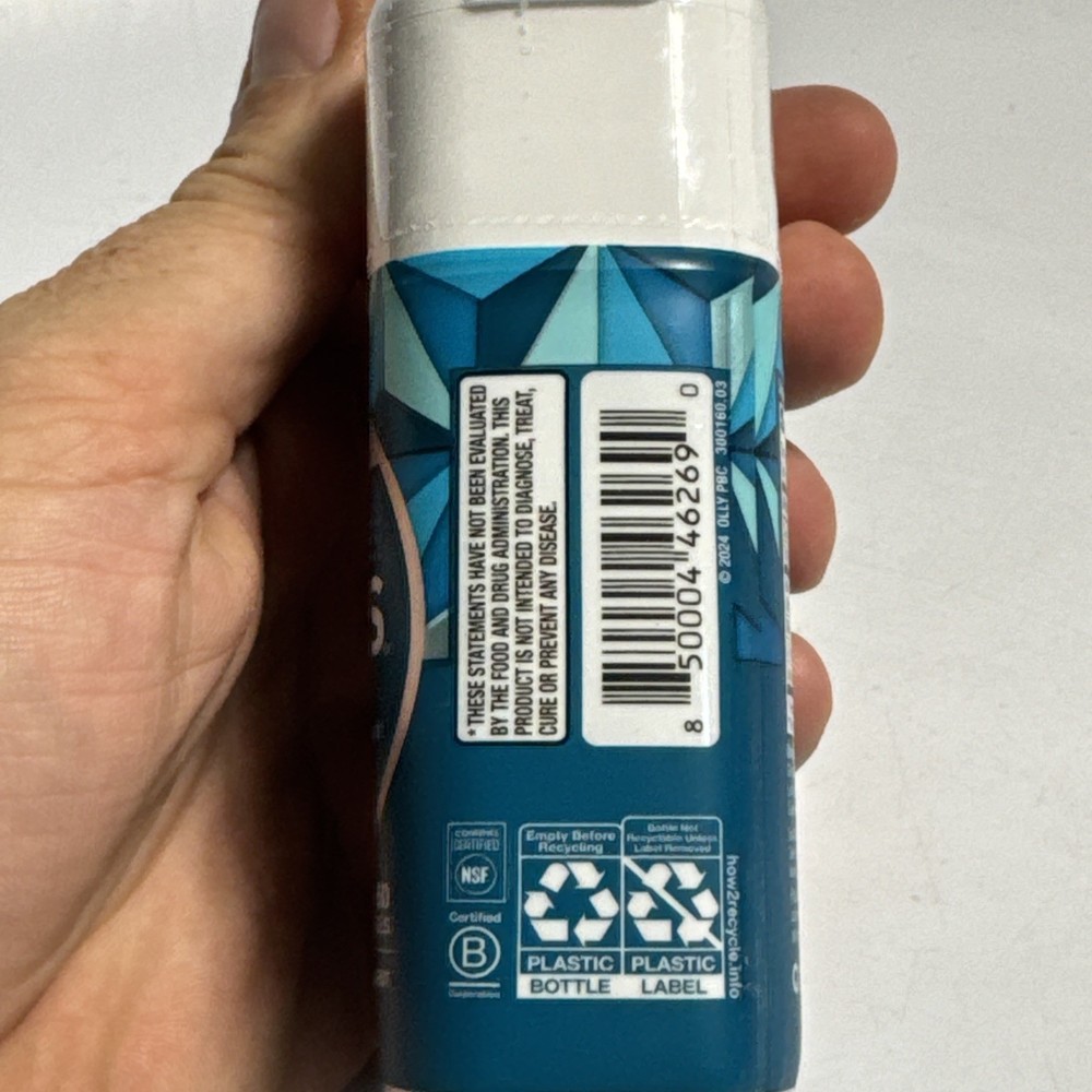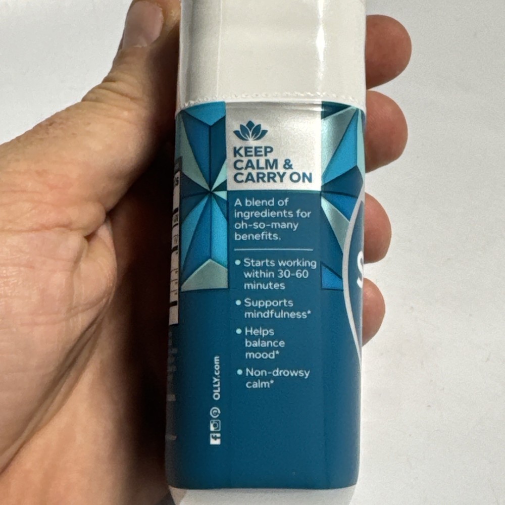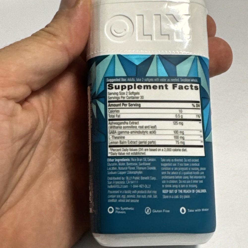 UPC: 0850004462690 Brand: Olly Item Weight: 4 oz Main Purpose: General Wellness, Mood & Emotional Support, Brain & Nervous System Health Volume: 60 Count GTIN: 0850004462690 Dosage: 400 mg Features: Allergen-Free, Caffeine-Free, Gluten-Free, Aspartame-Free, Talc Free, No Artificial Flavors, NSF Certified, Aluminum-Free, All Natural, Stimulant-Free, Lactose-Free, Fragrance-Free, Burp Free, Dairy-Free, Easy to Swallow, No High Fructose Corn Syrup, Organic, Vegan, No Artificial Sweeteners, Hypoallergenic, B Corp Certified, Alcohol Free, Animal Cruelty-Free, Sugar-Free Ingredients: Citric Acid, GABA (Gamma Aminobutyric Acid), L-Theanine, Caffeine, Gelatin, Verbena, Ashwagandha, Water, Multivitamin, Lemon Balm (Melissa officinalis) gtin13: 0850004462690 Active Ingredients: Chlorophyllin, Water, Verbena, GABA (Gamma Aminobutyric Acid), L-Theanine, Gelatin When to Take: Before Meal, During Workout, Before Workout, After Meal, After Workout Number of Pills: 60 Formulation: Softgel, Gummy, Gel
