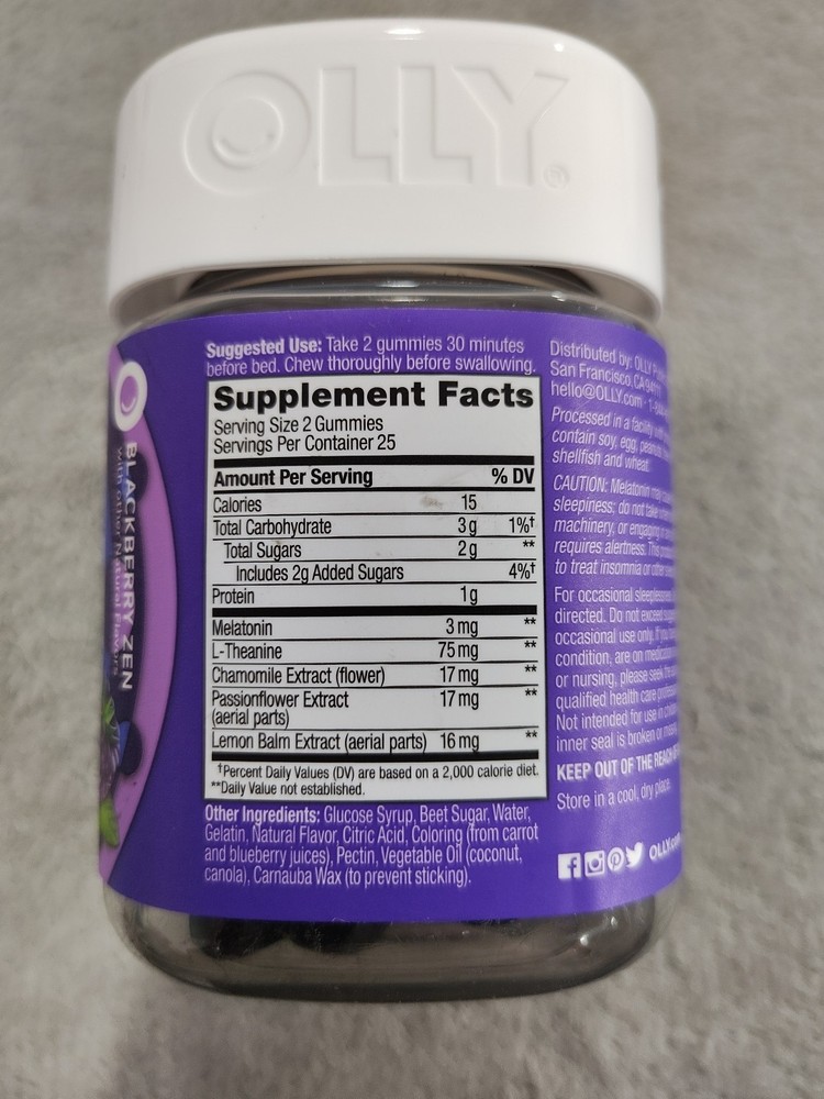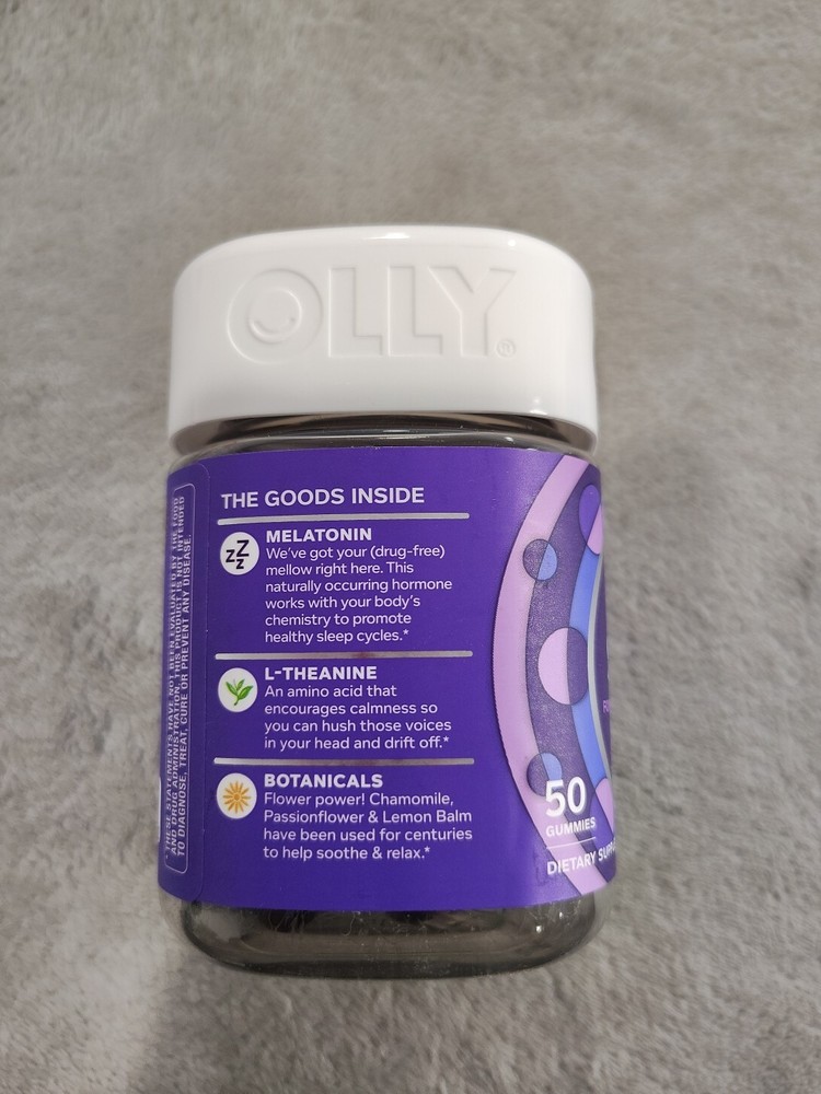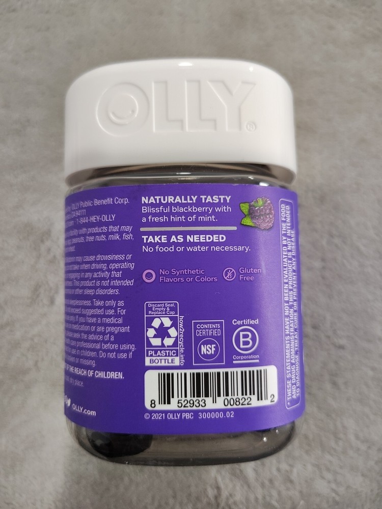 gtin13: 0852933008222 Volume: 0.1 fl oz UPC: 0852933008222 GTIN: 0852933008222 Features: All Natural, Aspartame-Free, B Corp Certified, Aluminum-Free, NSF Certified, Non-GMO, Casein-Free, Organic, No Artificial Sweeteners, BPA-Free, No Artificial Flavors, Gluten-Free, Vegan, Allergen-Free, Alcohol Free Item Weight: 8 oz Formulation: Gummy Active Ingredients: Blackberry, 1-Deoxynojirimycin (DNJ), L-Theanine, Vitamin A Main Purpose: Cognitive Health, Men's Health, General Wellness, Sleep Support, Women's Health, Menopause Support Number of Pills: 50 Brand: Olly Ingredients: Chamomile, Pectin, L-Theanine, Passionflower (Passiflora), Gelatin, Lemon Balm (Melissa officinalis), Blackberry, Water, Citric Acid When to Take: After Meal