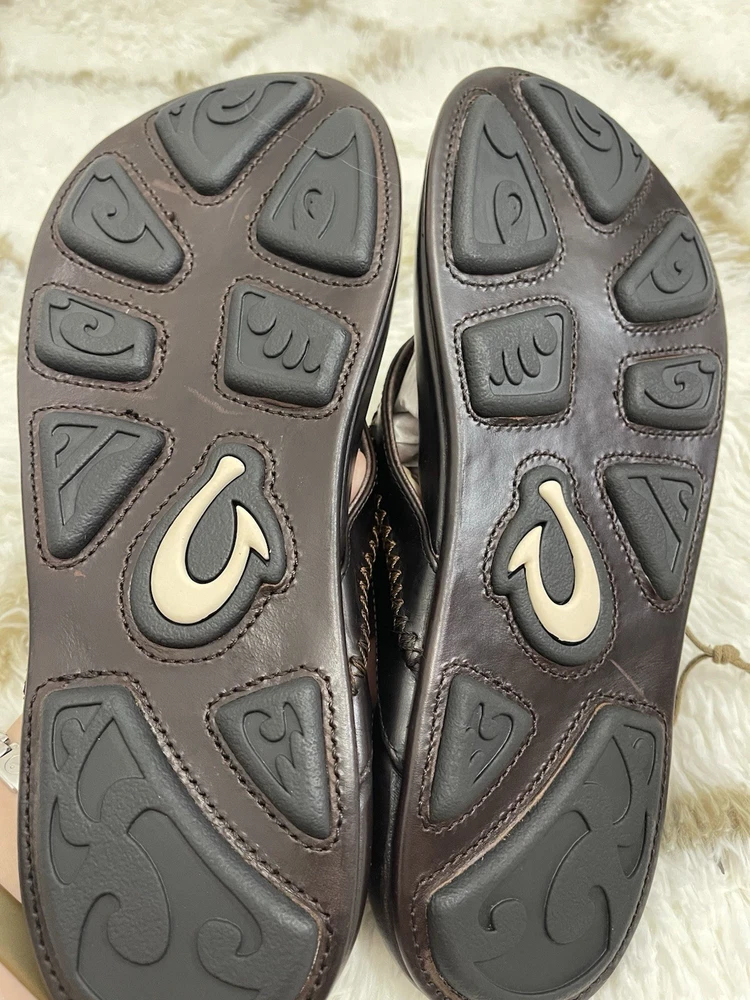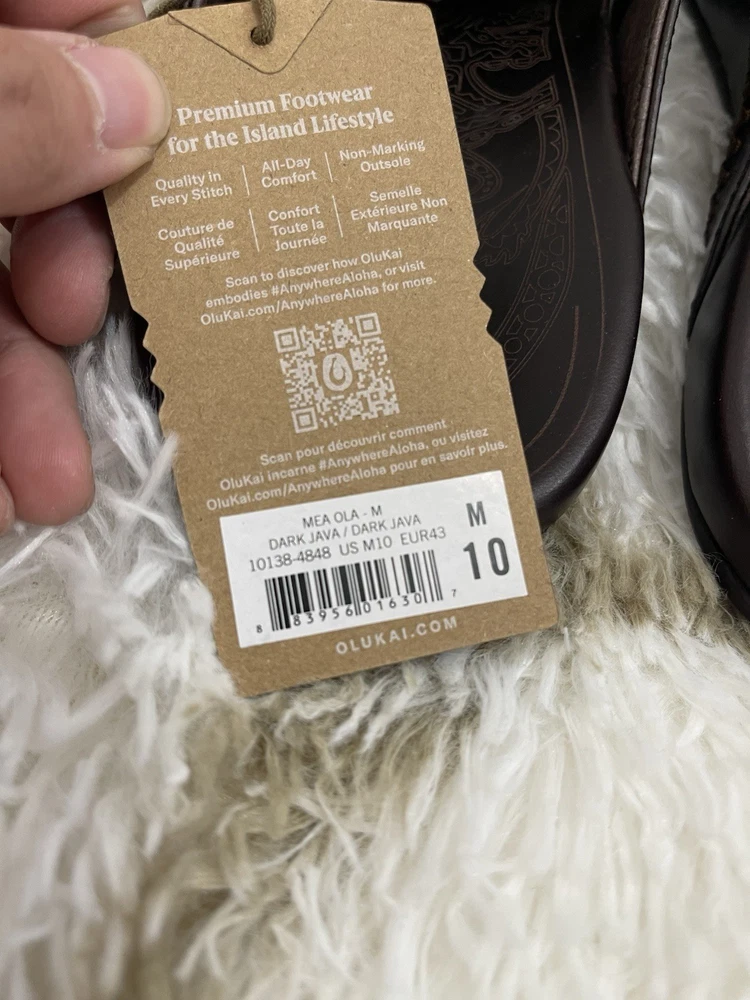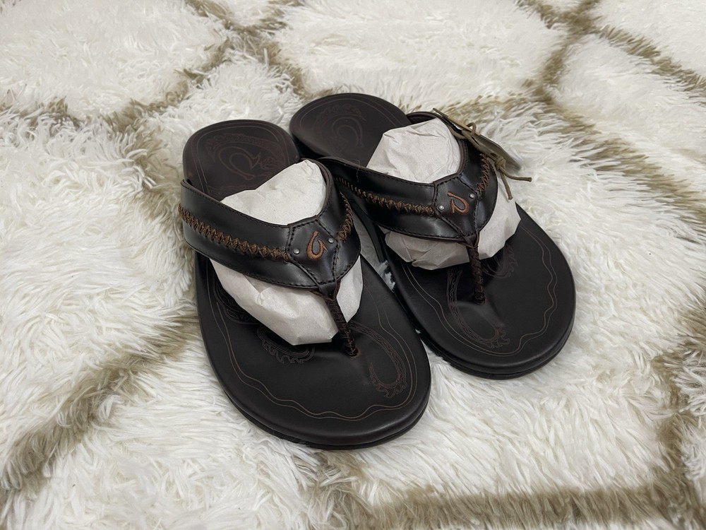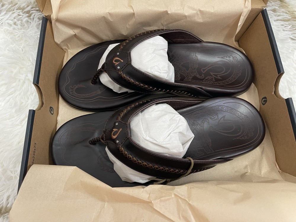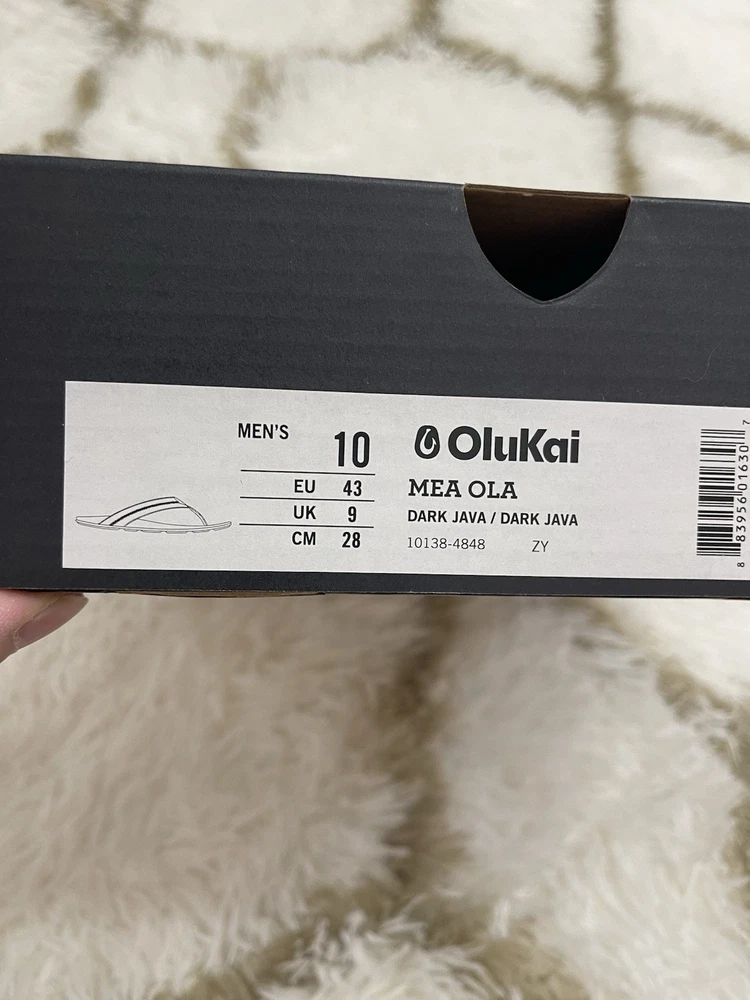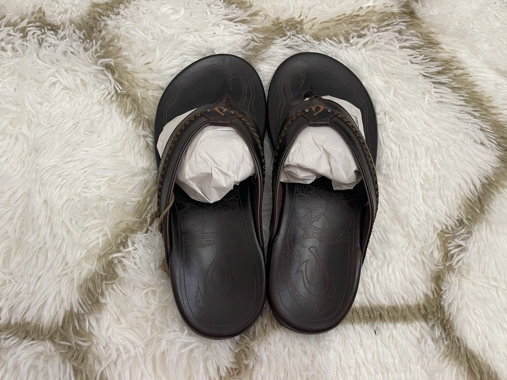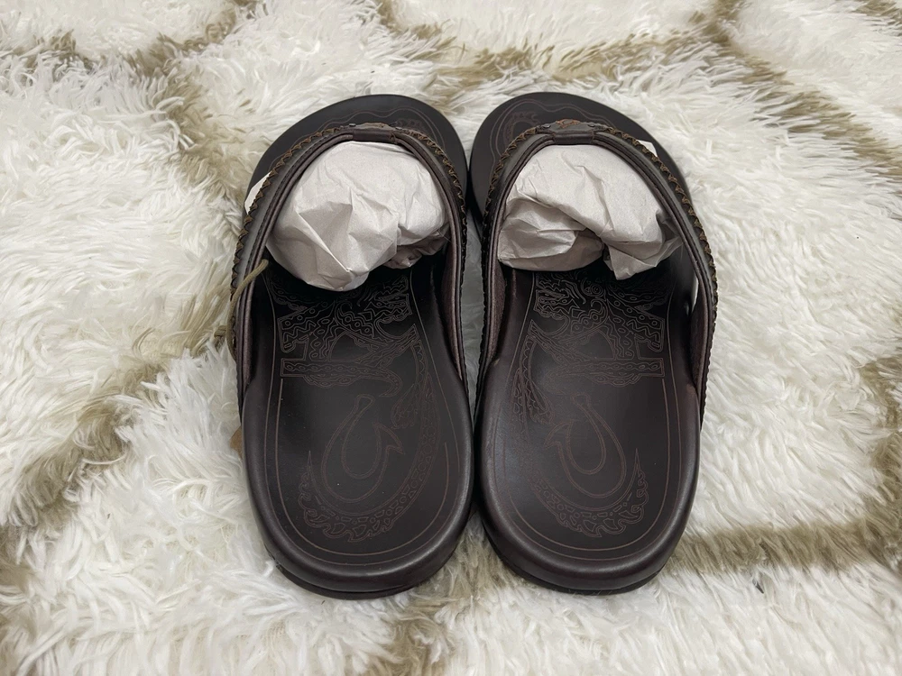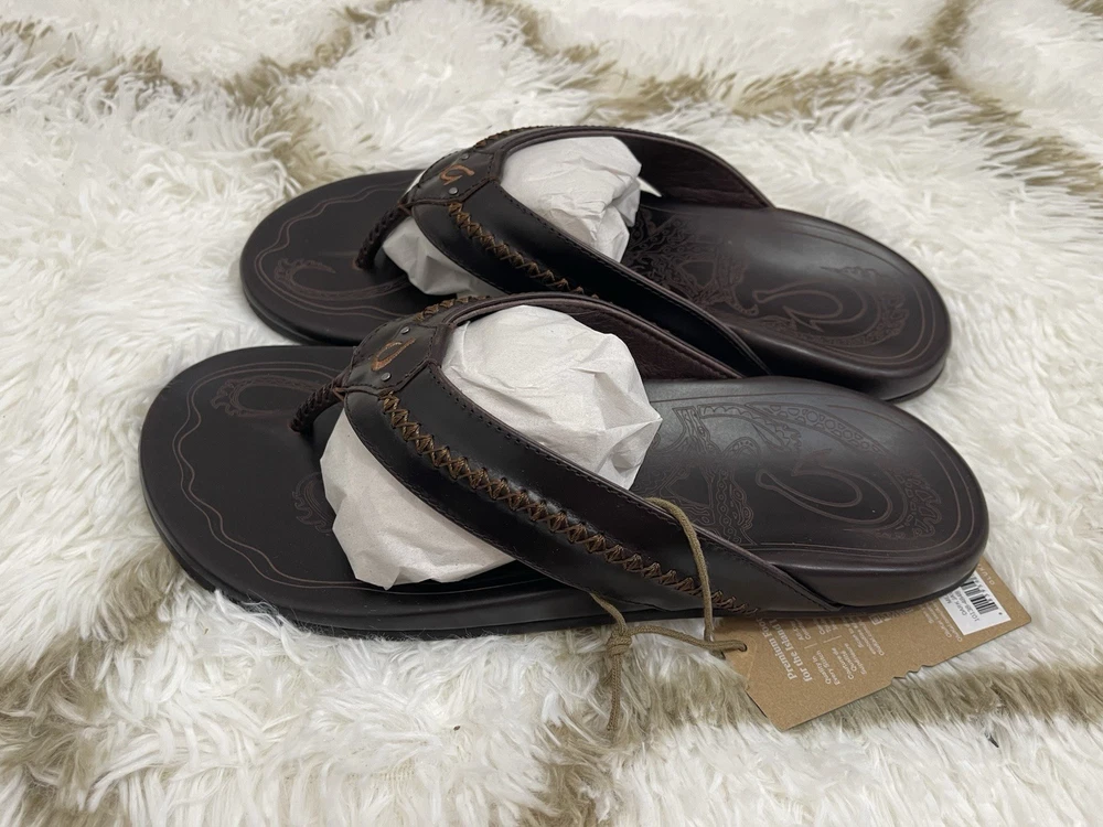 Brand New with box 100% authentic Men's size 10 Color Dark Java/ Dark Java All sales are final, pleae make sure it's the right size before ordering Fast shipping via UPS Ground OluKai Craftsmanship: Includes octopus-inspired laser-etched artwork on the footbed, canoe lash whipstitching, and an embroidered logo for a distinctive touch. Comfort and Fit: Features rich leather straps, a soft microfiber lining, and a comfortable handsewn toe post for a snug fit. Premium Materials: Crafted with premium full-grain leather for a luxurious and durable finish.