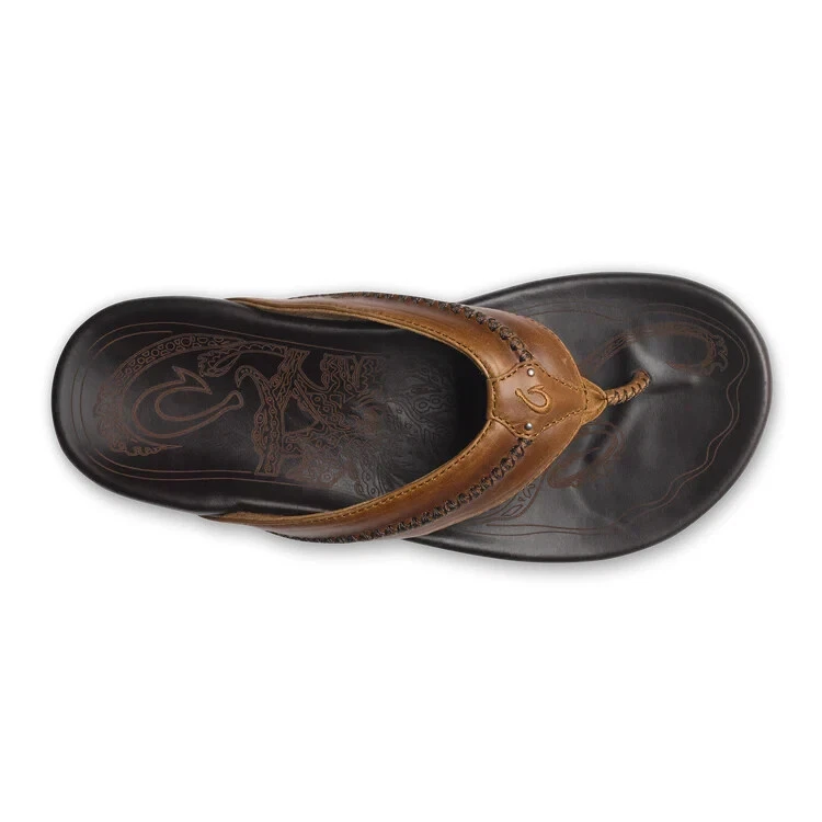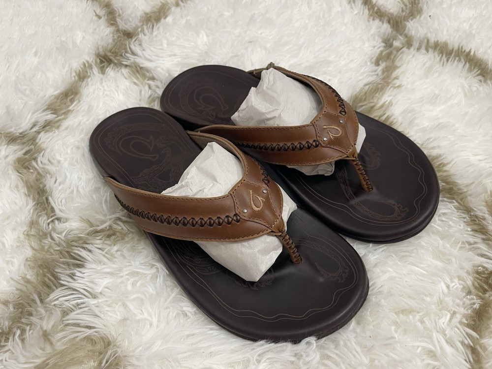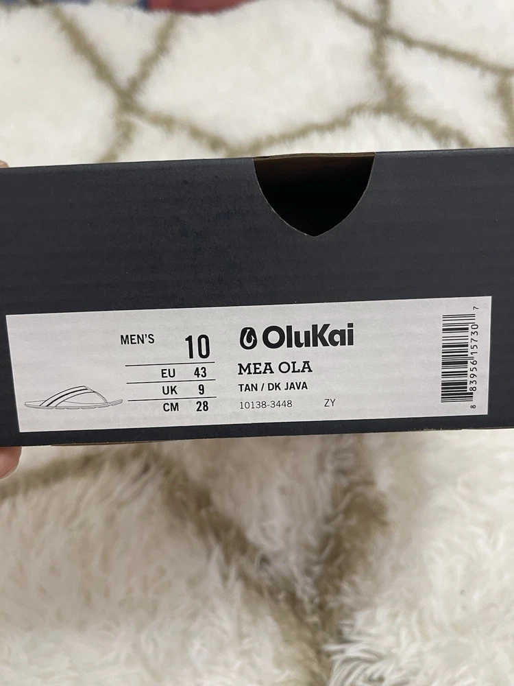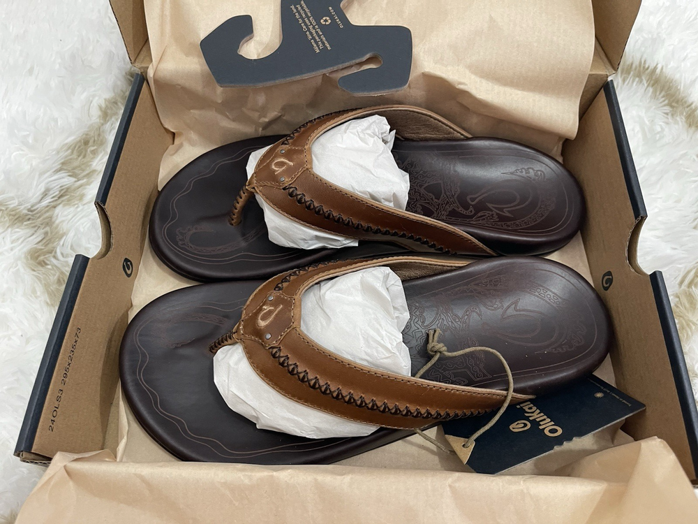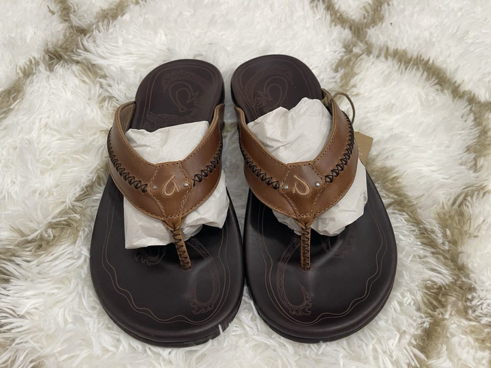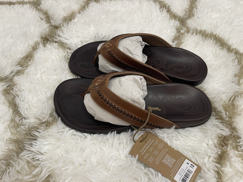 Brand New with box 100% authentic Men's size 10 Color Tan/ Dark Java All sales are final, pleae make sure it's the right size before ordering Fast shipping via UPS Ground OluKai Craftsmanship: Includes octopus-inspired laser-etched artwork on the footbed, canoe lash whipstitching, and an embroidered logo for a distinctive touch. Comfort and Fit: Features rich leather straps, a soft microfiber lining, and a comfortable handsewn toe post for a snug fit. Premium Materials: Crafted with premium full-grain leather for a luxurious and durable finish.