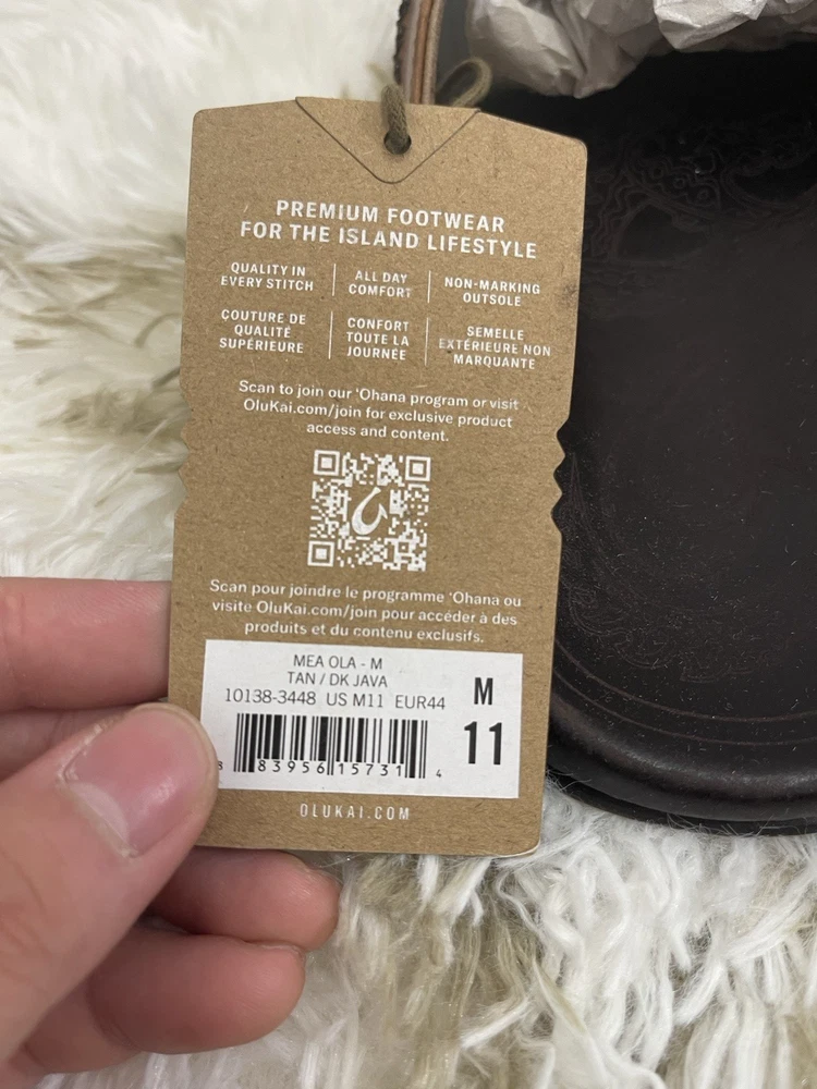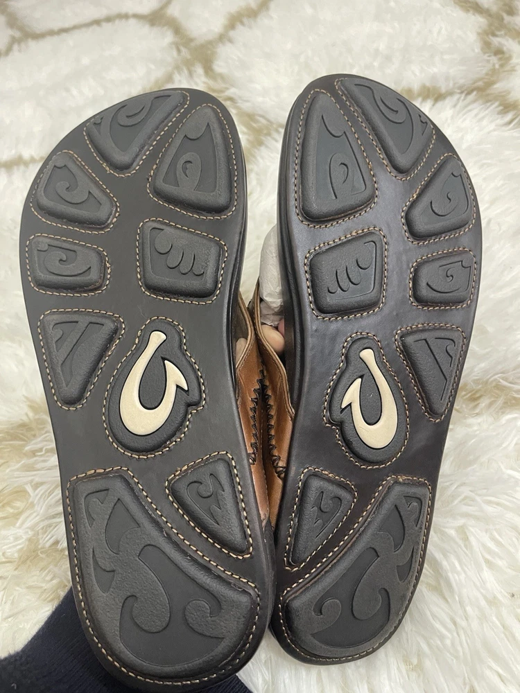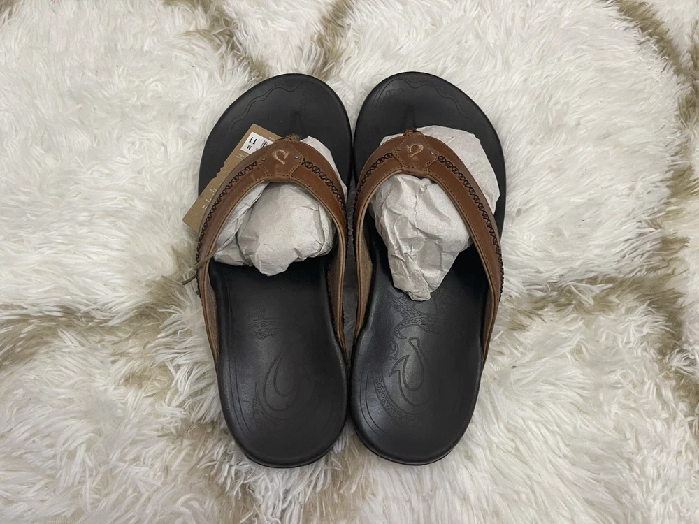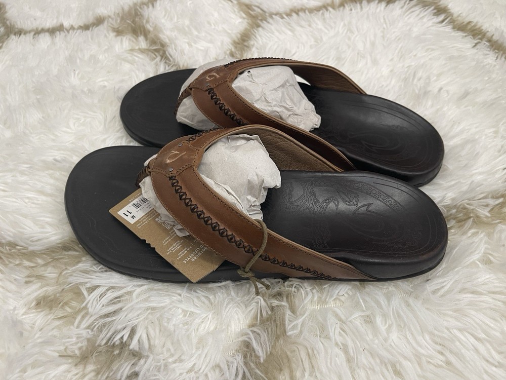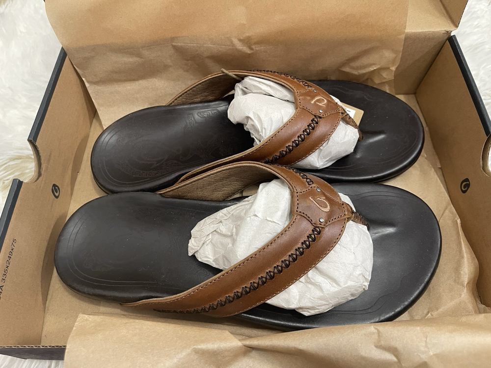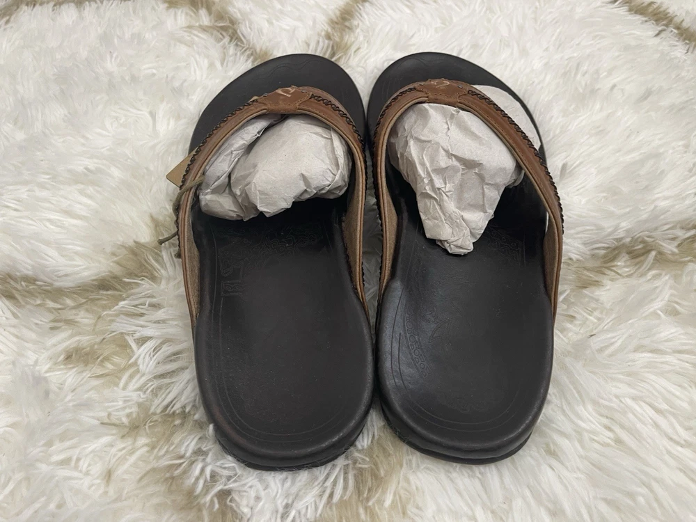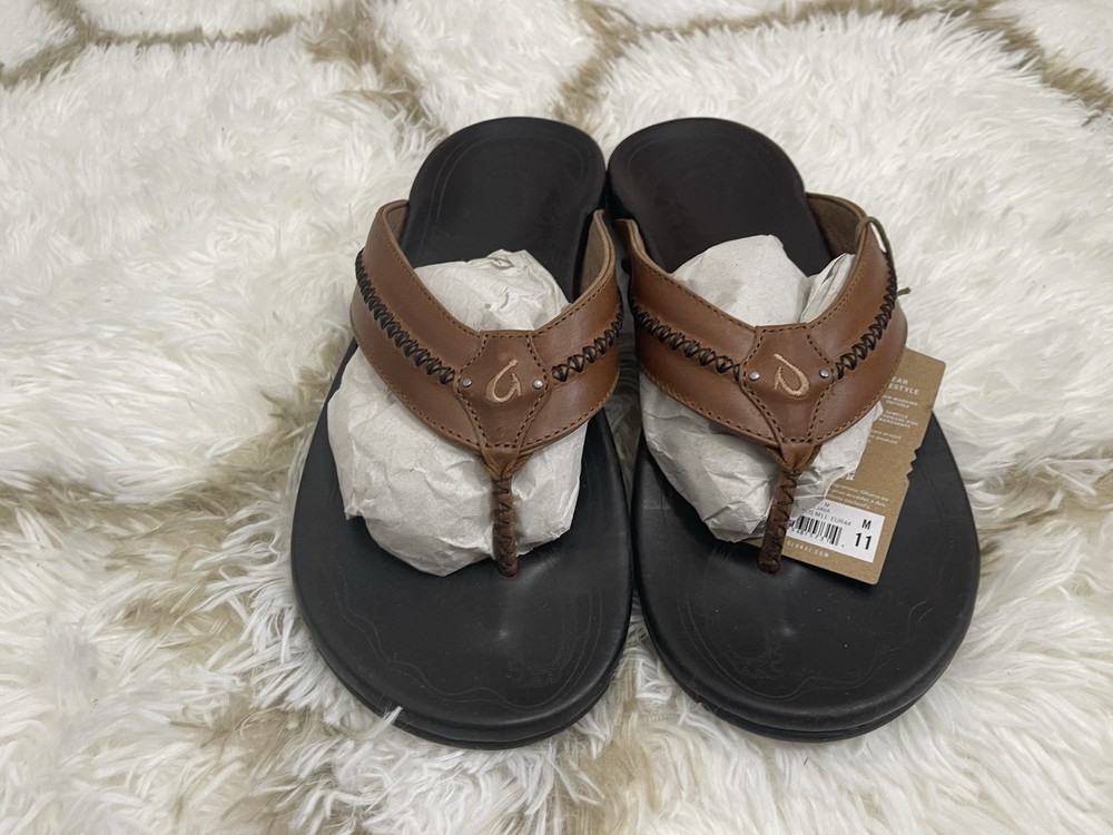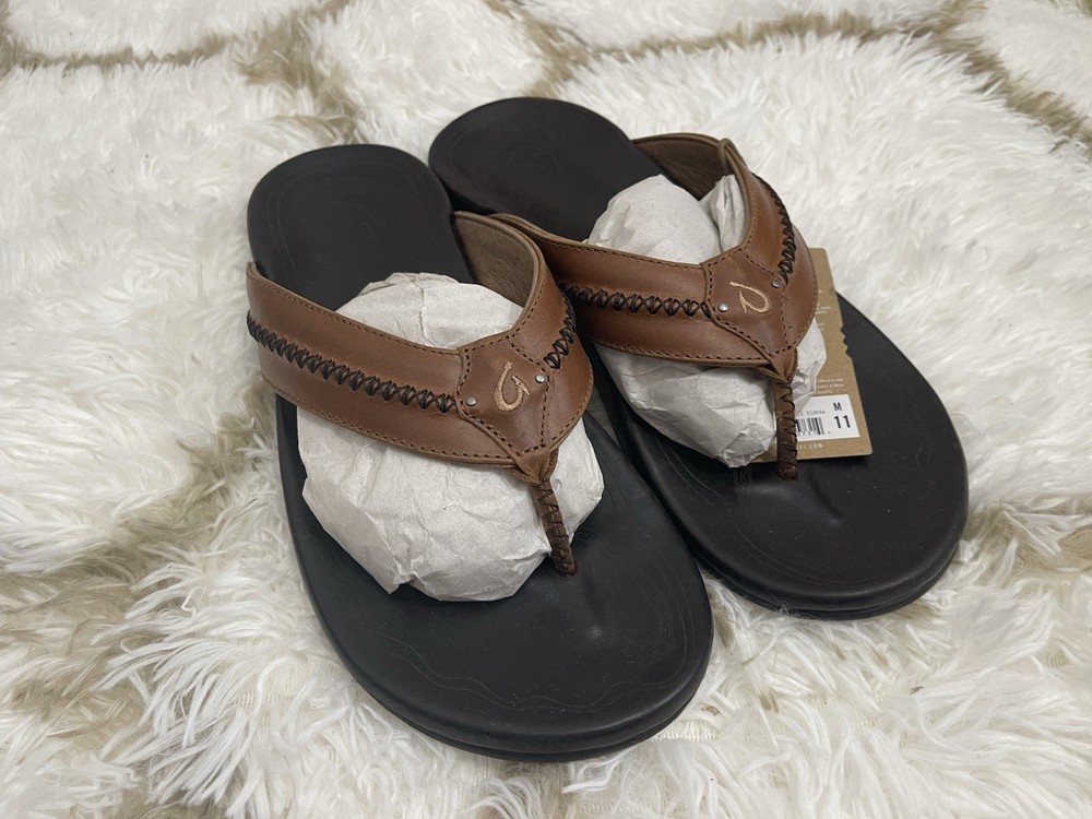 Brand New with box 100% authentic Men's size 11 Color Tan/ Dark Java All sales are final, pleae make sure it's the right size before ordering Fast shipping via UPS Ground OluKai Craftsmanship: Includes octopus-inspired laser-etched artwork on the footbed, canoe lash whipstitching, and an embroidered logo for a distinctive touch. Comfort and Fit: Features rich leather straps, a soft microfiber lining, and a comfortable handsewn toe post for a snug fit. Premium Materials: Crafted with premium full-grain leather for a luxurious and durable finish.