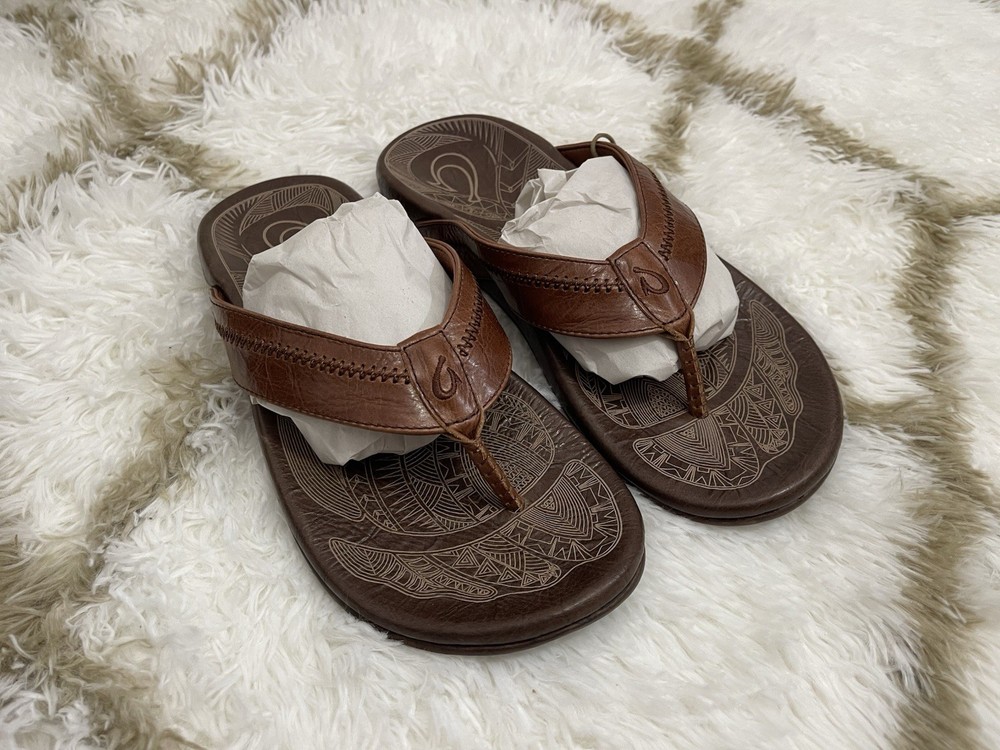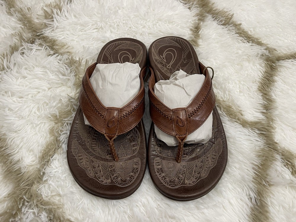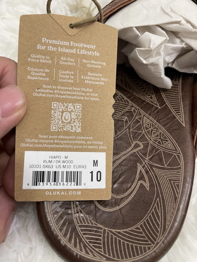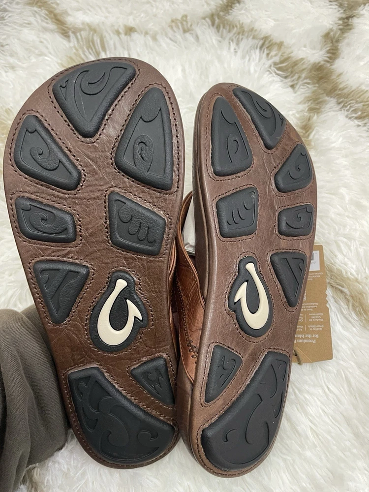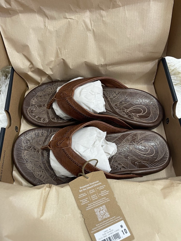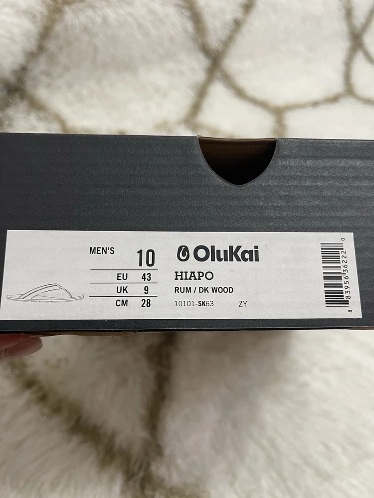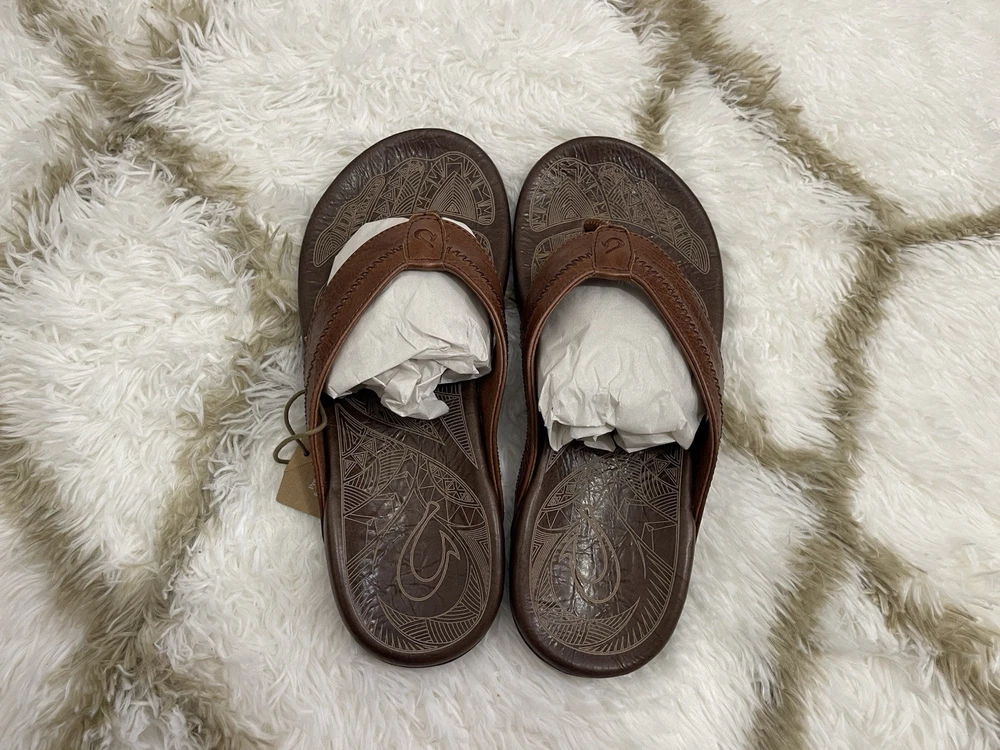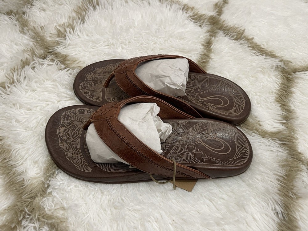 Brand New with box 100% authentic Men's size 10 Color Rum/Dark Wood All sales are final, pleae make sure it's the right size before ordering Fast shipping via UPS Ground Key Features: Premium Materials: Constructed with naturally tumbled or marbled full-grain leather, enhancing its aesthetic and durability. OluKai Craftsmanship: Features handsewn traditional whipstitching and moko tattoo artwork on the footbed, showcasing unique cultural artistry. Enhanced Traction: A full-grain leather-wrapped outsole with non-marking rubber traction pods ensures superior grip and flexibility and is perfect for various surfaces.