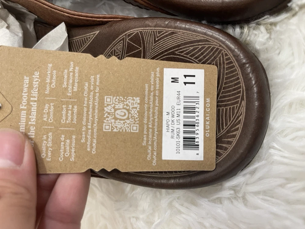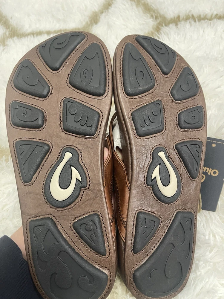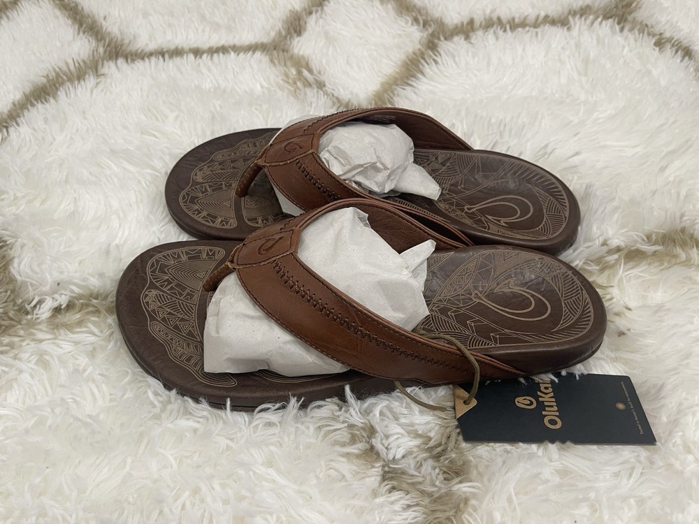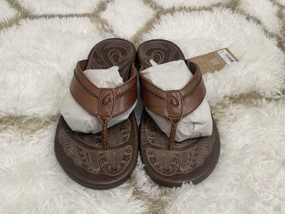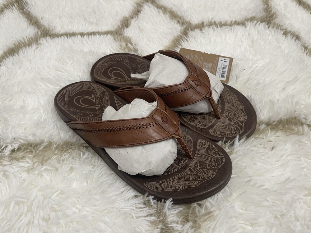 Brand New with box 100% authentic Men's size 11 Color Rum/Dark Wood All sales are final, pleae make sure it's the right size before ordering Fast shipping via UPS Ground Key Features: Premium Materials: Constructed with naturally tumbled or marbled full-grain leather, enhancing its aesthetic and durability. OluKai Craftsmanship: Features handsewn traditional whipstitching and moko tattoo artwork on the footbed, showcasing unique cultural artistry. Enhanced Traction: A full-grain leather-wrapped outsole with non-marking rubber traction pods ensures superior grip and flexibility and is perfect for various surfaces.