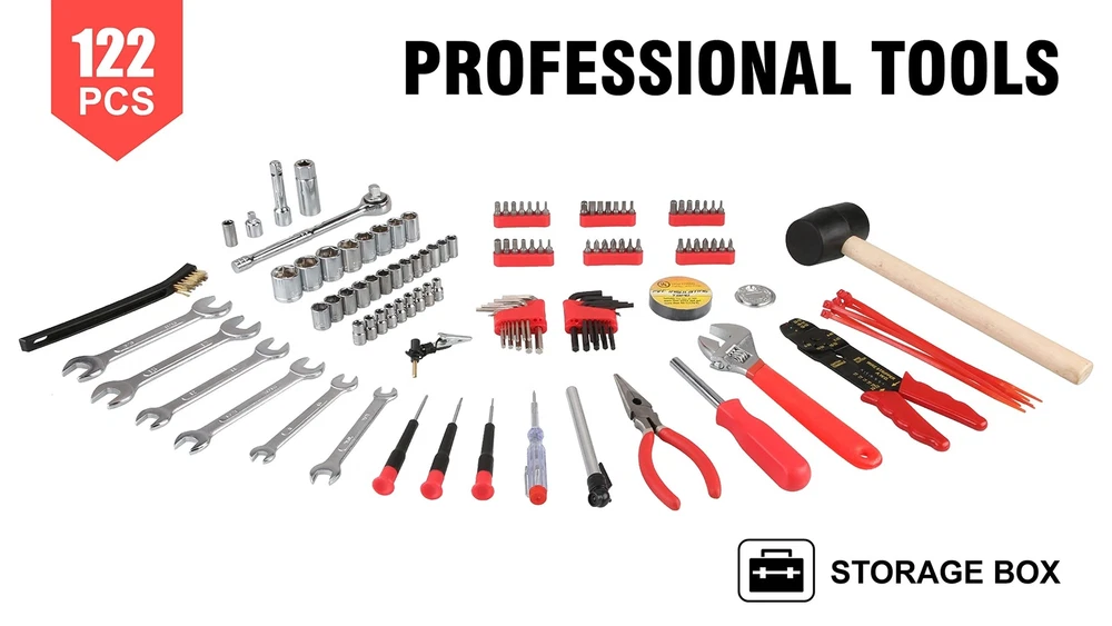 Olympia Tools 122-Piece Tool Kit, General Household Hand Tool Set with Solid Carrying Tool Box, Auto Repair Tool Sets Product Details Brand: Olympia Tools Number of Items: 122 Head Style: Phillips Material: Alloy Steel Color: Red, Silver, Black Brand: Olympia Tools Number of Items: 122 Head Style: Phillips Material: Alloy Steel Color: Red, Silver, Black Recommended Uses For Product: Home Improvement, Auto Repair Special Feature: Magnetic Tip Model Name: Olympia Tools UPC: 883652809999 Manufacturer: Olympia Tools Part Number: 80-999 Item Weight: 8.93 pounds Package Dimensions: 15.98 x 13.5 x 3.5 inches Country of Origin: China Item model number: 80-999 Is Discontinued By Manufacturer: No Power Source: Hand Powered Item Package Quantity: 1 Special Features: Magnetic Tip Included Components: 41 - 1" BITS WITH 6 INJECTION HOLDERS Batteries Included?: No Batteries Required?: No Date First Available: October 18, 2014 HIGH QUALITY & STANDARDS: Forged from high-quality steel, strength, durability, anti-corrosion protection. All the tools meet or exceed ANSI critical standards BACK ON ROAD: For car, bike and engine repairs and maintenance, our Tool Kit Set with SAE and Metric Tools contains a carefully selected assortment of the most reached for DIY hand tools and accessories. Complete in a tool box carry case for easy storage in the trunk, boot or under a seat MADE TO LAST: Our durable and long-lasting tools help you with home, garage & industrial projects. With professional-grade quality, easily repair & fix issues with our tool cabinet essentials. THE RIGHT TOOL FOR THE JOB: We engineer a range of bolt cutters, clamps, chisels, folding carts, hammers, pliers, saws, screwdrivers, tape measures, utility knives, vises, bolt cutters, saws & wrenches. THE RIGHT TOOL FOR THE JOB: We engineer a range of bolt cutters, clamps, chisels, folding carts, hammers, pliers, saws, screwdrivers, tape measures, utility knives, vises, bolt cutters, saws & wrenches. SUPERIOR INSTRUMENTS: Olympia Tools provides quality & innovative hand & specialty tools, tool accessories & outdoor equipment for construction, woodworking, mechanical maintenance & home repair. SELECTION OF POPULAR TOOLS FOR HOME, GARAGE, & JOB SITE BLOW MOLD CASE FOR EASY STORAGE DROP FORGED HEAD TREATED ALLOY STEEL