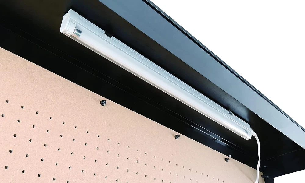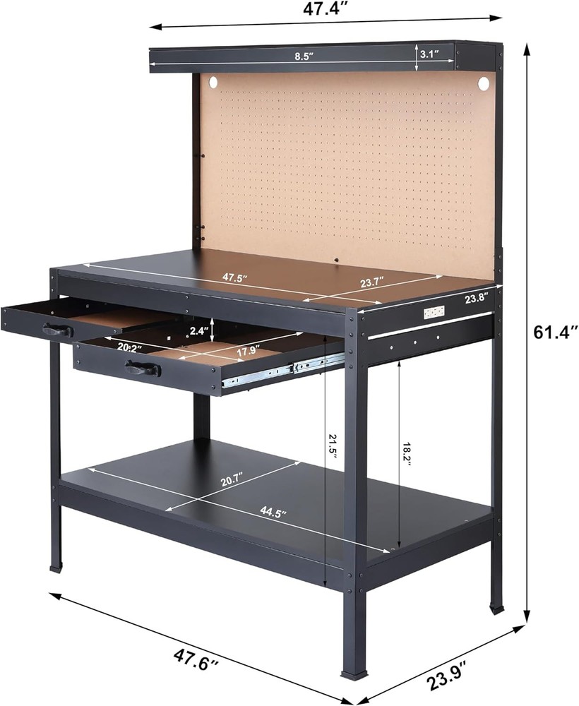 Olympia Tools Multipurpose Workbench With Power Outlets and Light, Black Product Details Material: Alloy Steel Brand: Olympia Tools Product Dimensions: 23.75"D x 47.25"W x 61"H Color: Black Item Weight: 94.8 Pounds Finish Type: Painted Base Type: Leg Frame Material: Heavy-duty Steel Load Capacity: 220 Pounds Assembly Required: Yes Manufacturer: Olympia Tools Item Weight: 94.8 pounds Item model number: 410-014-0111 Finish types: Painted Batteries required: No Included Components: Workbench, instruction, and workbench parts WORK BENCH: This multipurpose bench is ideal for your next project. It features peg board for tool storage, a 13-watt fluorescent cabinet light, two slide drawers and built-in three outlet grounded power strip. CARPENTRY & ASSEMBLY: Heavy-duty steel construction with a durable enamel finish. 80-Inch power cord. Tabletop load capacity: 220 pounds. Top shelf load capacity: 44 pounds. MADE TO LAST: Our durable and long-lasting tools help you with home, garage & industrial projects. With professional-grade quality, easily repair & fix issues with our tool cabinet essentials. THE RIGHT TOOL FOR THE JOB: We engineer a range of bolt cutters, clamps, chisels, folding carts, hammers, pliers, saws, screwdrivers, tape measures, utility knives, vises, bolt cutters, saws & wrenches. SUPERIOR INSTRUMENTS: Olympia Tools provides quality & innovative hand & specialty tools, tool accessories & outdoor equipment for construction, woodworking, mechanical maintenance & home repair.
