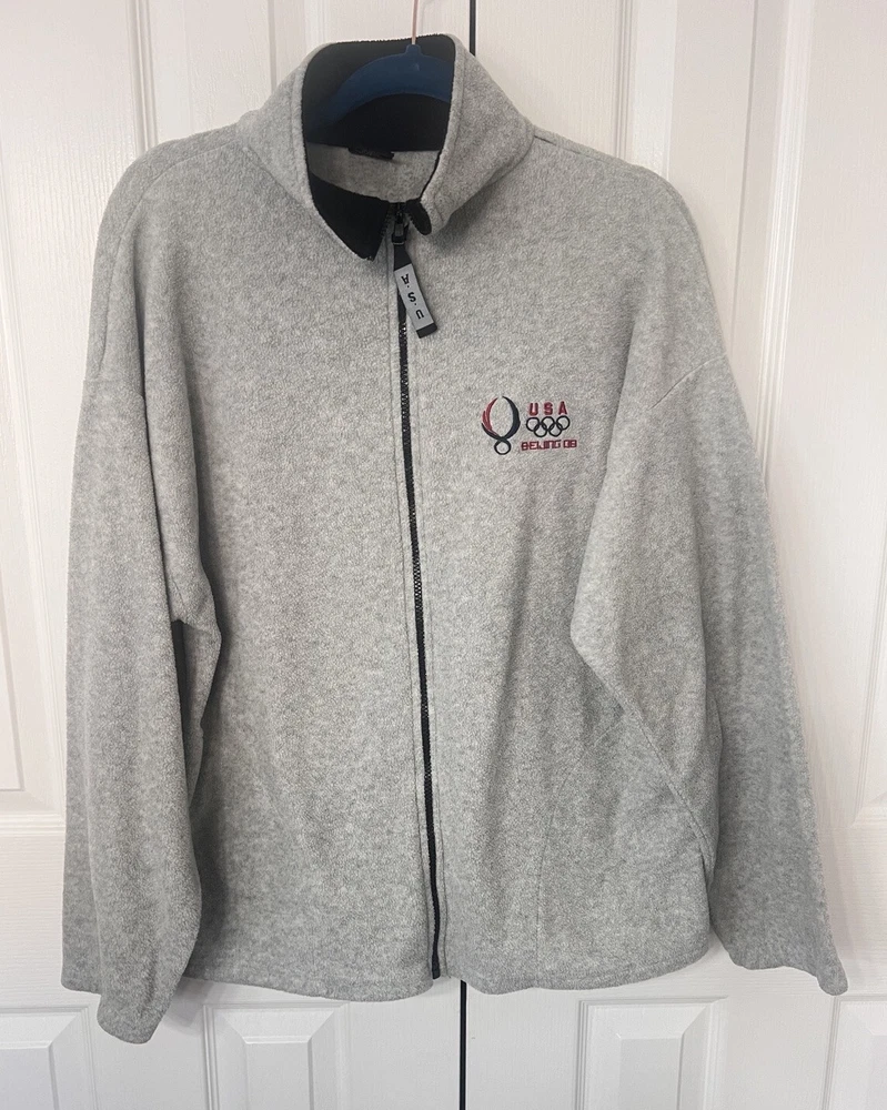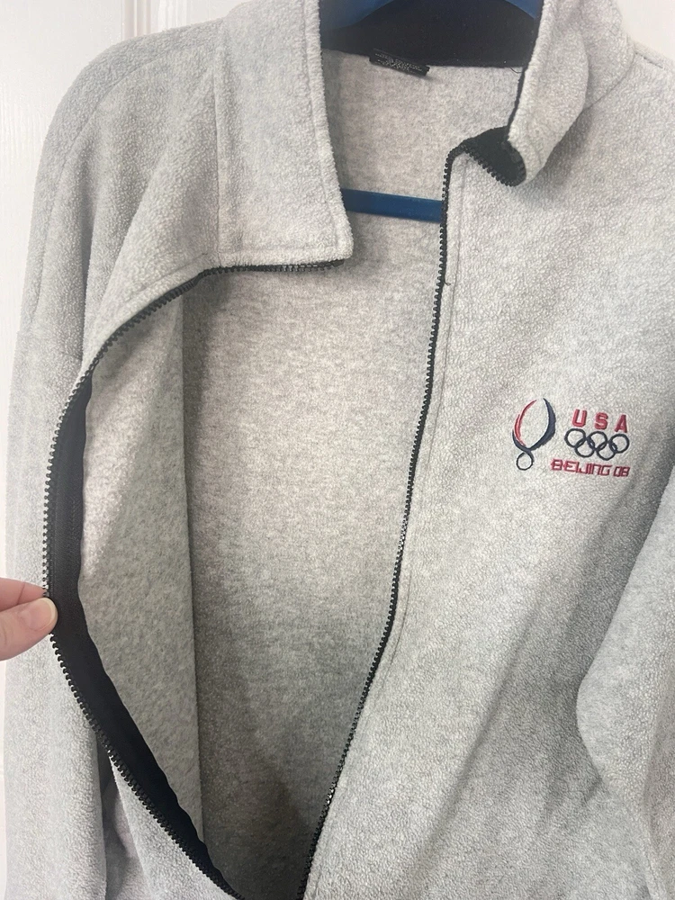 Olympic Beijing Womens Jacket. Gray Color, Long Sleeve, Hand Pockets, Zip-Up, Waist-Length Very Soft and Cozy Size: Large Great Condition! I do not know the history of this piece, please look at measurements for fit. Comes from a Pet-Free and Smoke-Free Home Please contact me if you have any questions