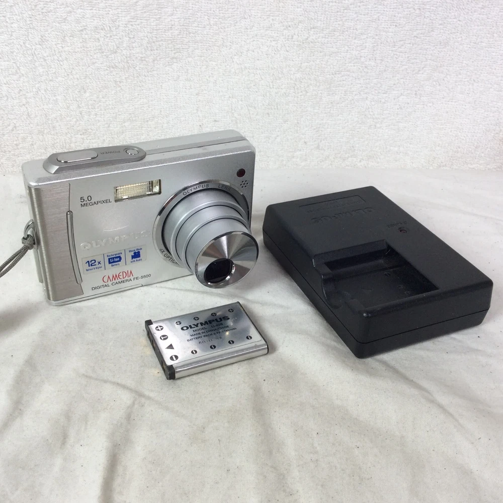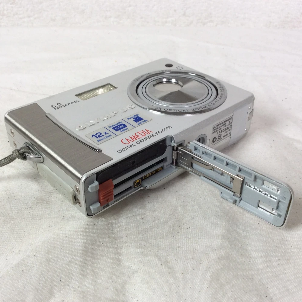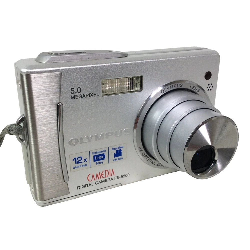 The Olympus Camedia FE-5500 Digital Camera is a compact camera with a maximum resolution of 5.0 MP and a 3x optical zoom. It features a maximum aperture of f/2.8 and a digital zoom of 4x, providing versatile shooting options. The camera comes in a sleek silver colour and includes a lithium-ion battery, charger, and original box. Other notable features include built-in flash, auto focus, dustproof design, and a tripod thread for stability during photography sessions. This camera offers convenience and functionality for capturing high-quality images. In great condition - Optics are clean and clear - Fully working - Comes with Battery, Charger, AV Cable, USB Cable and Manual - BOXED