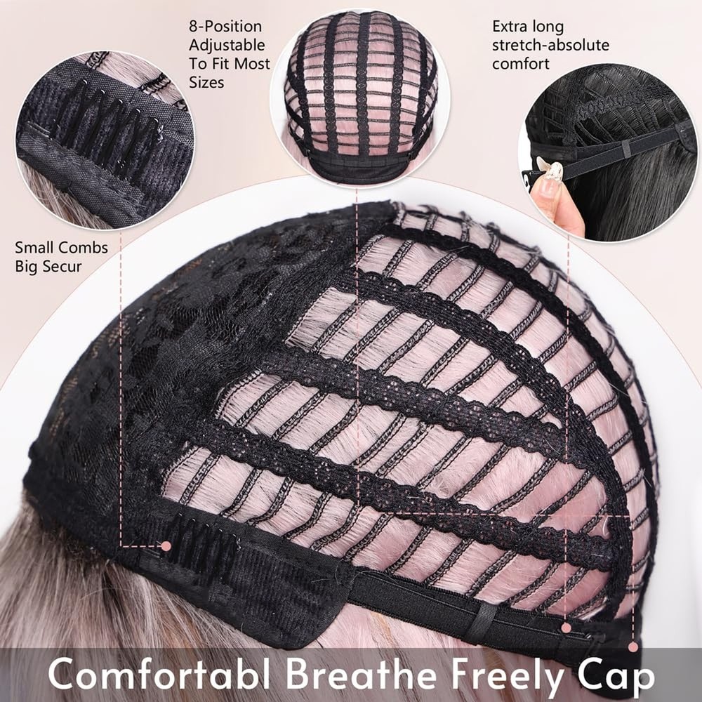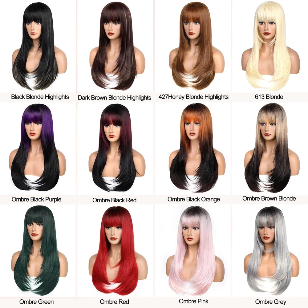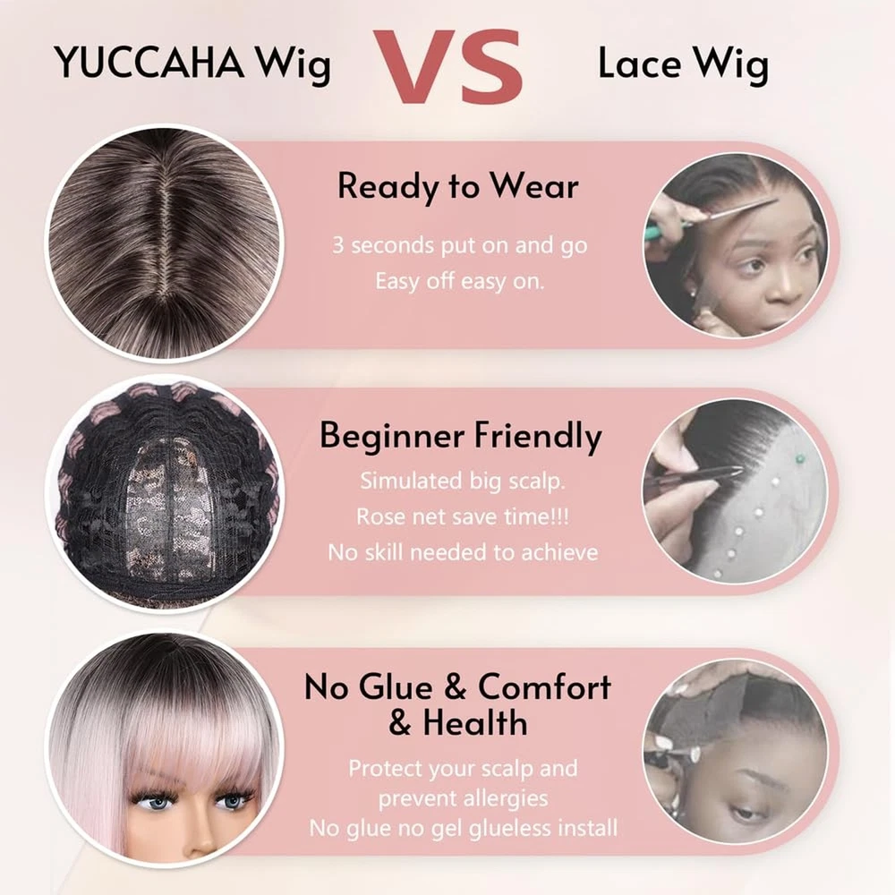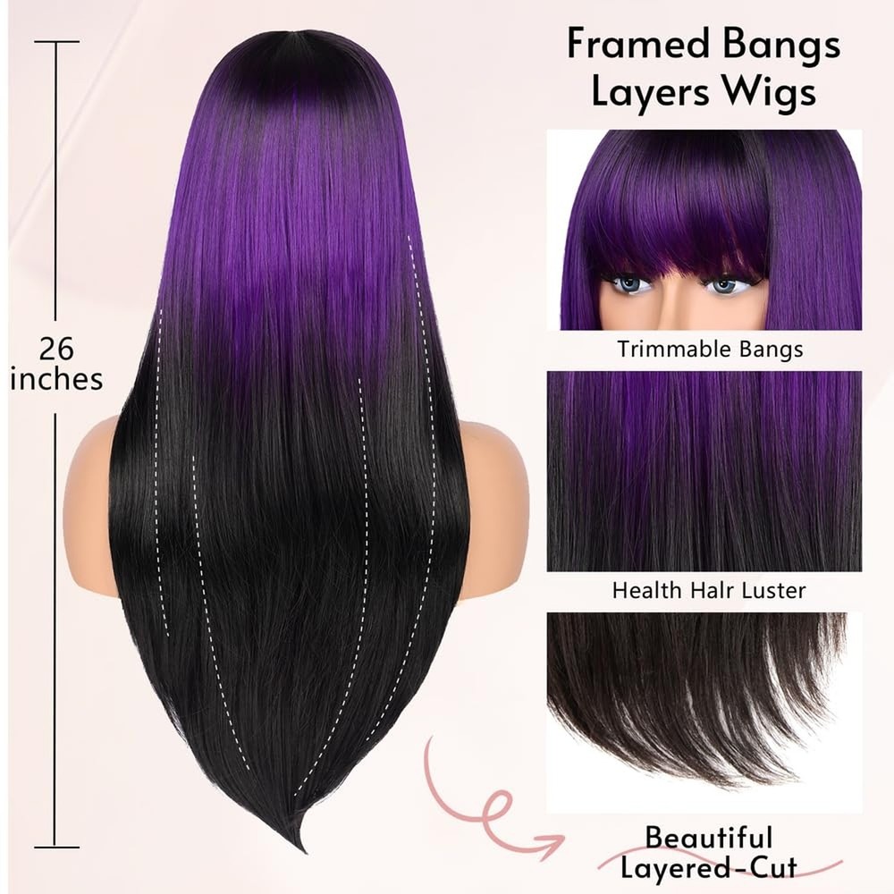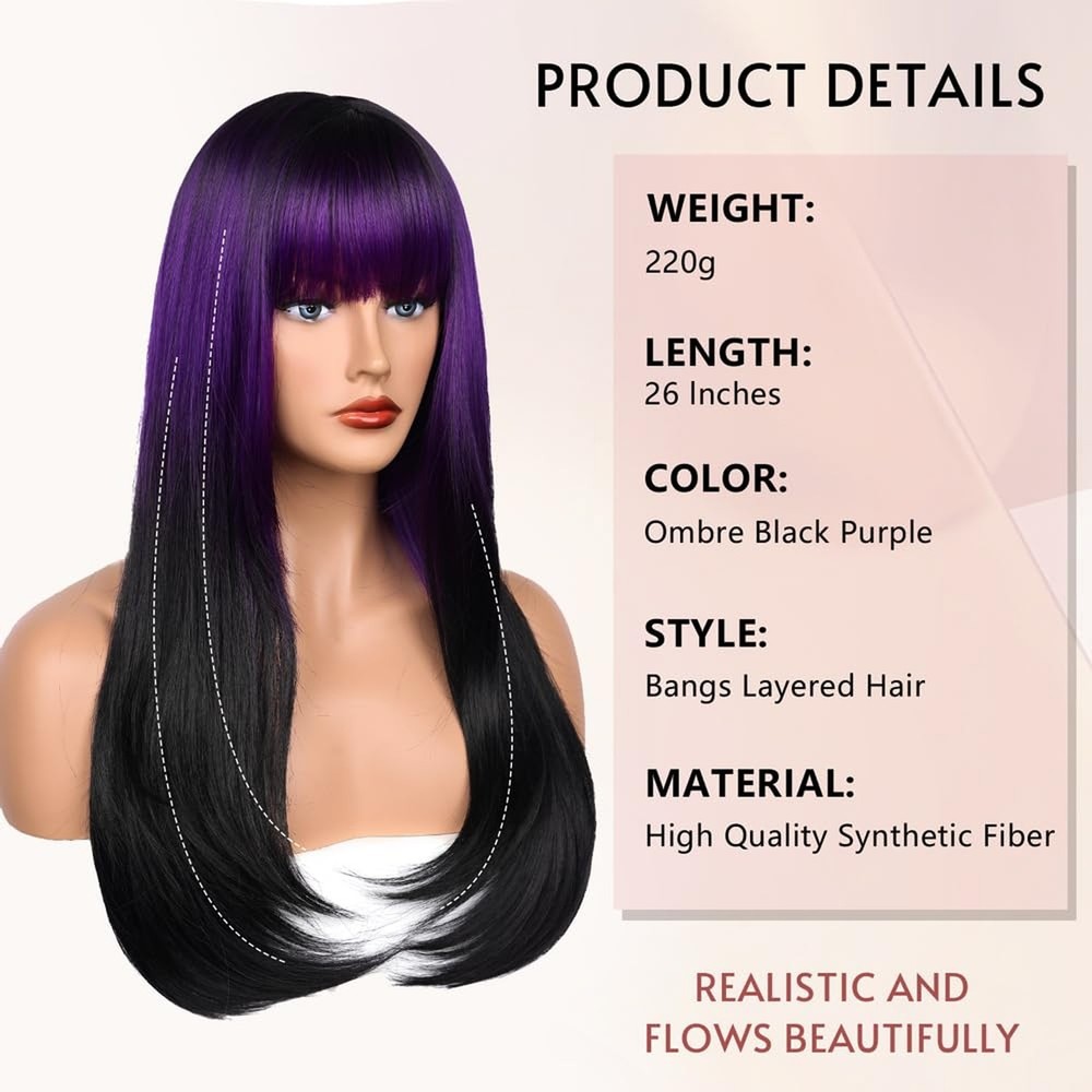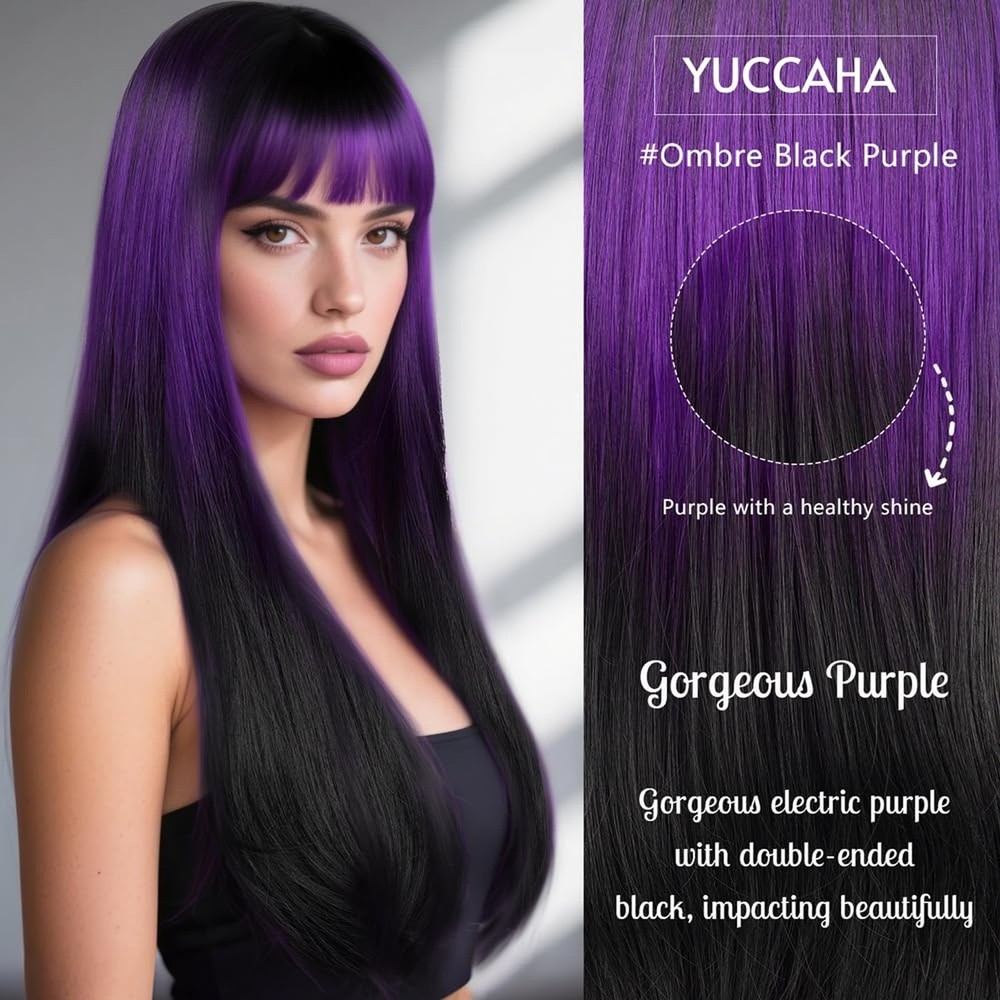 Ombre Black Purple Synthetic layered Wig with Bangs for Women Wear and Go glueless Wig 26 Inch Middle Part Long Straight Colorful Costume Wigs Heat-Resistant Fiber for Daily Party Use Product Details Size: 26 Inch Color: Ombre Black Purple Brand: YUCCAHA MPN: Does not apply UPC: Does not apply EAN: Does not apply Color: Ombre Black Purple Material: High Temperature Fiber Item dimensions L x W x H: 1.18 x 1.57 x 0.79 inches Hair Type: Flat, Long Hair, Normal, Straight Style: Ombre Product Dimensions : 1.18 x 1.57 x 0.79 inches; 7.76 ounces Manufacturer : YUCCAHA Best Sellers Rank: #140,947 in Beauty & Personal Care (See Top 100 in Beauty & Personal Care) #2,768 in Hair Replacement Wigs #2,768 in Hair Replacement Wigs Customer Reviews: 4.0 4.0 out of 5 stars (46) Hair MaterialWig is made of high quality heat resistant synthetic fiber. Using the latest dyeing technology, monochrome, bicolor, gradient ombre, full color. Tasteless, no harm to the skin and healthier; Improvements to the traditional hair, yaki is not knotted and smooth, feather-like touch Wig StyleYUCCAHA bangs high level straight hair is the first choice for daily wigs, 26inch, 220g, light but giving volume. It flows very naturally and realistic, fearless nature, bangs high level not only modifies the shape of the face, but also doubles the naturalness of the hair, suitable for a variety of daily and special occasions Glueless Wig and BenefitsNo lace, no glue, no skill needed! Zero skills install, beginner-friendly! 3 Seconds to wear and remove! Fearless of the camera. None lace wigs have a small areahand knitting lace scalp part, the hairline is made hand-tiedthe, the new technology natural hairline is more realistic Wig Cap StructureCap size 21.5-22.5 inches, fits most people's head shape. The upgraded rose mesh cap is elastic, comfortable, lightweight and won't cause pressure on your head, breathable to let your head breathe; there are 8 adjustable buckles inside that, the front and back, left and right around the hair clips, more solid to wear and not easy to slip off Perfect Service24-Hours after-sales team enthusiastic and professional, will solve any problem for you in time. Your questions are the motivation for us to do better. Thank you