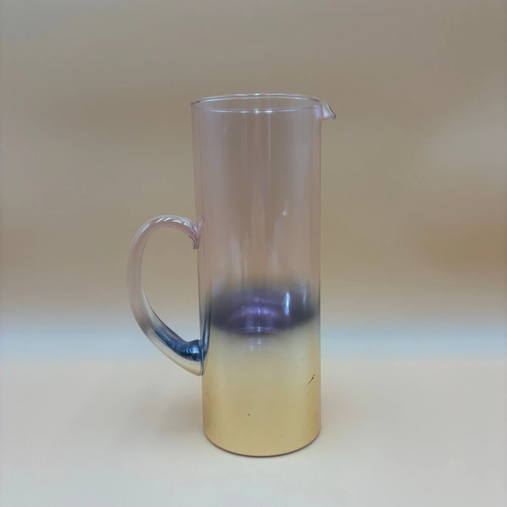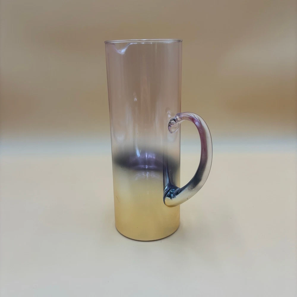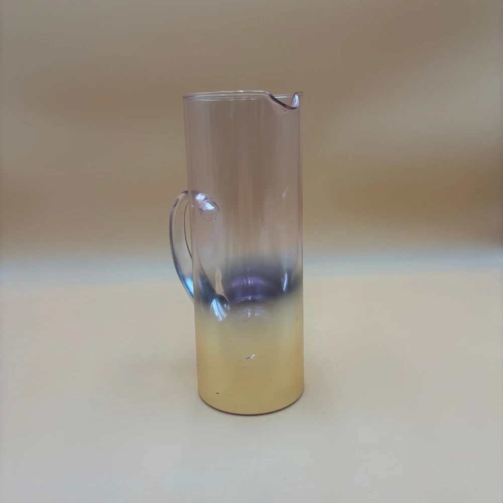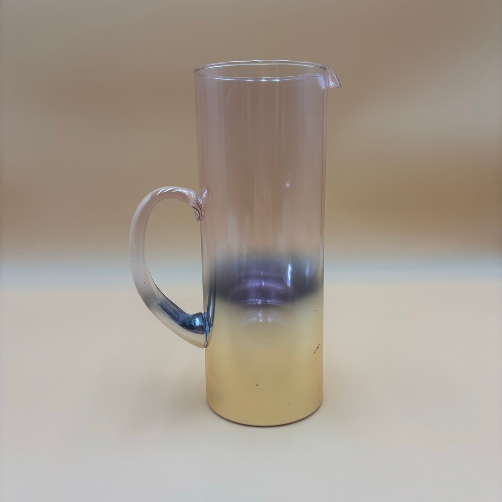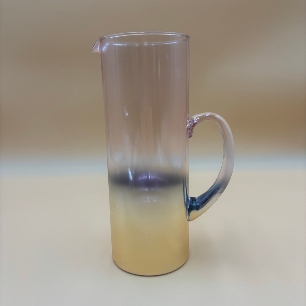✏️ DETAILS Tall, cylindrical glass pitcher with a dreamy ombre fade from soft amethyst at the rim to golden amber at the base. Curved handle echoes the color shift. Partial bottom sticker reads “Debi Lily Design – Golden Rose Collection” (sold in floral departments). Stunning for craft cocktails or repurposed as a vase—its iridescent tones beautifully frame fresh or dried flowers. 📏 MEASUREMENTS • Height: 10.5 in • Rim diameter: 4.25 in • Width, handle-to-spout: ~6 in ✨ CONDITION Good vintage condition. Please ask any questions before purchasing. • Light surface scratches and scattered tone wear near lower half • Small scuff on handle and minor production bubbles typical of vintage glass 🚛 SHIPPING & RETURNS Free shipping via USPS Ground Advantage with tracking. Orders ship within two business days. Returns accepted; buyer pays return shipping unless item is misrepresented. Lifestyle photos are for inspiration only — check all photos for item condition. Thank you for visiting Vintage 2 Trendy!