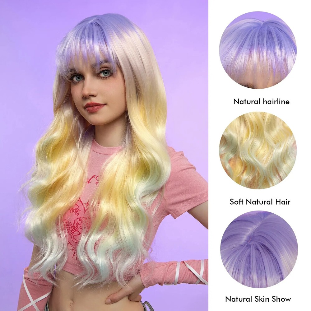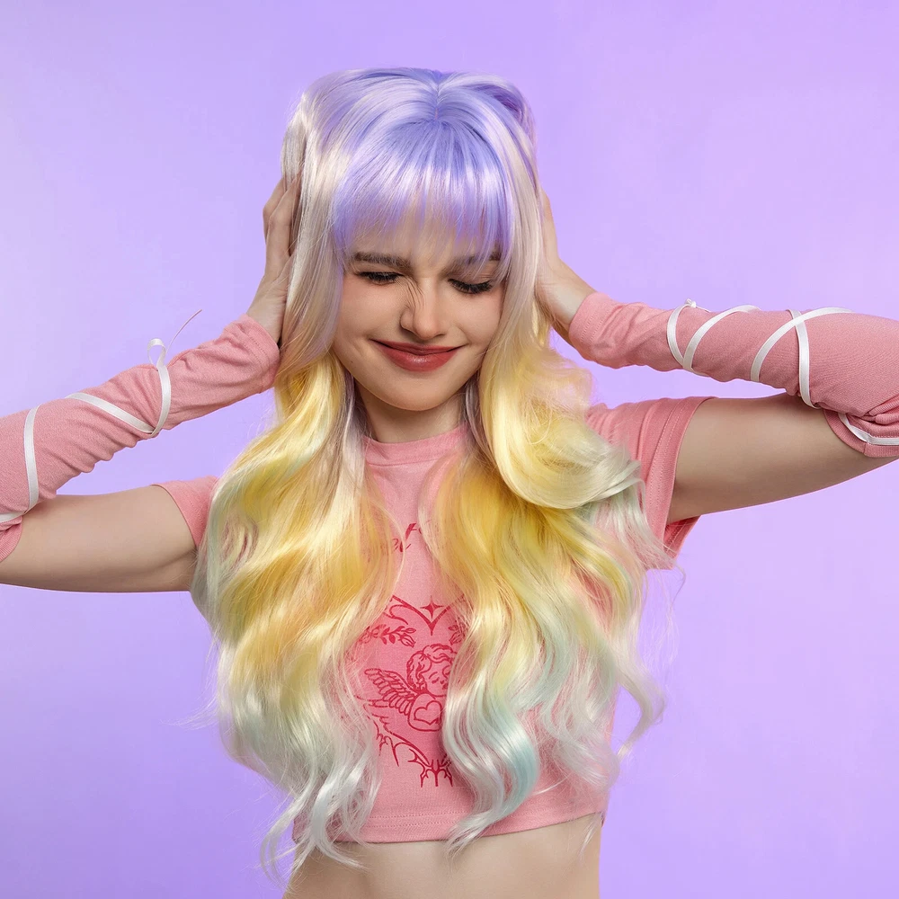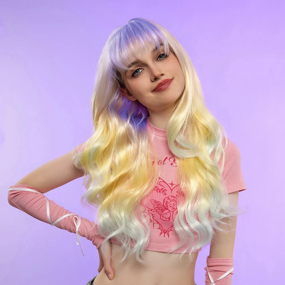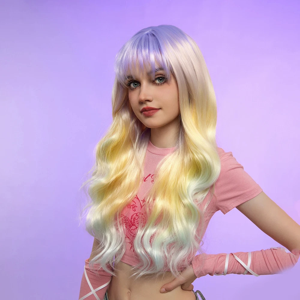 • High Temperature Fiber : Made with high temperature fiber, this wig can withstand heat styling tools and maintain its shape and texture. • Wavy Texture : The wavy texture of this wig adds volume and movement to your hair, giving you a natural and effortless look. • Ombre Purple to Gold Mixed Green Color : The unique ombre purple to gold mixed green color of this wig adds a pop of color to your look, making you stand out from the crowd. • Can Be Permed : This wig can be permed to suit your desired style, allowing you to experiment with different looks without damaging your natural hair. [Length]: 26 Inches [Unique Style]: Ombre Purple to Gold Mixed Green Color Wig Hair with Bangs [Premium Material]:Heat Resistant Fiber. we use the imported synthetic fiber to make sure our products in high quality as well,which is soft and natural looking.What's more it's allowed to trim it according to your style.The maximum temperature cannot over 180 degrees when using curling irons [Various Wearing Occasion]:It can be used all year round, whether for costume cosplay, Halloween, fashion, theme parties, wedding, dating ,daily wear, parties &fashion show and any other occasions. 【Cap】: Breathable rose net, it will make you feel comfortable when you wear it. 【Size】: Wig cap size:22 inch (It is ok for Head size from 21 inch to 23 inch )Can use hair curler to straighten or curling hair,but the temperature should below 150 degrees Celsius [Features:1.] Natural looking wigs can be use longer than one year. Basic silk cap Basic silk cap is a machine-made wefted cap construction with a skin top parting or a round part on the crown, for a more realistic-looking part. It is the most durable and affordable wig caps. A weft is a curtain of hair sewn onto the cap. The hair on these caps are pre-teased at the root to mask the cap beneath, which often gives the hair natural volume at the crown. This lightweight cap has spaces between the wefts to allow for ventilation and to keep your scalp cool. The reduction of the hand-sewn part means a reduction in the cost, making Esin basic cap wigs an affordable and quality piece. Noted: Due to our constantly updated techno, the appearance of the inner cap mesh might look differently. Wig wear 1:Place fishnet wig liner around neck 2:Coil up your hair 3:Bring wig liner up and over hair,secure in back by tying ends 4:apply your wig,adjust placement and style as desired NOTICES 1. Can be trimmed 2. Natural drying 3. Can comb it 4. Can be curled or straightened not over 150 ℃