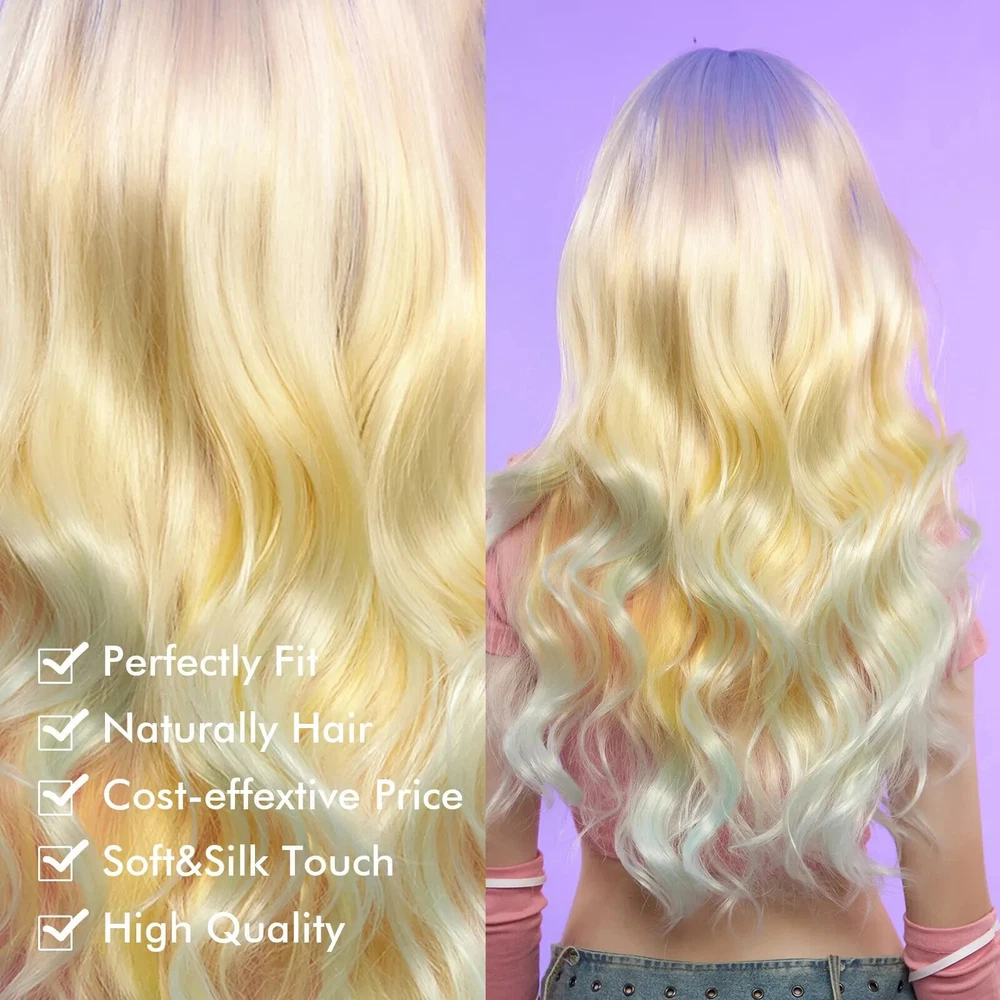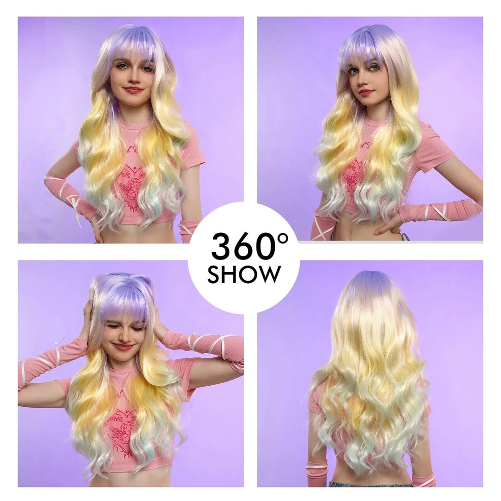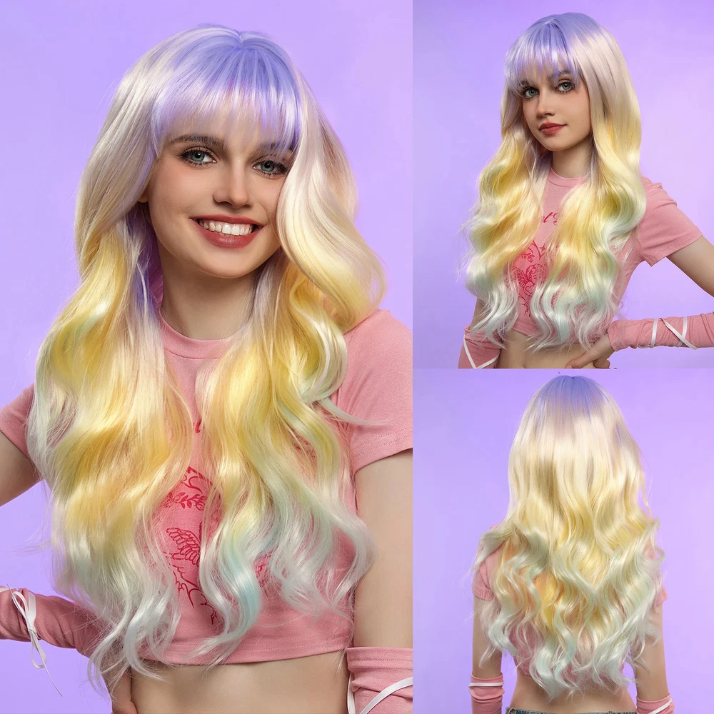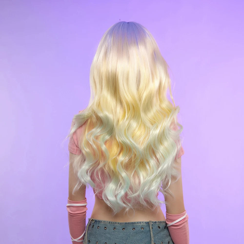 • High Temperature Fiber : Made with high temperature fiber, this wig can withstand heat styling tools and maintain its shape and texture. • Wavy Texture : The wavy texture of this wig adds volume and movement to your hair, giving you a natural and effortless look. • Ombre Purple to Gold Mixed Green Color : The unique ombre purple to gold mixed green color of this wig adds a pop of color to your look, making you stand out from the crowd. • Can Be Permed : This wig can be permed to suit your desired style, allowing you to experiment with different looks without damaging your natural hair. [Length]: 26 Inches [Unique Style]: Ombre Purple to Gold Mixed Green Color Wig Hair with Bangs [Premium Material]:Heat Resistant Fiber. we use the imported synthetic fiber to make sure our products in high quality as well,which is soft and natural looking.What's more it's allowed to trim it according to your style.The maximum temperature cannot over 180 degrees when using curling irons [Various Wearing Occasion]:It can be used all year round, whether for costume cosplay, Halloween, fashion, theme parties, wedding, dating ,daily wear, parties &fashion show and any other occasions. 【Cap】: Breathable rose net, it will make you feel comfortable when you wear it. 【Size】: Wig cap size:22 inch (It is ok for Head size from 21 inch to 23 inch )Can use hair curler to straighten or curling hair,but the temperature should below 150 degrees Celsius [Features:1.] Natural looking wigs can be use longer than one year. Basic silk cap Basic silk cap is a machine-made wefted cap construction with a skin top parting or a round part on the crown, for a more realistic-looking part. It is the most durable and affordable wig caps. A weft is a curtain of hair sewn onto the cap. The hair on these caps are pre-teased at the root to mask the cap beneath, which often gives the hair natural volume at the crown. This lightweight cap has spaces between the wefts to allow for ventilation and to keep your scalp cool. The reduction of the hand-sewn part means a reduction in the cost, making Esin basic cap wigs an affordable and quality piece. Noted: Due to our constantly updated techno, the appearance of the inner cap mesh might look differently. Wig wear 1:Place fishnet wig liner around neck 2:Coil up your hair 3:Bring wig liner up and over hair,secure in back by tying ends 4:apply your wig,adjust placement and style as desired NOTICES 1. Can be trimmed 2. Natural drying 3. Can comb it 4. Can be curled or straightened not over 150 ℃
