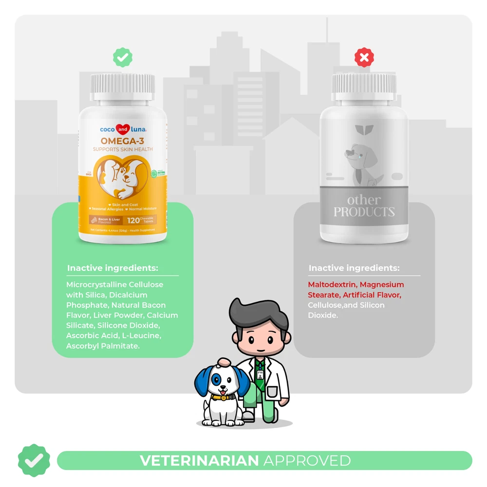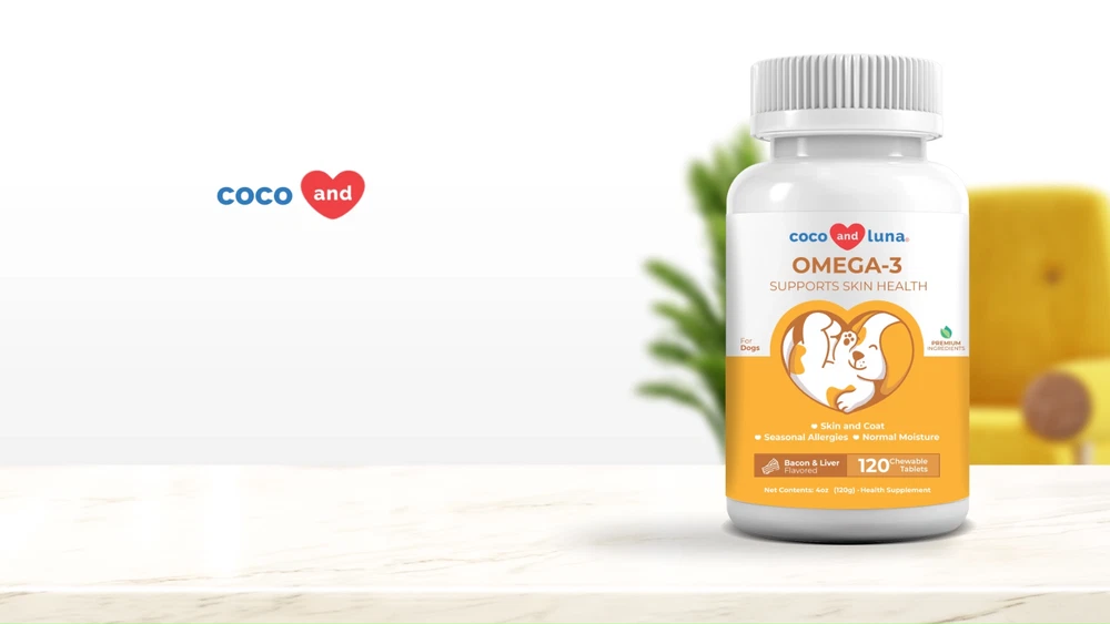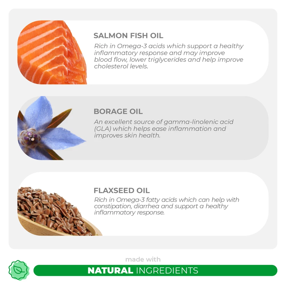 Relieve Itching – Our Coco and Luna Omega-3 for Dogs supplement is an incredible source of fish oil for your furry loved one! Our formula will help relieve your dog’s dry and itchy skin and also contains Vitamin E, a powerful antioxidant that supports and boosts your dog’s immune system. Help with Shedding - Is your dog shedding excessively? Help him look and feel great again with our tasty, chewable, and affordable Omega 3 treats. Our healthy chews contain no synthetic colors or preservatives. Our formula provides a holistic nutritional boost for both small and large breeds of all ages. Health Support - Our product is the only great-tasting dog supplement that treats coat conditions, itchy or flaky skin, and hot spots, while protecting your dog's heart and immune system. If your dog has been feeding off processed pet foods, it couldn’t hurt to put them on a of DHA and EPA fatty acids supplement to ensure their skin is as healthy as possible. Borage Oil Borage oil is an excellent source of gamma-linolenic acid (GLA). Has anti-inflammatory properties. Recommended in the natural treatment of arthritis. Improves overall skin health. Salmon Fish Oil Rich in Omega-3 fatty acids. Has anti-inflammatory properties. Promotes healthy skin and eyes. Promote brain health. May lower triglycerides and improve cholesterol levels. Flaxseed Oil May improve blood flow. Rich in Omega-3 fatty acids. Could benefit heart health. Improves skin health. May help treat constipation and diarrhea. May reduce inflammation. Coco and Luna omega 3 for dogs with salmon oil, provides essential fatty acids for a healthy coat and skin. It is an effective anti-shedding product for dogs, promoting a shiny, healthy coat. Our skin and coat support chews for dogs are enriched with Omega 3, 6, and 9 to support joint, cardiovascular, and immune health. It's also an effective dandruff treatment for dogs, reducing scratching and irritation. With omega 3 fish oil for dogs, your furry friend can benefit from reduced shedding and improved skin and coat health. Our Omega 3 for Dogs product is an excellent source of essential fatty acids, promoting overall wellness and it's a natural solution to stop shedding in dogs and promote a shiny, healthy coat. Nourish your dog's skin and coat with our Omega 3 for Dogs chewable tablets. These chews are packed with essential fatty acids and enriched with Salmon oil, providing a range of benefits for dogs' skin and coat. It's an effective and natural solution for promoting overall wellness and reducing shedding. Made in the USA from US and Globally Sourced Ingredients - All our supplements are made in the USA and are veterinarian approved as well as hypoallergenic. Use our Omega 3 fish oil for dogs skin and coat as a dog skin soother and overall coat health.