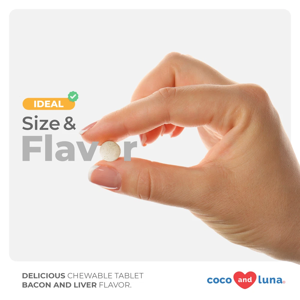 Purpose: Skin & Coat Care Flavor: Bacon and Liver Life Stage: All Dog Brand: Coco and Luna Dog Breed: All Dog Dog Size: All Dog Formulation: Tablet Country/Region of Manufacture: United States