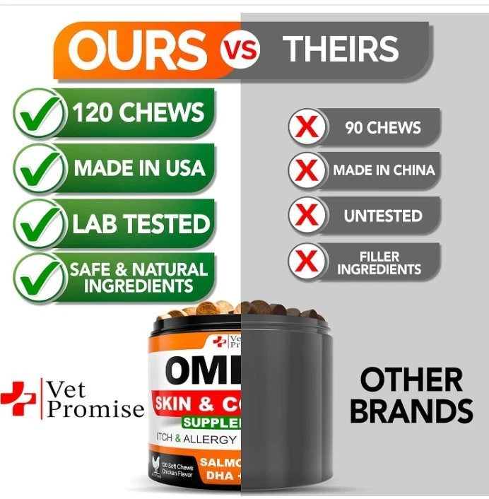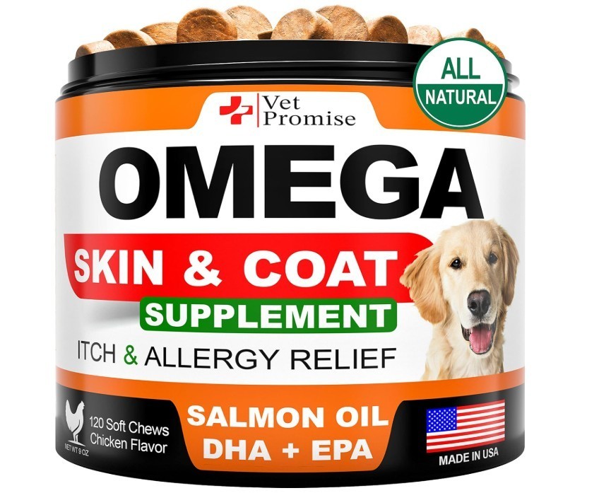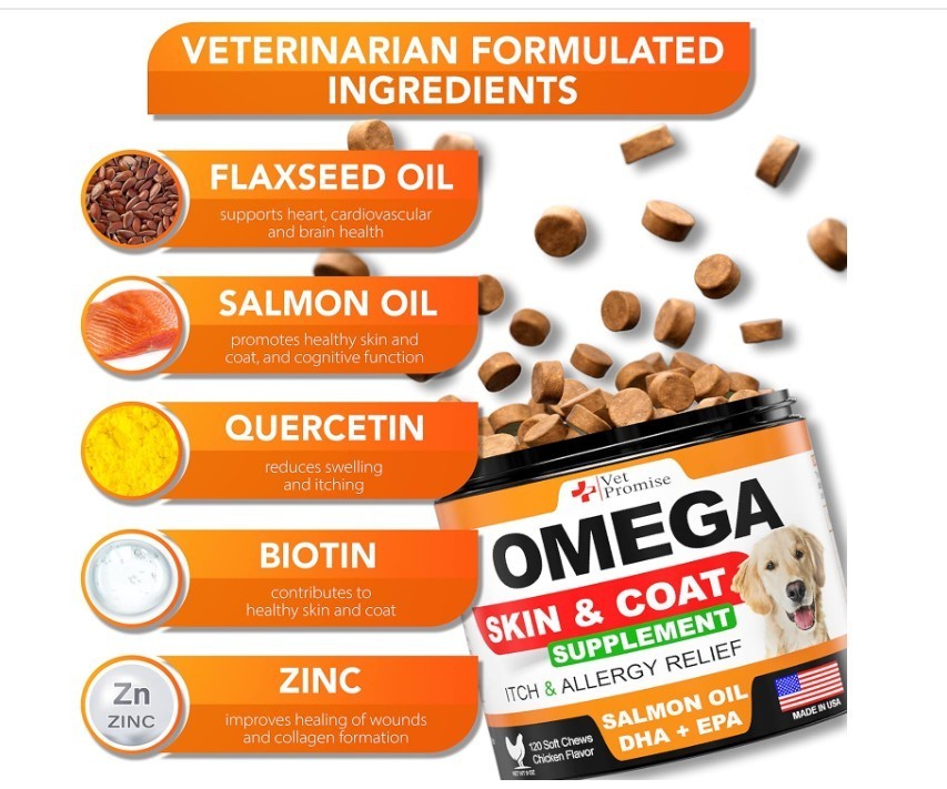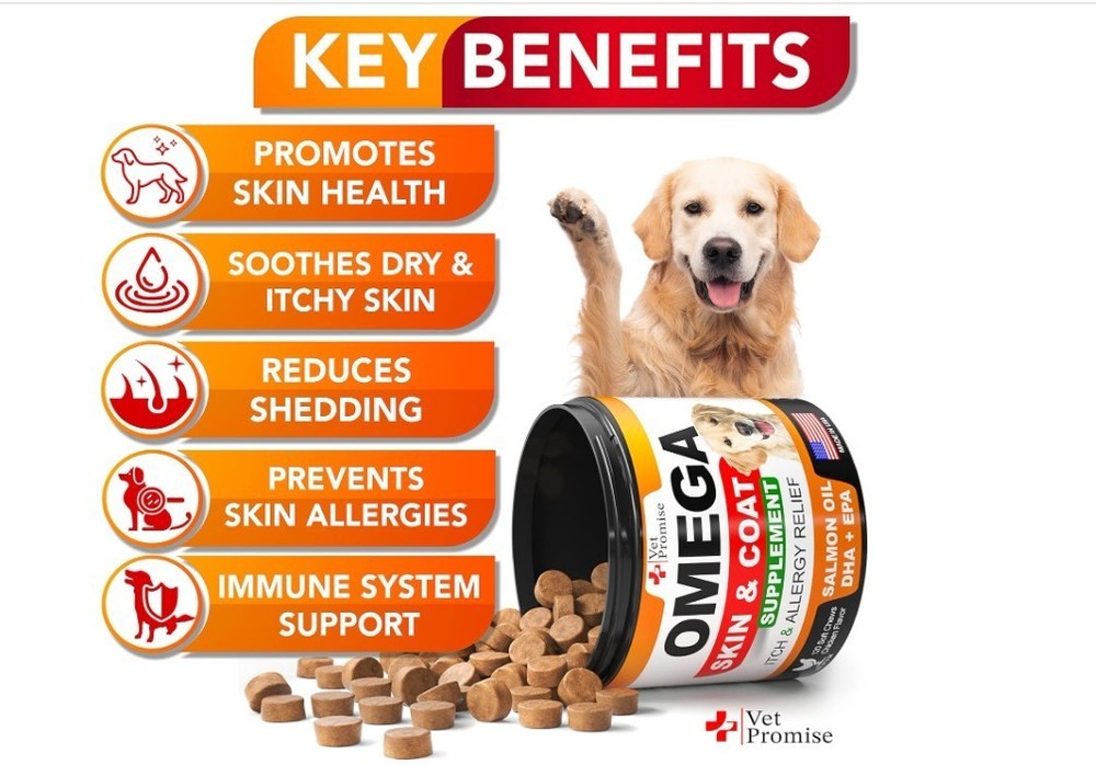Omega 3 for Dogs Skin and Coat Supplement Fish Oil Chews Allergy and Relief About this item Skin & Coat Supplement for Dogs: Our dog fish oil supplements are an effective way to support your dog's health, with a nutrient-dense formula that includes premium fish oil for dogs Healthy Skin & Shiny Coat: Achieve a healthy skin and shiny coat with our dog omega 3 supplement. It provides essential vitamins and fatty acids that promote soft, shiny, and healthy coats and skin. Itch & Allergy Relief: Our dog shedding supplement is designed to relieve allergies in dogs. It effectively tackles hot spots, dry itchy skin, irritation, providing relief & comfort for your dog Premium Natural Ingredients Give Results: No Added Sugar, Wheat, Corn, Gmo, Preservatives. We are committed to using only best ingredients that deliver results in our fish oil for dogs skin and coat Made in The U.S.A, Vet Formulated: Our dog vitamins for skin and coat allergies are made in the USA and formulated by Vets in an FDA-registered facility that meets the highest quality standards