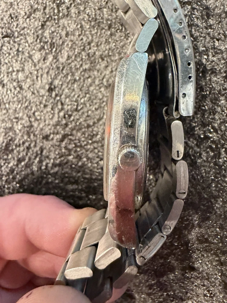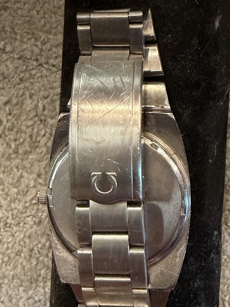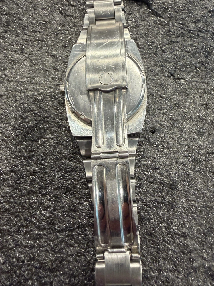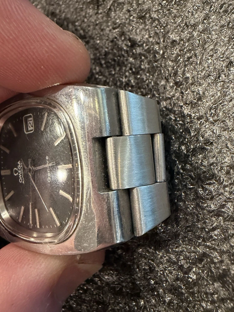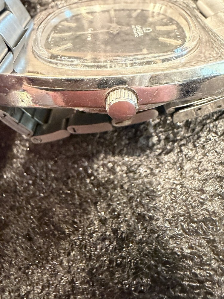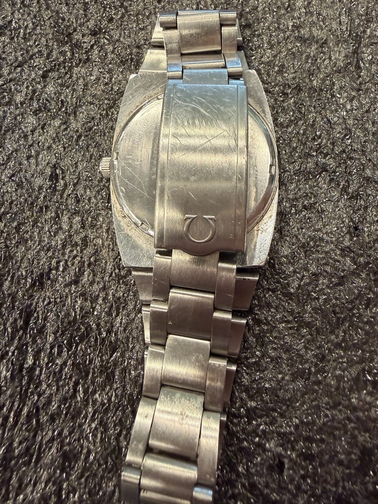 The Omega Geneve Automatic Date 36mm Black Dial 1970's Men's Watch is a vintage timepiece with a classic design featuring a stainless steel case and baton indexes. The watch has a smooth silver bezel and a black dial, giving it a timeless and elegant look. With its mechanical automatic movement and 36mm case size, this Omega watch is perfect for any occasion and is sure to add a touch of sophistication to any outfit. The stainless steel bracelet band adds durability and style to this iconic timepiece. Extra link on band extends fit up to 8 1/4 inch wrist. ( link is already added )