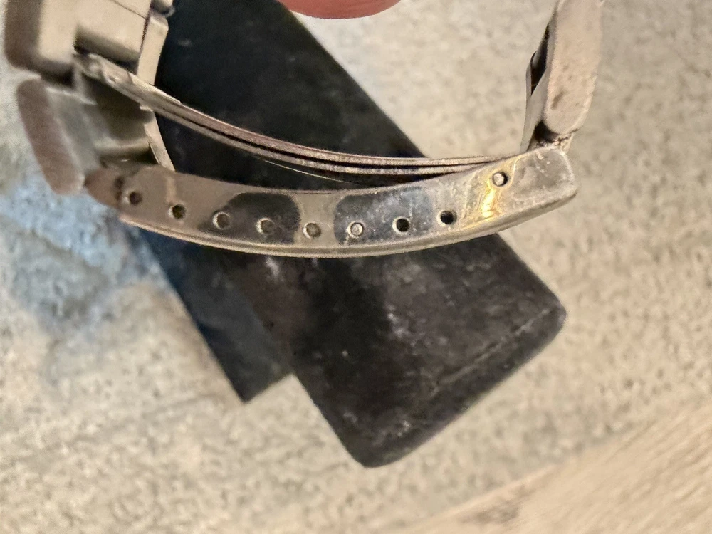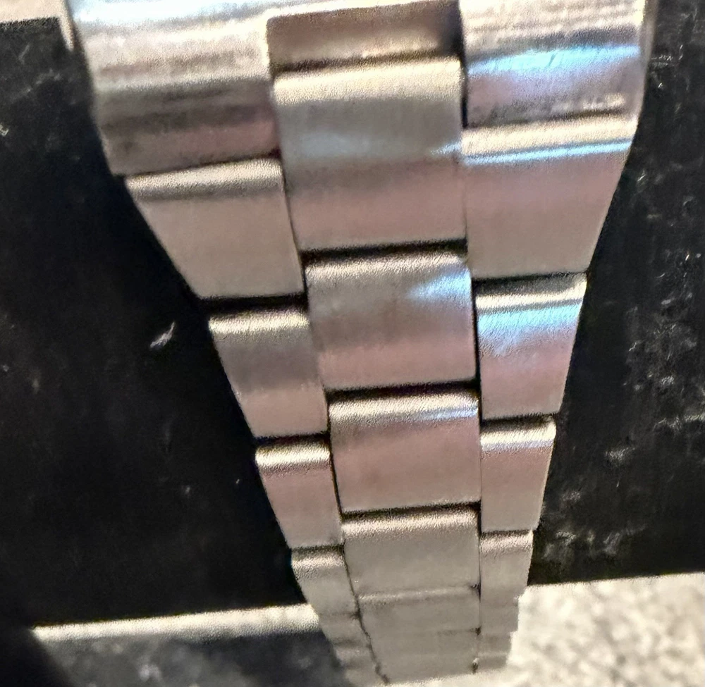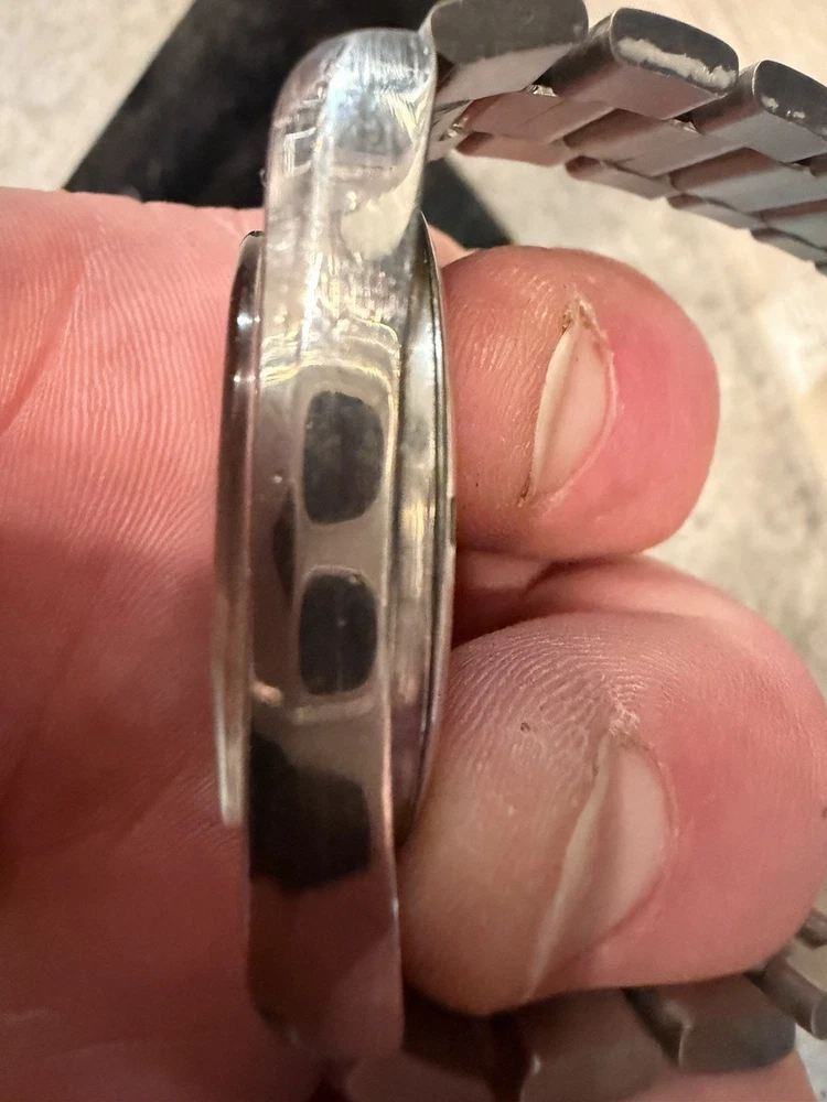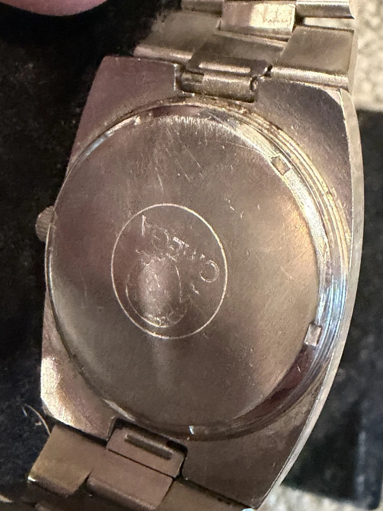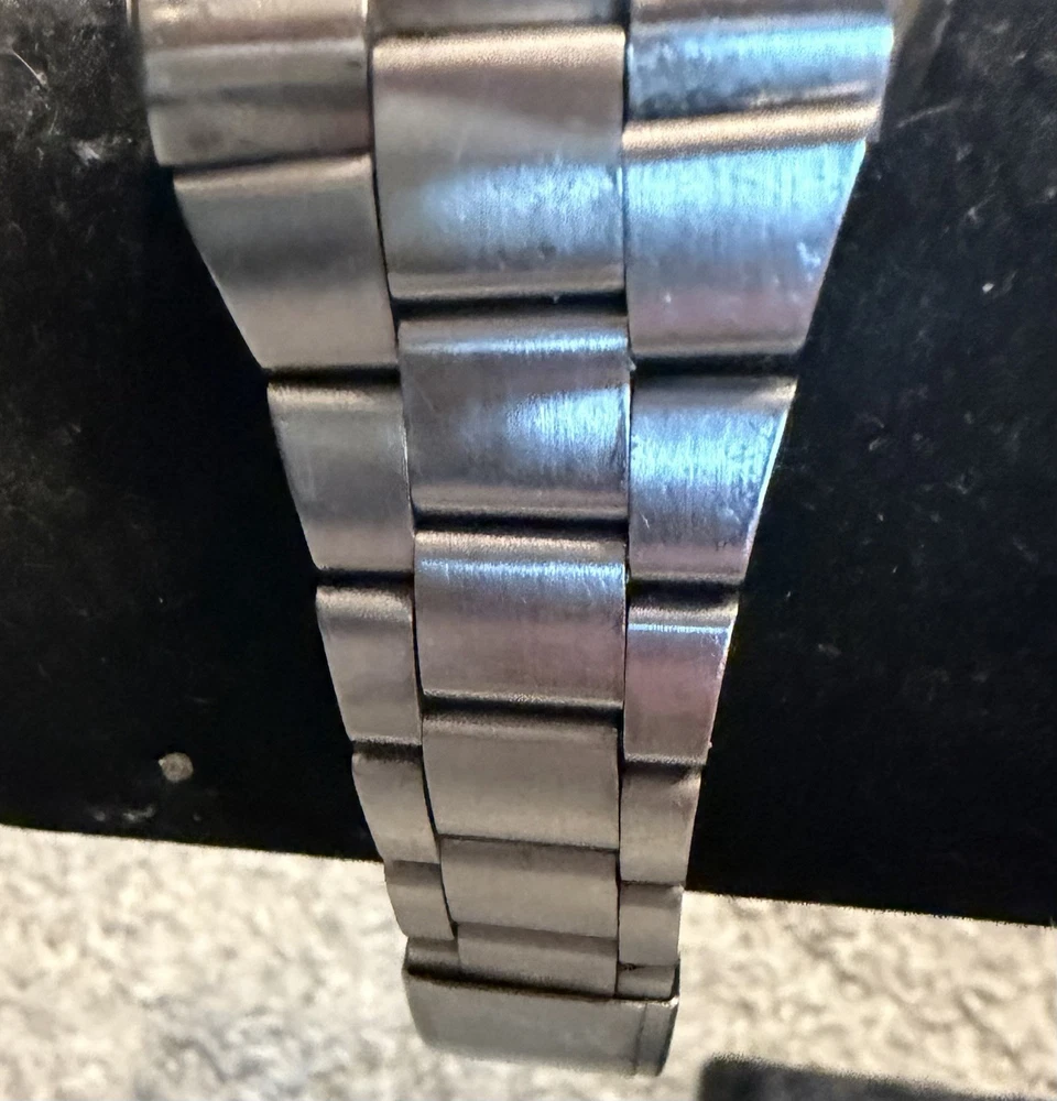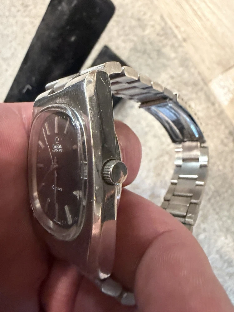 The Omega Geneve Automatic Date 36mm Black Dial 1970's Men's Watch is a vintage timepiece with a classic design featuring a stainless steel case and baton indexes. The watch has a smooth silver bezel and a black dial, giving it a timeless and elegant look. With its mechanical automatic movement and 36mm case size, this Omega watch is perfect for any occasion and is sure to add a touch of sophistication to any outfit. The stainless steel bracelet band adds durability and style to this iconic timepiece. Extra link on band extends fit up to 8 1/4 inch wrist. ( link is already added )