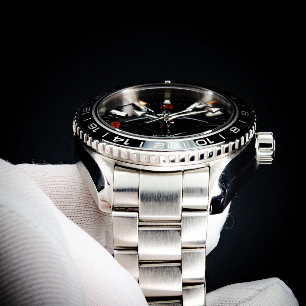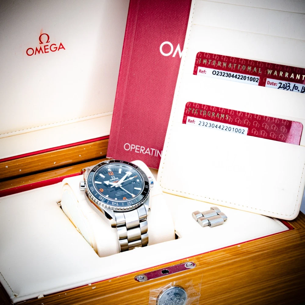 For sale is an Omega Seamaster Planet Ocean 232.30.44.22.01.002, a 43.5mm GMT dive watch in excellent condition (9.3/10). What's Included ✅ Original Omega inner and outer boxes ✅ Warranty card (dated 2015) ✅ Complete manuals and documentation Specifications Case Size : 43.5mm stainless steel with scratch-resistant sapphire crystal Movement : Omega Co-Axial Calibre 8605, automatic chronometer with GMT function Power Reserve : 60 hours Water Resistance : 600m (2000 feet) Bezel : Polished black ceramic bi-directional with 24-hour GMT scale Strap : Stainless steel bracelet with patented extendable foldover clasp Dial : Lacquered black with Arabic numerals, trapezoidal hour markers, and Super-LumiNova 💯 100% authentic — buy with confidence 📦 Fast, insured shipping from Dallas, TX. 📲 Contact us for a video walk-through or additional details.