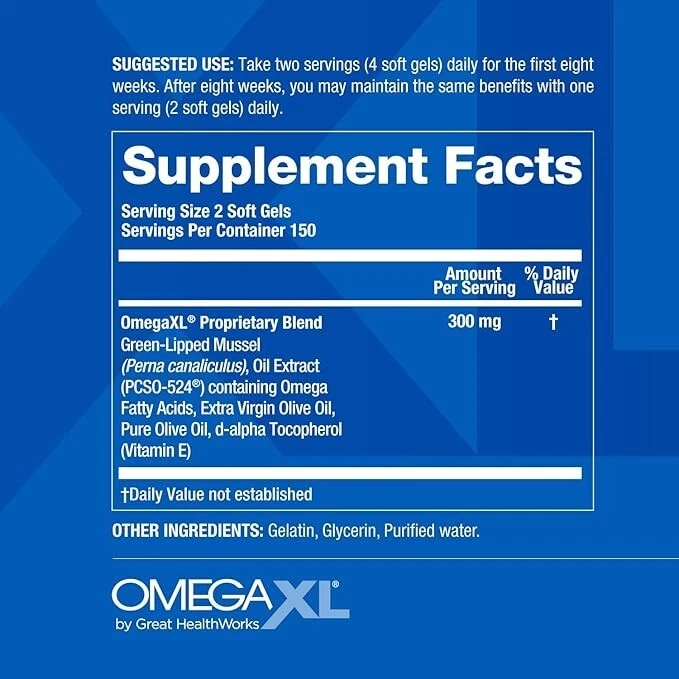Flavor Unflavored Unit Count 300 Count Item Form Softgel Item Weight 5 Ounces Item dimensions L x W x H 1.5 x 2 x 4.5 inches Diet Type Gluten Free Product Benefits Muscle Therapy Age Range (Description) Adult Package Information Canister About this item XL BENEFITS BEYOND OMEGA-3s - The ultimate joint health and mobility support supplement. OmegaXL goes beyond standard omega-3 supplements that mainly contain just EPA and DHA. It is a concentrated source of green-lipped mussel oil packed with a powerful combination of healthy fatty acids and lipid mediators. Backed by over 40 years of clinical research, this high-potency blend promotes joint, muscle, immune and respiratory health. THE ALPHA OF OMEGAS - Our one-of-a-kind proprietary formula helps to relieve occasional exercise-related joint and muscle soreness by providing omega-3 fatty acids in a more absorbable free fatty acid form than standard fish oils. Don’t let minor aches hold you back from living a healthy active life. OmegaXL is a drug-free, natural dietary supplement that when taken daily, has been shown to promote joint health and improved mobility. MORE THAN A FISH OIL - OmegaXL contains the oil extract from green-lipped mussels, not fish. The green-lipped mussels are exclusively sourced from and sustainably farmed in the pristine water of New Zealand. The oil extract contains over 30 free fatty acids, including EPA and DHA. GET THE BENEFITS, WITHOUT THE FISHY AFTERTASTE - OmegaXL is provided in a convenient, small and easy-to-swallow soft gel with no fishy aftertaste or burps. This product is free of gluten, allergenic levels of shellfish protein, artificial ingredients, milk, yeast, and corn. COMMITTED TO WELLNESS - Founded in 2003 Great HealthWorks is dedicated to delivering quality health and wellness products to our consumers. Our mission is to make meaningful differences in peoples lives by offering natural, science-based solutions. TIP: During the summer or in warmer climates, keep your supplements in the refrigerator or a cool, dry place to maintain their original soft gel form.